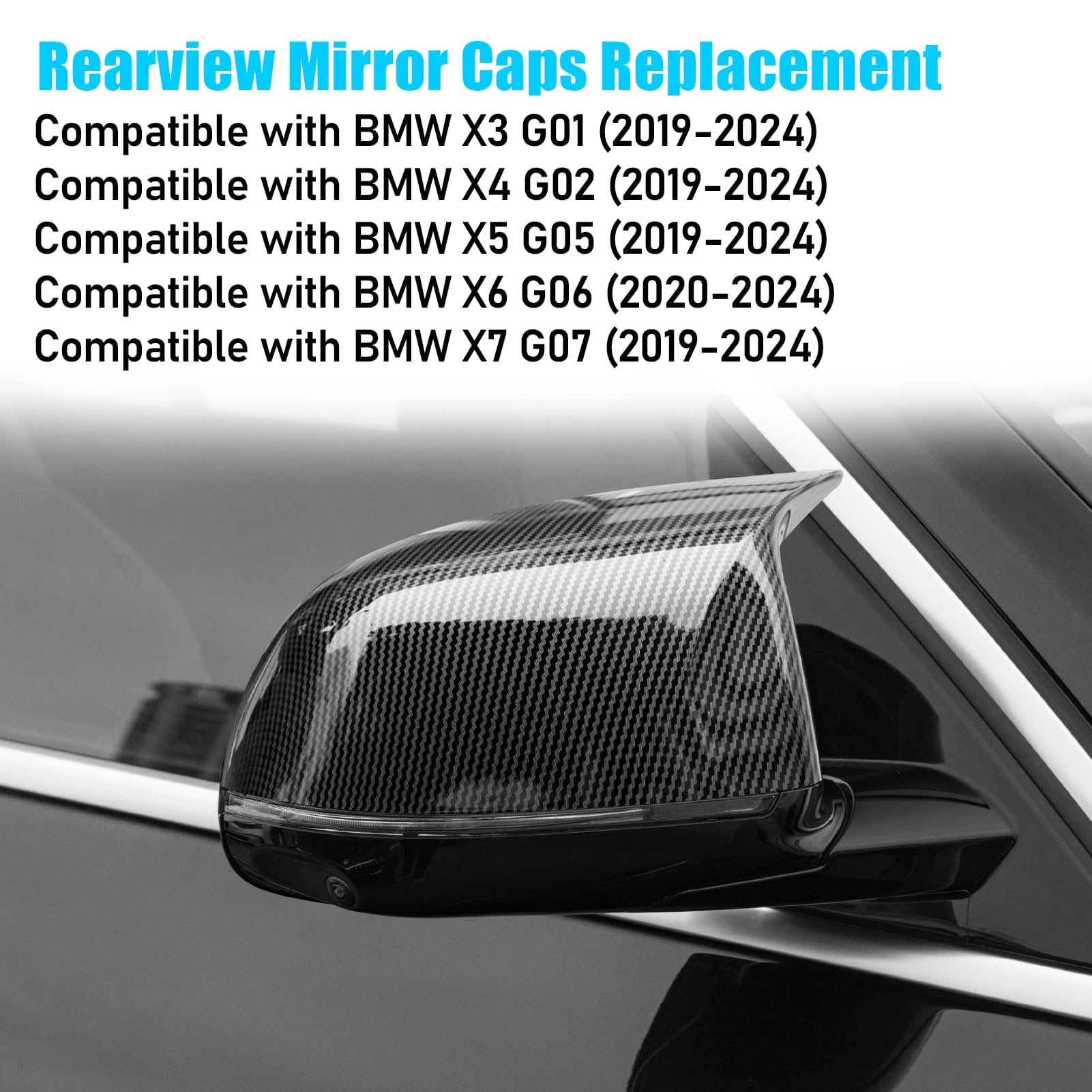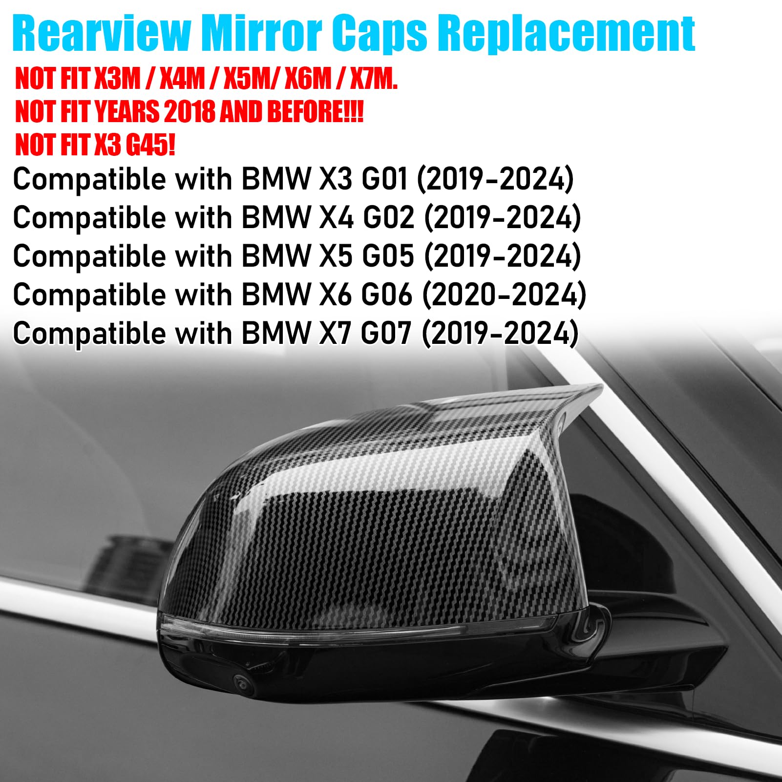 Fitment: Our M-style Rear View Mirror Cover is designed to compatible with BMW X3 G01 (2019-2024), X4 G02 (2019-2024), X5 G05 (2019-2024), X6 G06 (2020-2024), X7 G07 (2019-2024), and it's perfect fit and secured on tight. Seamless Replacement for for 51168496623 51168496624. NOT FIT X3M / X4M / X5M/ X6M / X7M. NOT FIT YEARS 2018 AND BEFORE!!! NOT FIT X3 G45!