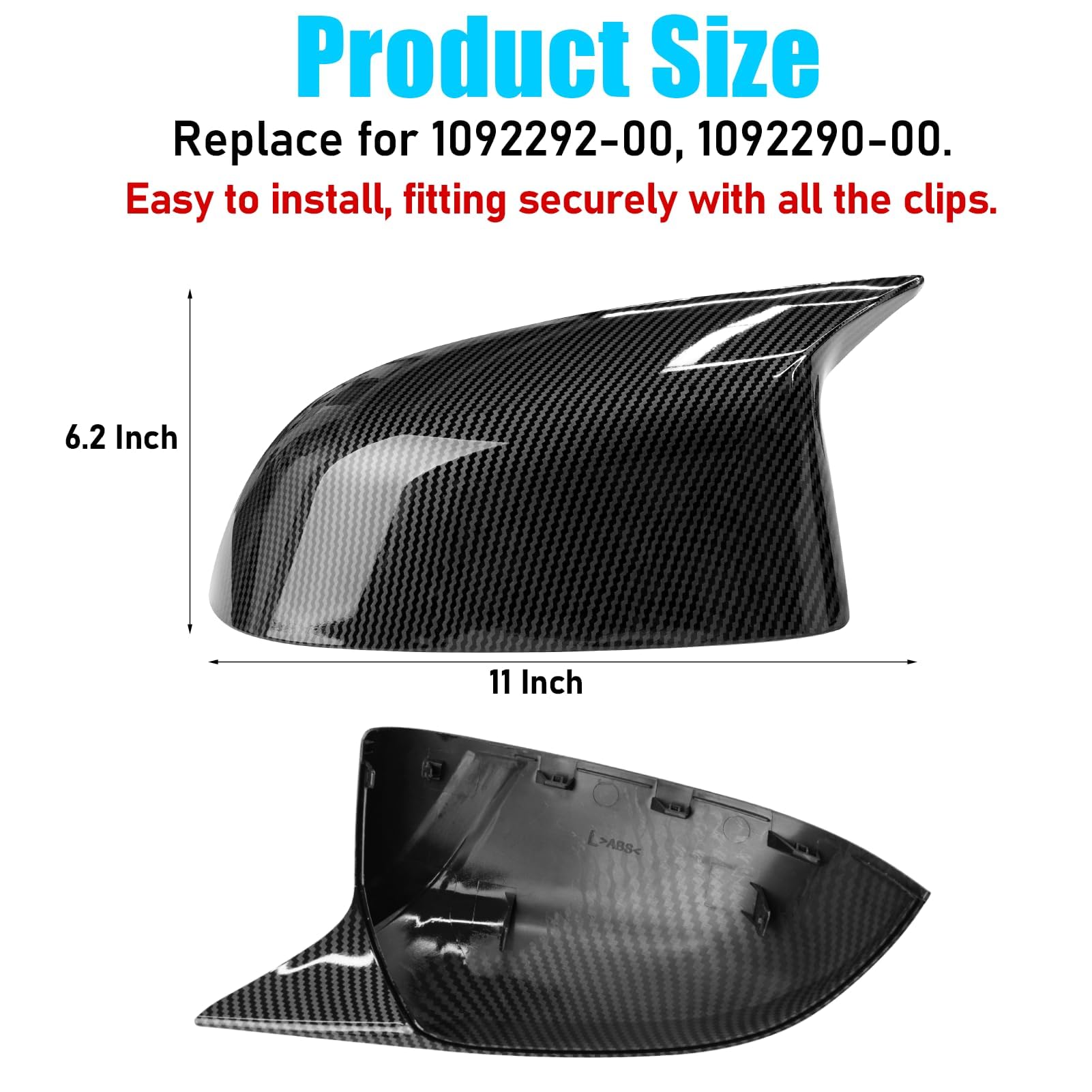 Easy to Install: These Side View Mirror Cap clips are consistent on the OEM caps and are in exact alignment for easy installation. Just popped off the old mirror covers from the bottom back without even having to remove the mirror glass. Transform your car's look in just 5 minutes.