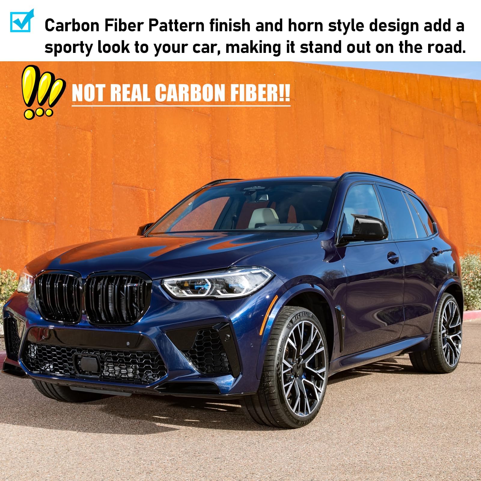 Stylish & Sporty Design: The Rearview Mirror Cap gives the car a new sporty look. Nice Carbon Fiber Pattern finish and Horn Style design that really compliments the vehicle. NOT REAL CARBON FIBER!! Elevate your vehicle's exterior style and make a statement on the road with these eye-catching side mirror accessories. Upgrade your ride today!