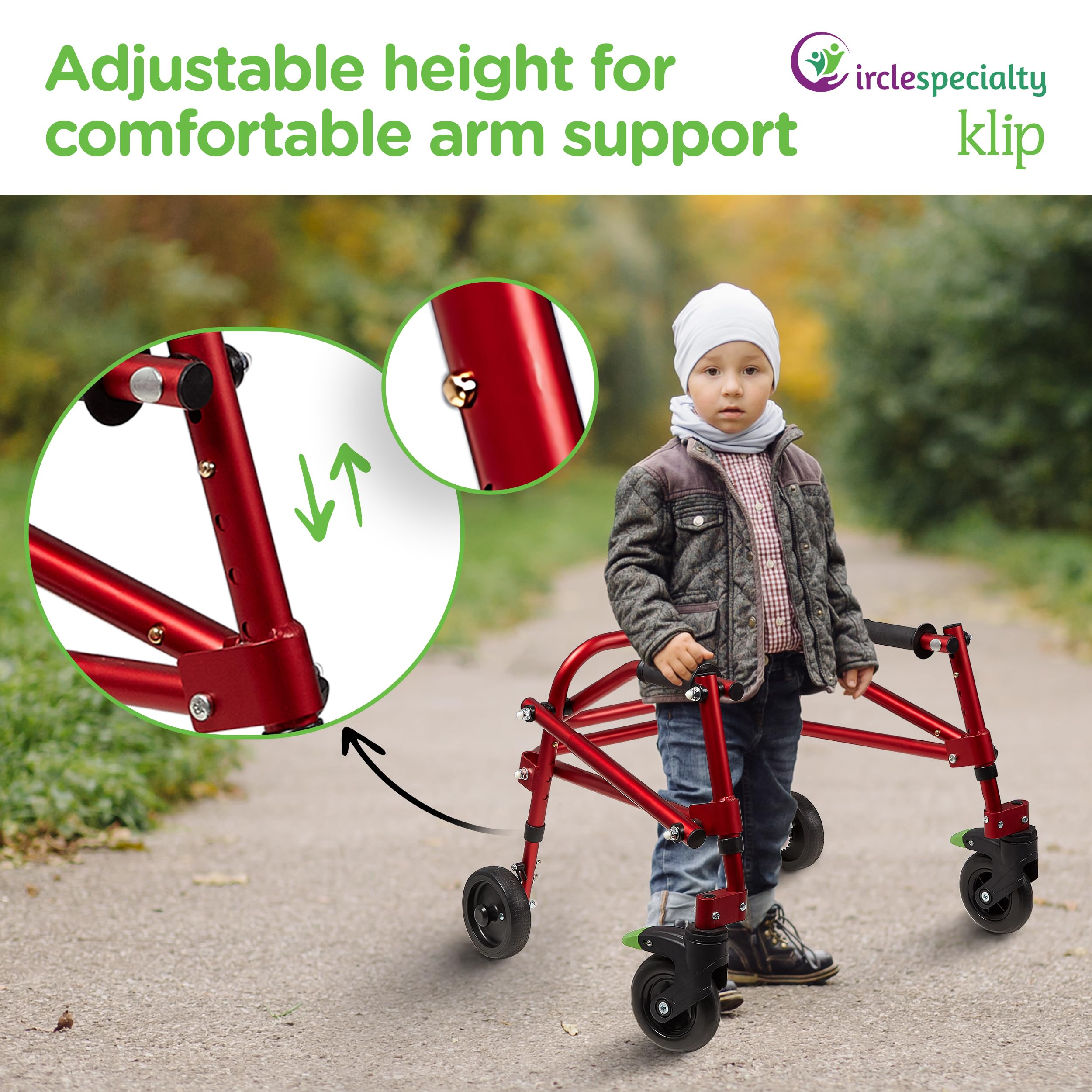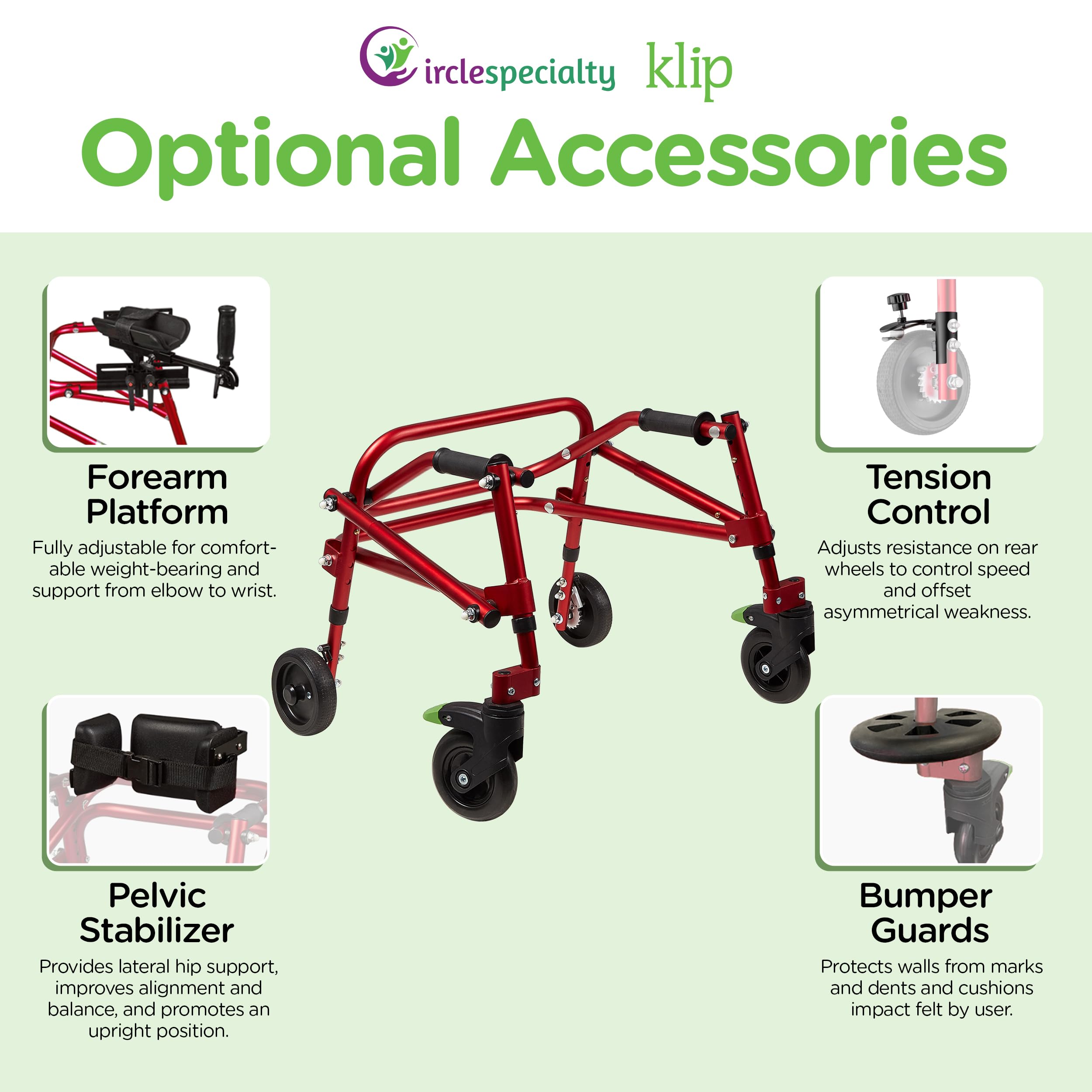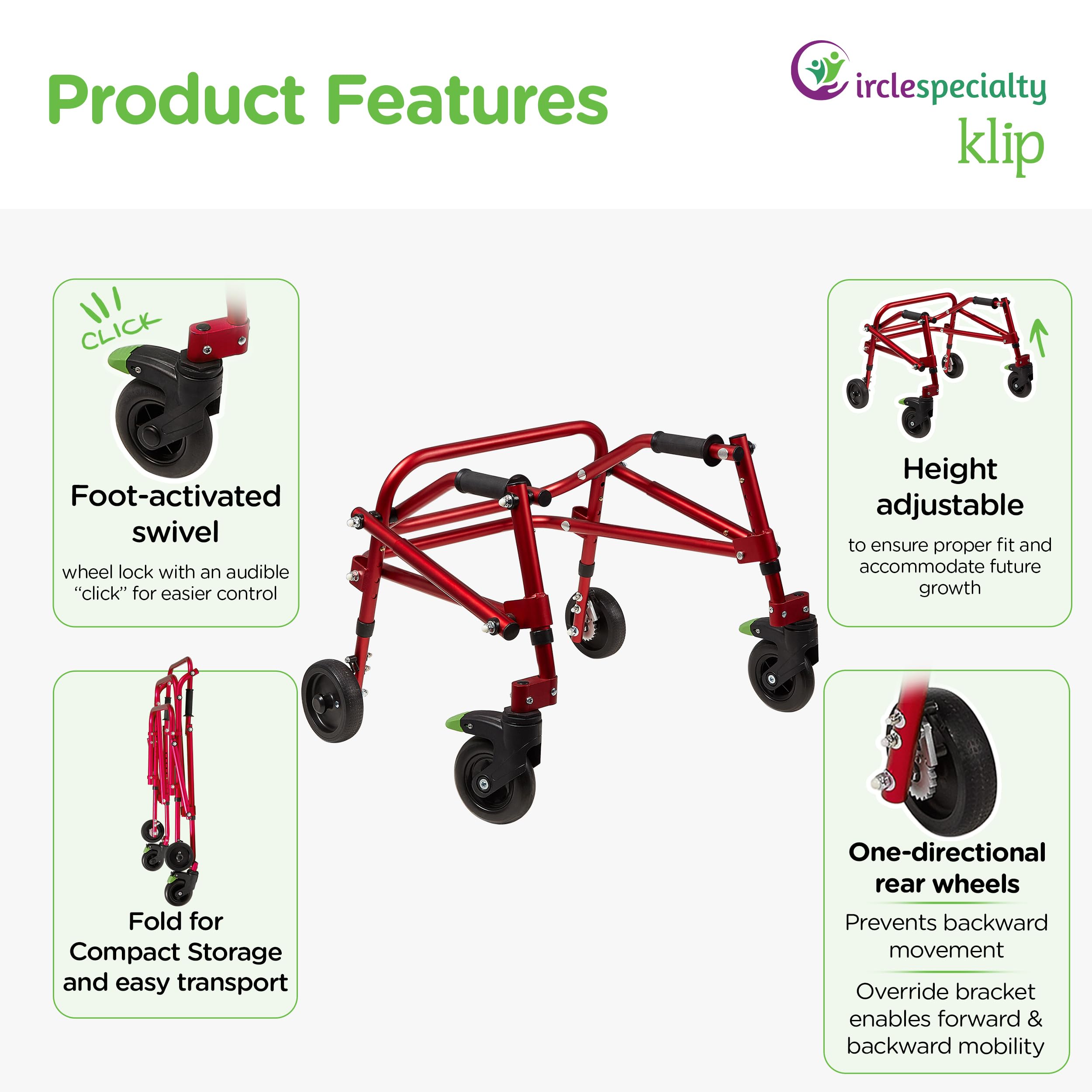 4-Wheel Posterior Walker/Lightweight Rollator Walker by Circle Specialty Circle Specialty is a company with over 25 years of experience in medical rehabilitation equipment and our mission is to keep kids, teens and their families on the go by covering their full spectrum of needs. We strive to deliver products with a high-impact factor that improves your quality of life, and our posterior walkers, serve that exact purpose. Introducing the 4-Wheel Posterior Walker/Gait Trainer that Features: ✅ Height adjustable to ensure proper fit and accommodate future growth ✅ Foot-Activated swivel wheel lock with an audible “click” for easier control ✅ On/off one-directional rear wheels prevents walker from rolling backwards. ✅ Latex-free handgrips with flanged ends reduce strain on user’s hands ✅ Folds easily for compact storage and transport ✅ Available in 4 sizes More Freedom, More Mobility, More Dependability From the aluminum frame to all the little quality-of-life details of our designs, our medical walker was created to keep toddlers, kids, teens and young adults moving & enjoying life. Optional Accessories As a company, Circle Specialty strives to deliver professional rehabilitation equipment that cater to your exact needs, and make the transition from gait trainers to walkers effortless as the user improves their ability. Optional Accessories include: ✅ Height and depth adjustable forearm platforms with multi-adjustable handgrips ✅ Width and height adjustable pelvic stabilizer with a support belt ✅ Bumper Guards & Speed tension control on rear wheels Fully Backed by our 3-Year Warranty Click “Add to cart"