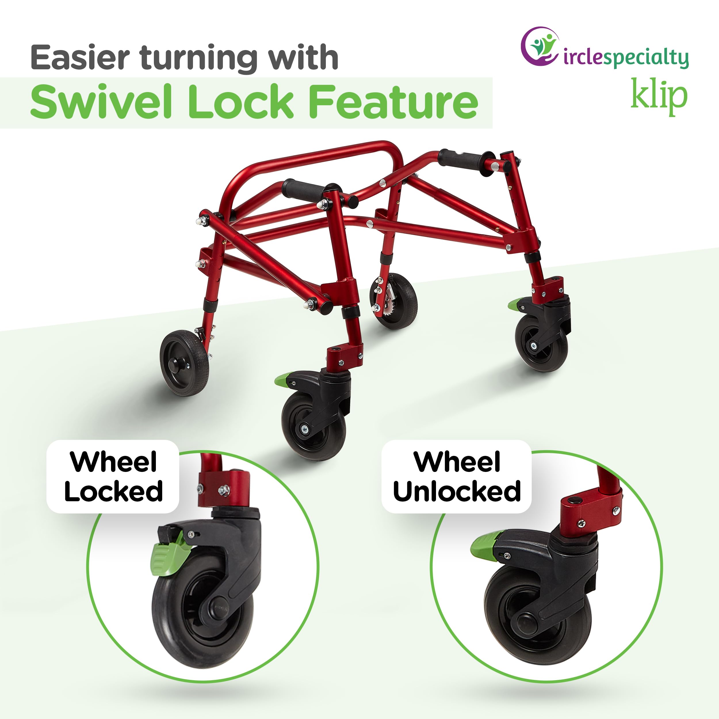 PRACTICAL, DEPENDABLE & COOL LOOKING- The 4-Wheeled, Foldable Klip Walker/Gait Trainer is equipped with two 5” Front Swivel Wheels that allow for easier turning, and two 5” On/ Off, One-Directional Rear Wheels that prevent backwards rolling. Additionally, there’s an easy-to-engage/disengage, foot-activated swivel wheel lock that switches the wheel from swivel to non-swivel with an audible click, for greater control & safet