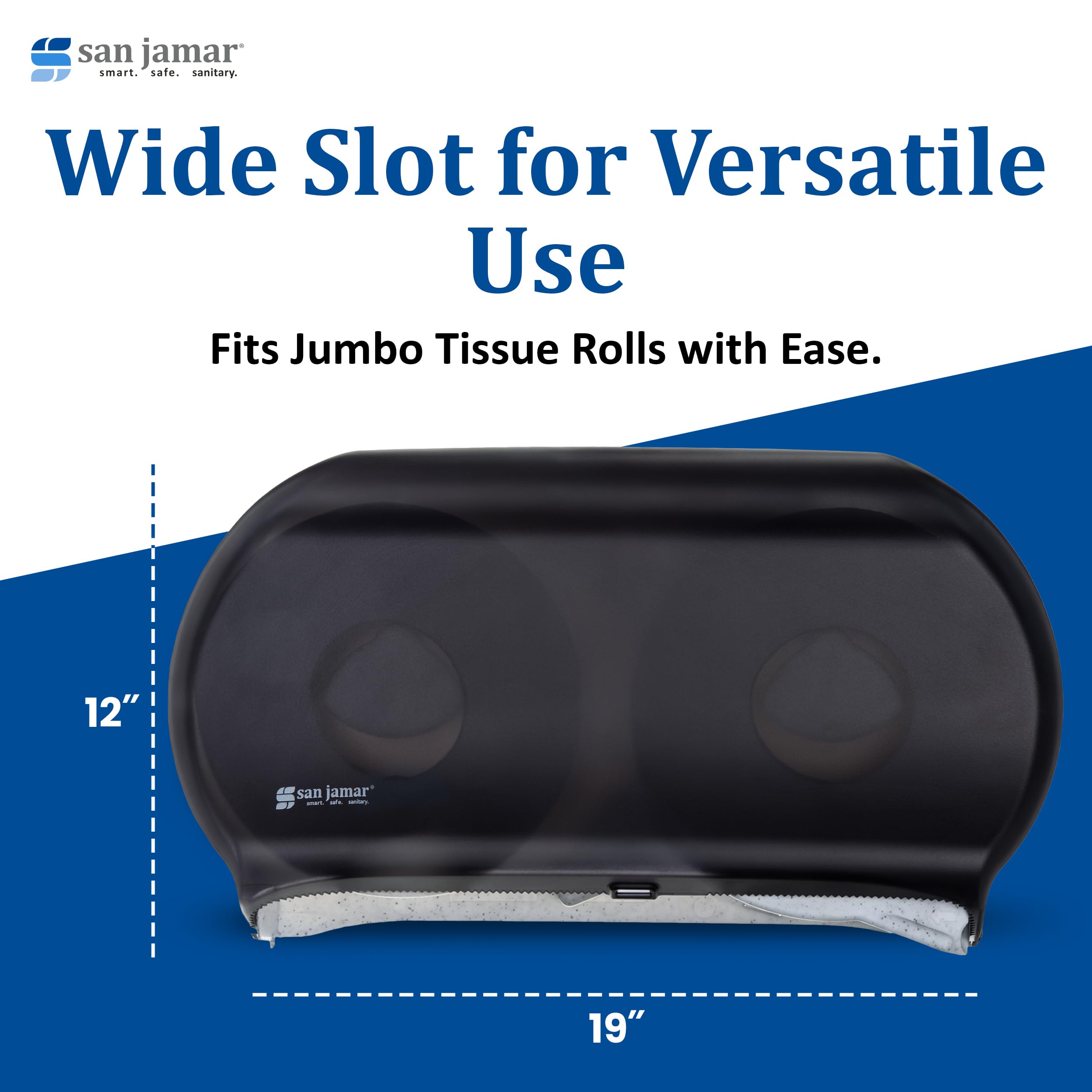 Enhance your restroom's functionality and appearance with the San Jamar R4000TBK Twin Classic Jumbo Toilet Tissue Dispenser. This dispenser is designed to accommodate any brand or quality of jumbo bath tissue, holding up to two 9" rolls to ensure a steady supply in high-traffic areas. Its innovative transfer system prevents access to the spare roll until the first roll is completely used, effectively eliminating stub roll waste and promoting efficient use of resources. The dispenser features a compact, slim design that seamlessly fits into spaces with limited room, making it an ideal choice for various restroom environments. Constructed from break-resistant plastic, it withstands daily wear and tear, ensuring long-lasting durability. The translucent cover allows maintenance staff to quickly and easily check paper levels, reducing downtime and ensuring the restroom remains well-stocked. Installation is a breeze with the dispener's mounting hole pattern, eliminating the need for additional drilling. For added security and convenience, the dispenser includes two keys. Elevate your restroom's aesthetic and functionality with the San Jamar Twin Classic Jumbo Toilet Tissue Dispenser, combining efficiency, durability, and a sleek, modern design. (Model Number: R4000TBK).