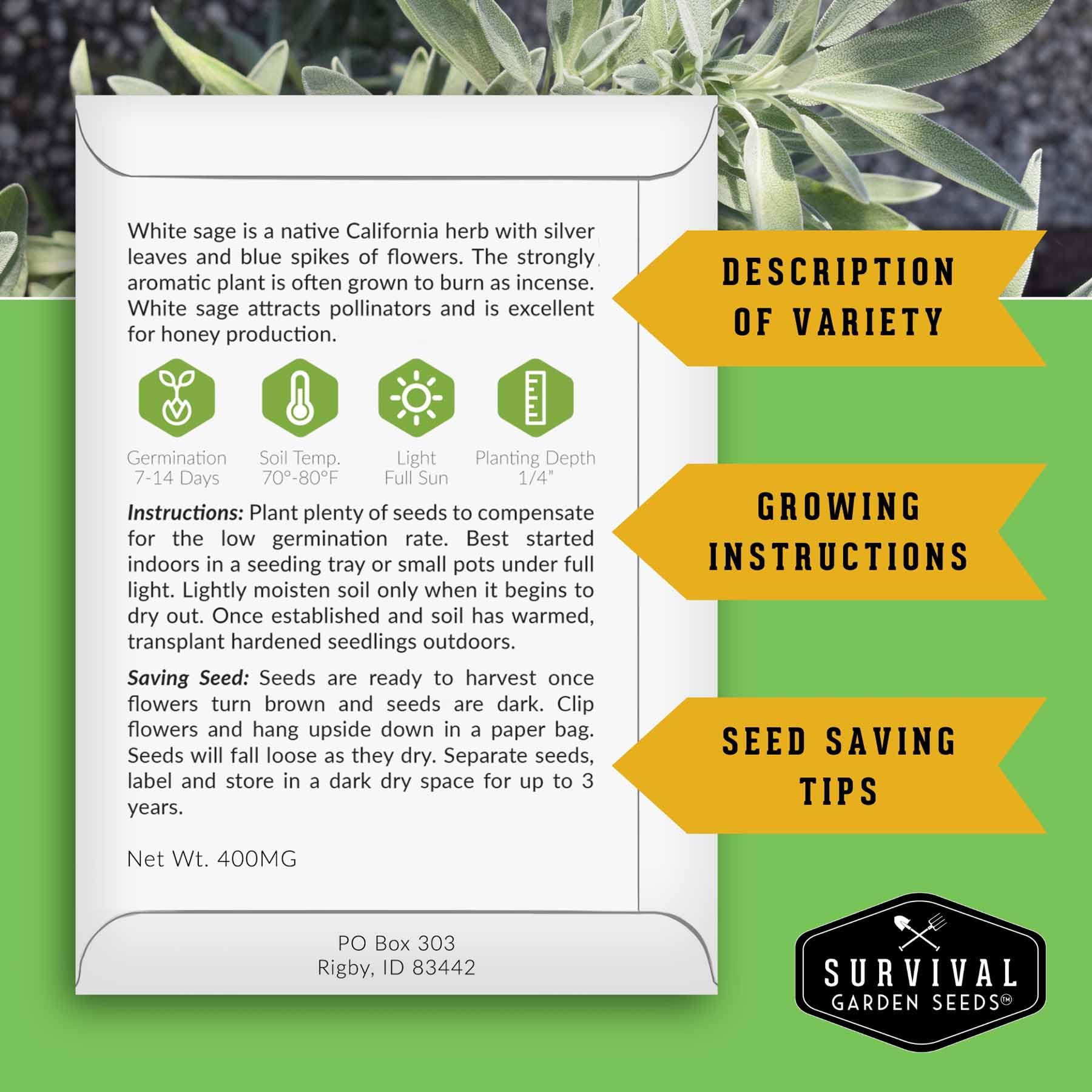 The Info You Need to Grow - White Sage seeds for planting are packed in a beautiful paper packet with instructions for successful germination in your home garden. The package also includes instructions for seed saving, suitable for beginners and experienced gardeners.