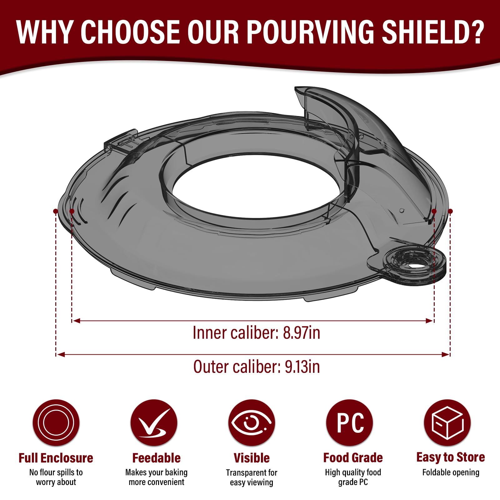 【Large angled pour chute】- Our kitchen aid accessories and attachments - pouring shield for kitchen aid 4.5-5 quart features a large angled ingredient slide, helping you easily add ingredients to the kitchen aid stainless steel mixing bowl without wasting your raw materials.