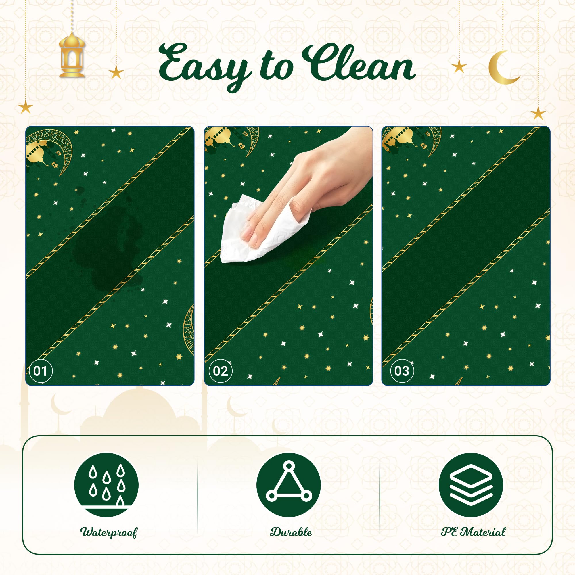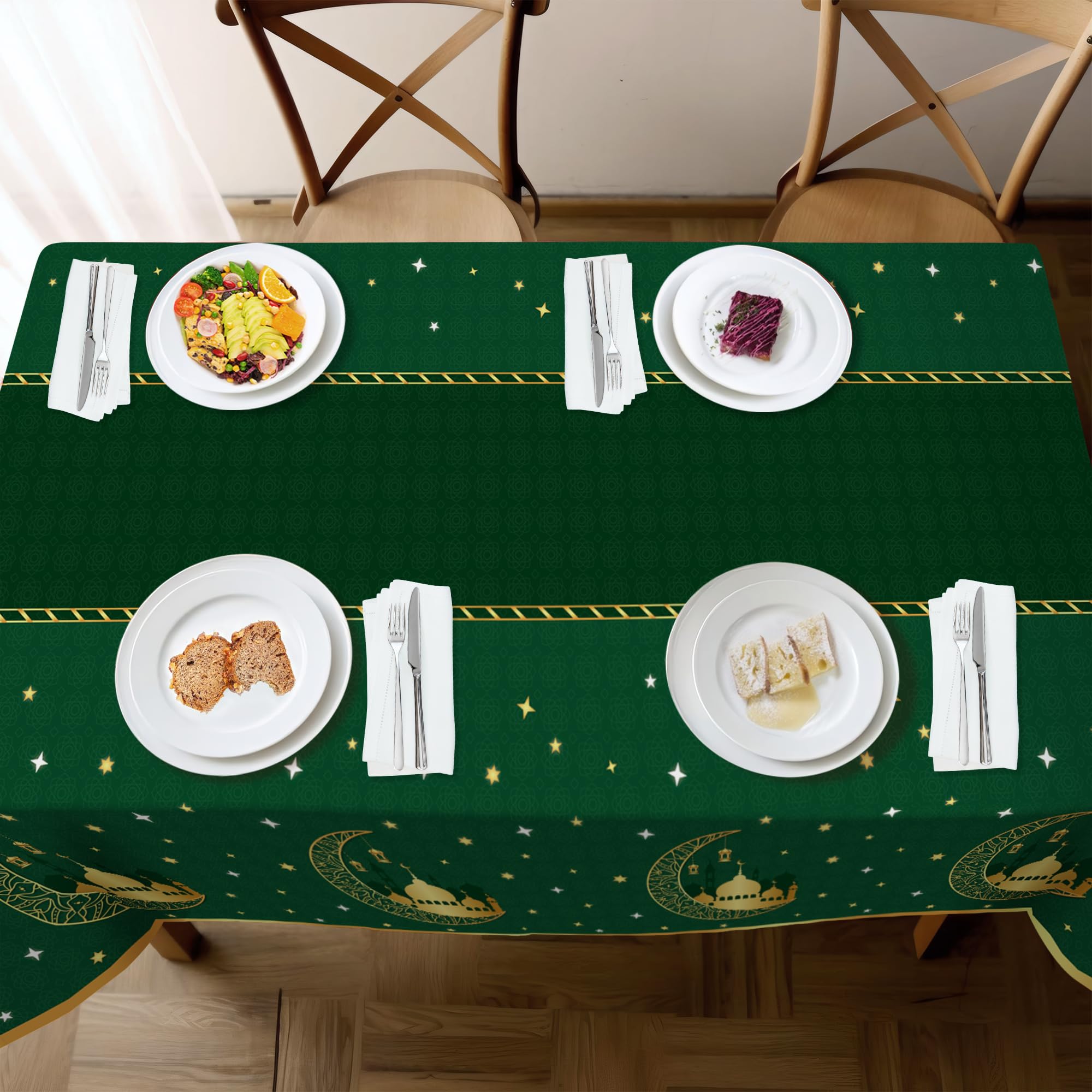 Original Design: The exquisite Ramadan tablecloth consists of golden star and moon, temple and eid lantern elements. This tablecloth will look perfect on your table, both on the tabletop and the draped down part. It won't be like some other tablecloths where the pattern gets folded after you lay it down. You'll get lots of compliments on it