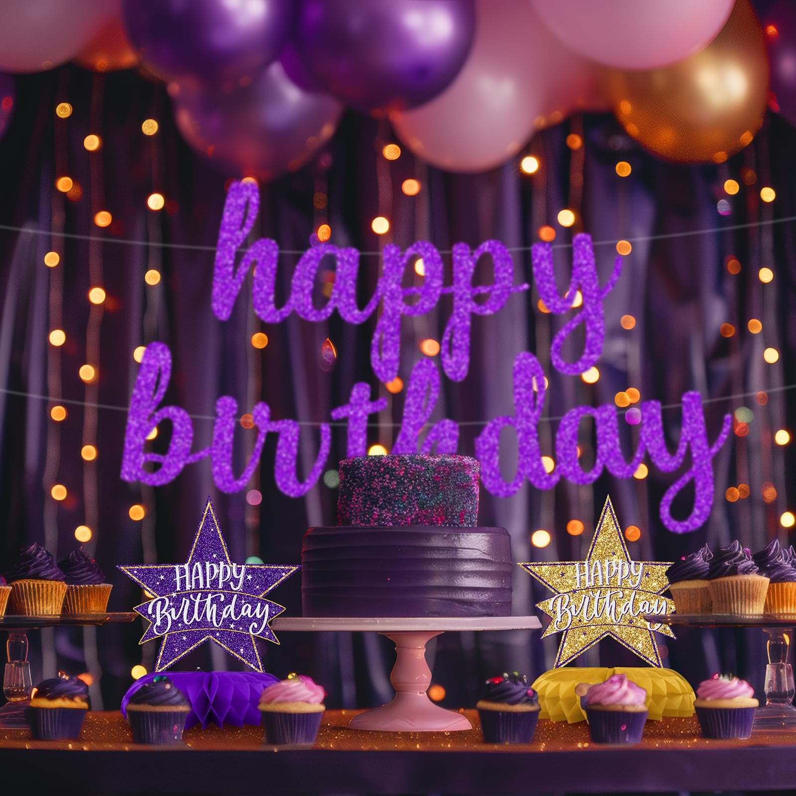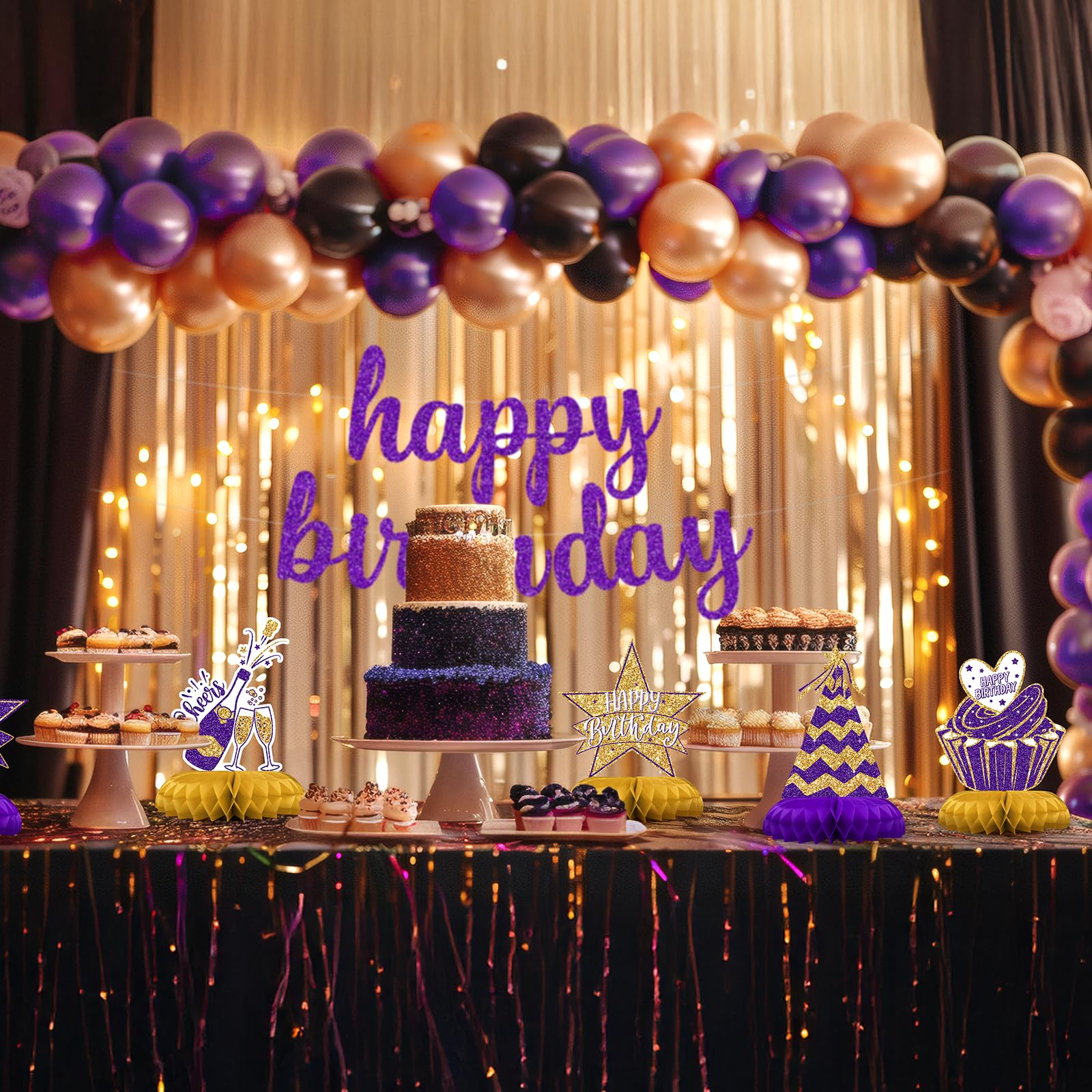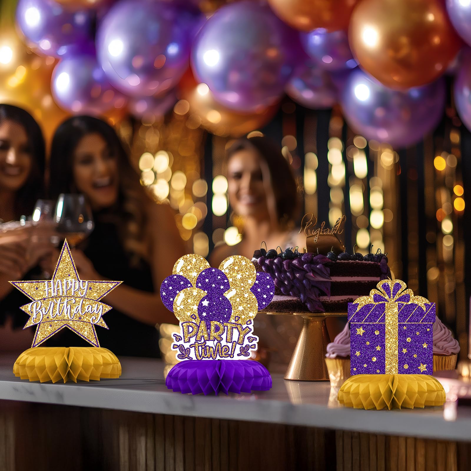 Purple and Gold Birthday Decorations for Table – Elegant and regal, these purple and gold table centerpieces create a luxurious birthday atmosphere for women and adults.