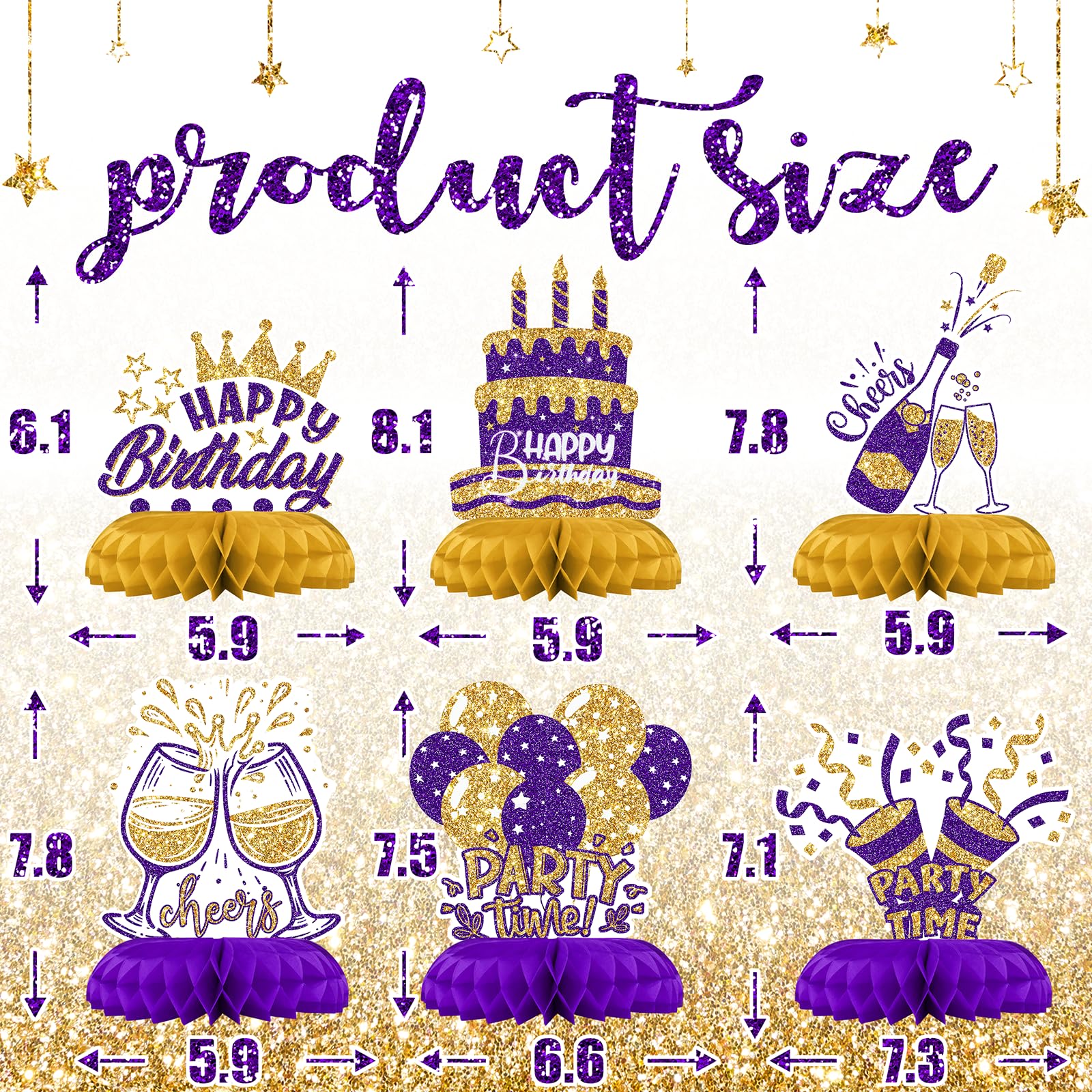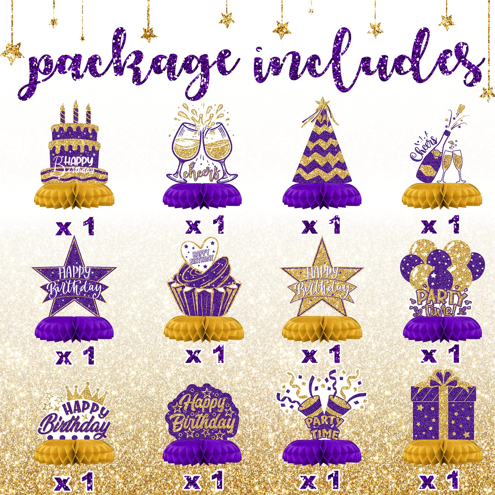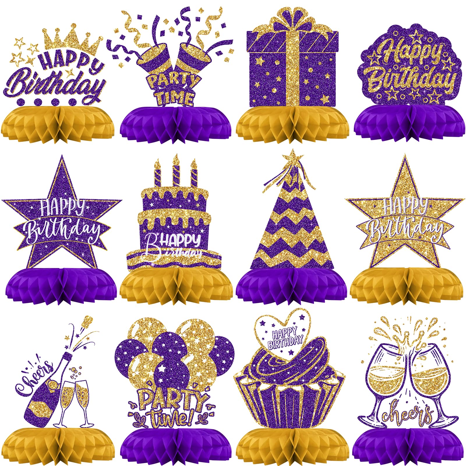 12PCS Happy Birthday Table Centerpieces – Includes 12 beautiful honeycomb pieces featuring birthday icons like cakes, stars, glasses, and balloons – ideal birthday table decorations.