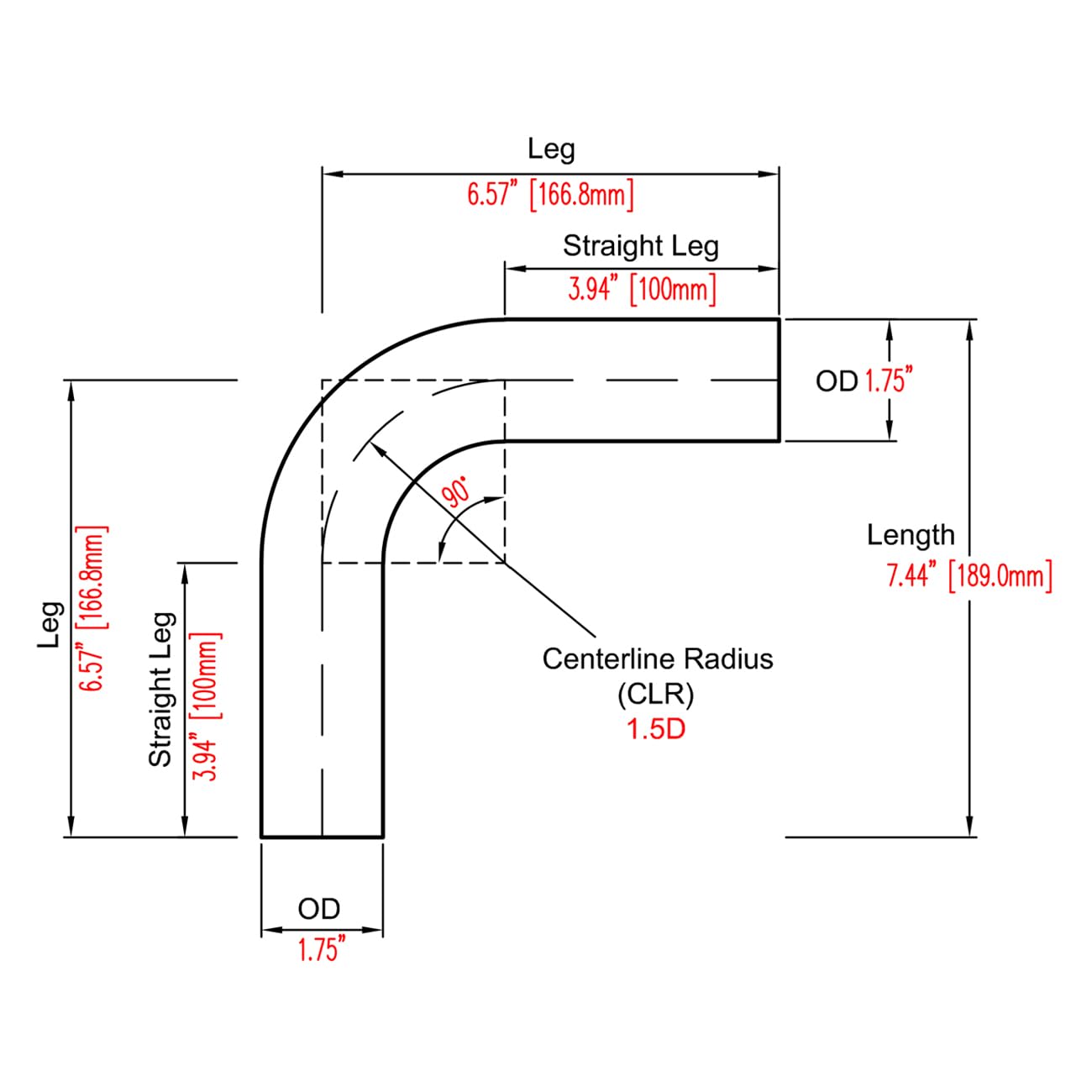 90 degree mandrel-bent aluminum intercooler piping. Outside diameter: 1.75" (45mm), straight leg length: 3.94" (100mm), wall thickness: 0.071" / 1.8mm