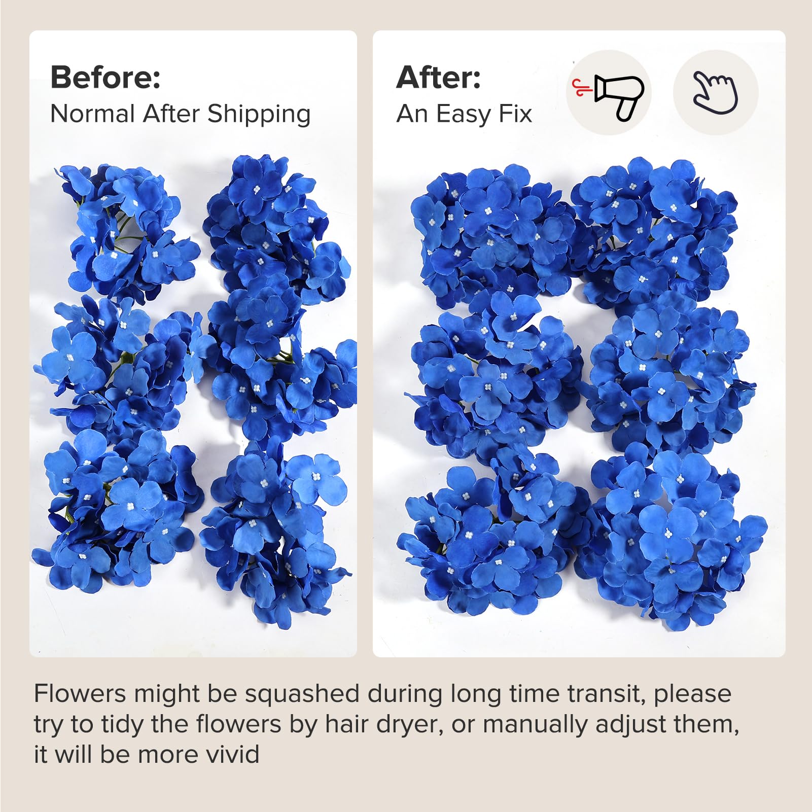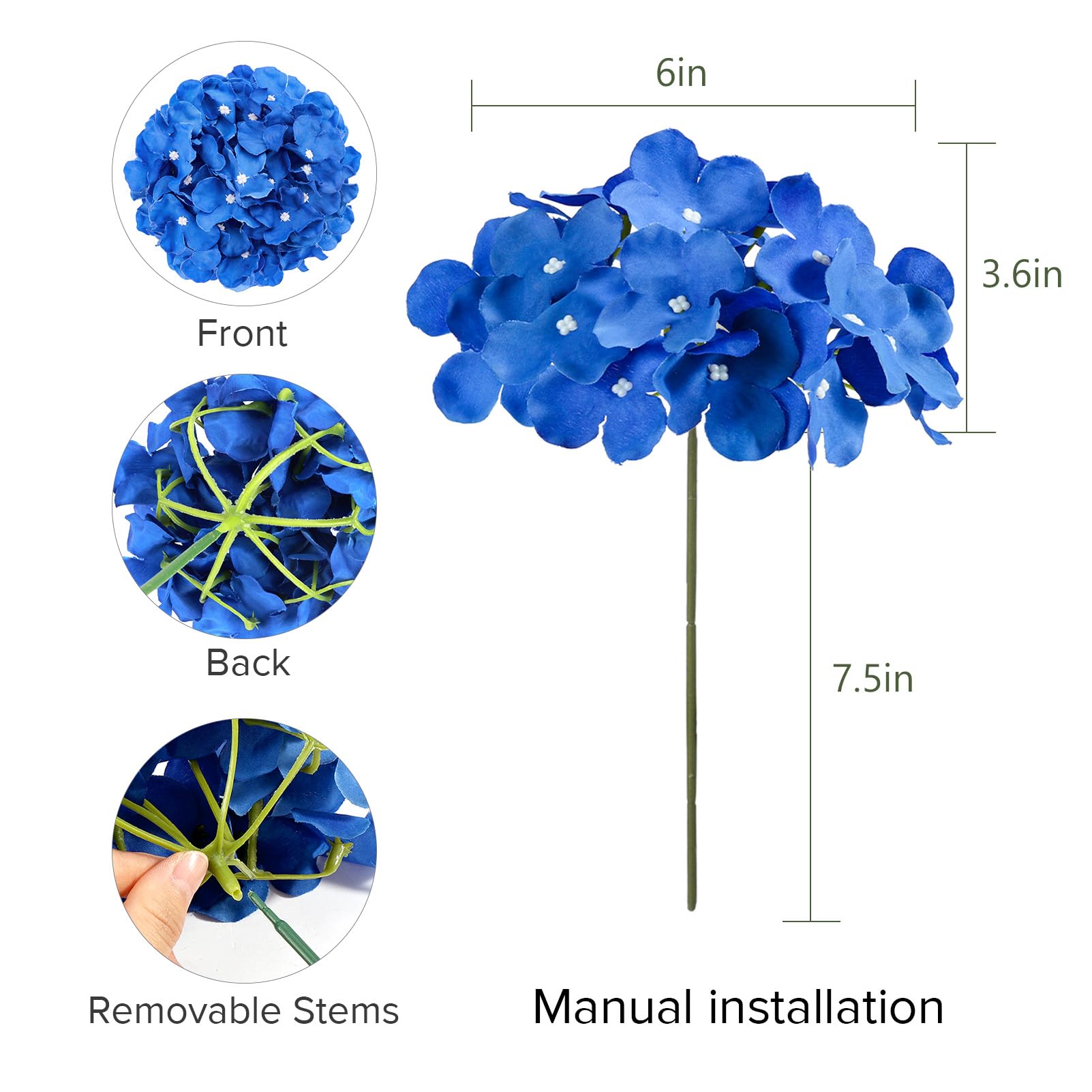 64 PCS Royal-Blue Hydrangea Flowers: Include 64 pcs royal blue artificial hydrangea flower heads with 64pcs stems, sufficient artificial flowers bulk will meet all your decoration ideas. Note: Flowers and stems are separate and need to be installed yourselves