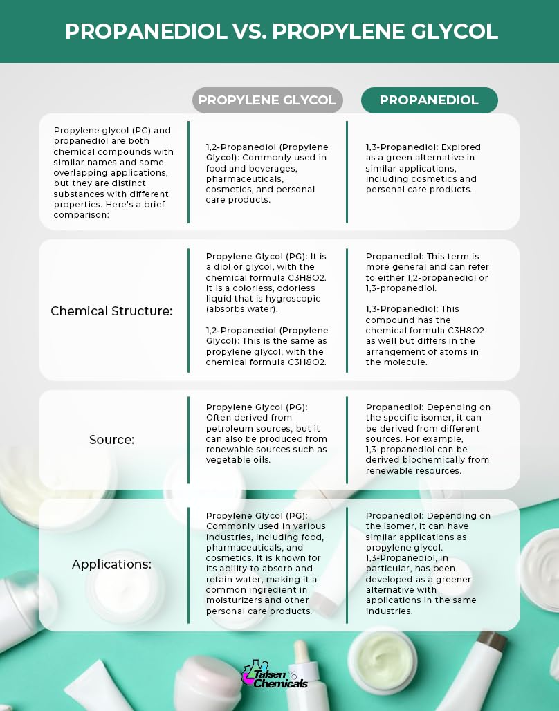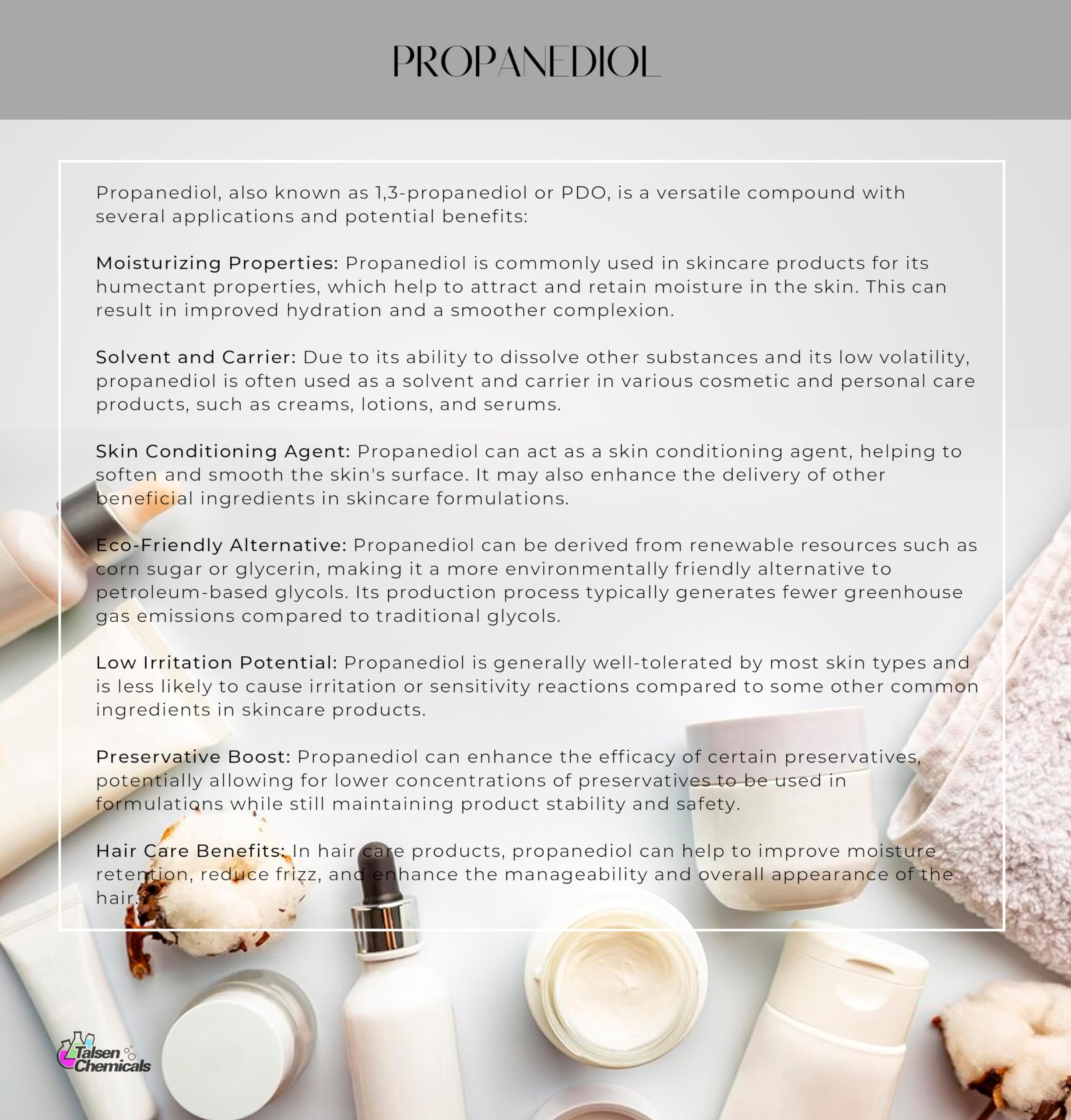 Propanediol (PDO) is a common ingredient in cosmetics and personal care products such as lotions, cleansers, and other skincare products. It's a chemical similar to propylene glycol but thought to be safer. Propanediol serves as a versatile solution for a wide range of applications, offering unmatched performance and consistency. Propanediol stands as a versatile solution for a myriad of applications, offering unparalleled versatility and consistency. Key Features: Superior Humectant Properties: Hydrate and moisturize with confidence. Propanediol boasts exceptional humectant properties, attracting and retaining moisture for prolonged hydration of the skin, hair, and formulations. Enjoy products that deliver lasting moisture and a rejuvenated, supple appearance. Efficient Solvent Abilities: Facilitate seamless dispersion and solubility. Experience enhanced formulation flexibility and efficiency with this multifunctional ingredient. Propanediol serves as an exceptional solvent, effortlessly dissolving a wide array of compounds, including active ingredients, fragrances, and botanical extracts. Enhanced Stability and Preservation: Propanediol contributes to formulation stability by inhibiting microbial growth and oxidative degradation. Ensure the integrity and efficacy of your products, providing consumers with formulations that remain fresh and potent over time. Skin Conditioning Benefits: Improve skin texture and appearance. Propanediol enhances the spreadability and absorption of formulations, leaving behind a soft, smooth, and conditioned feel. Delight consumers with products that offer a luxurious sensory experience and noticeable skin improvement.
