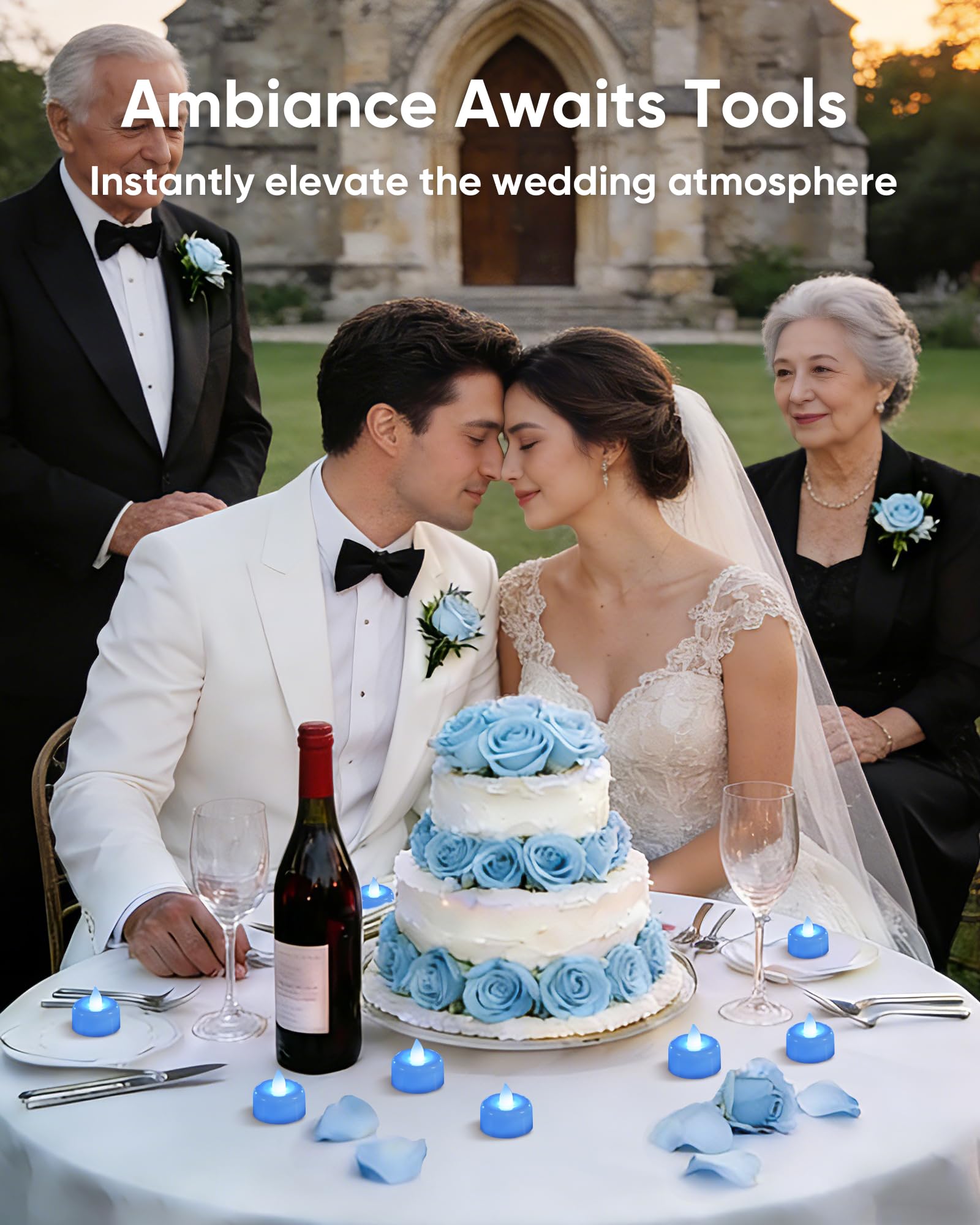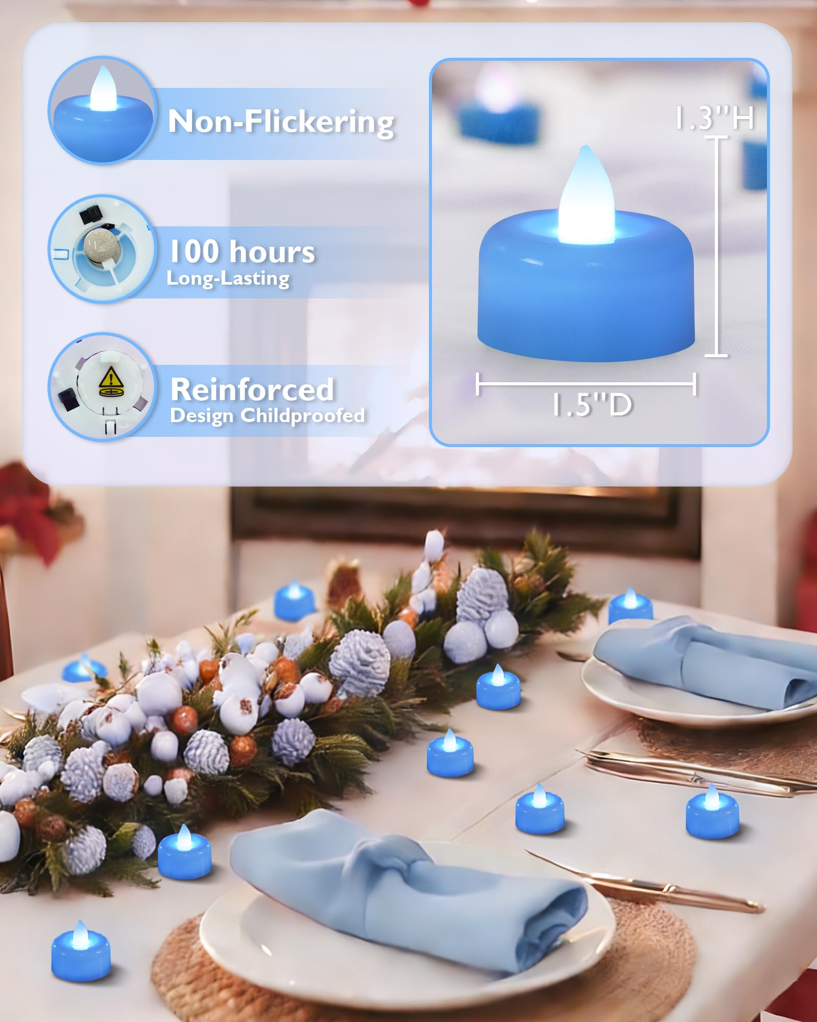 Light Blue LED Tea Candles: These enchanting electronic tea lights emit a bright Blue glow, effortlessly transforming any space into a romantic haven. Their realistic wax appearance and touch will leave you amazed