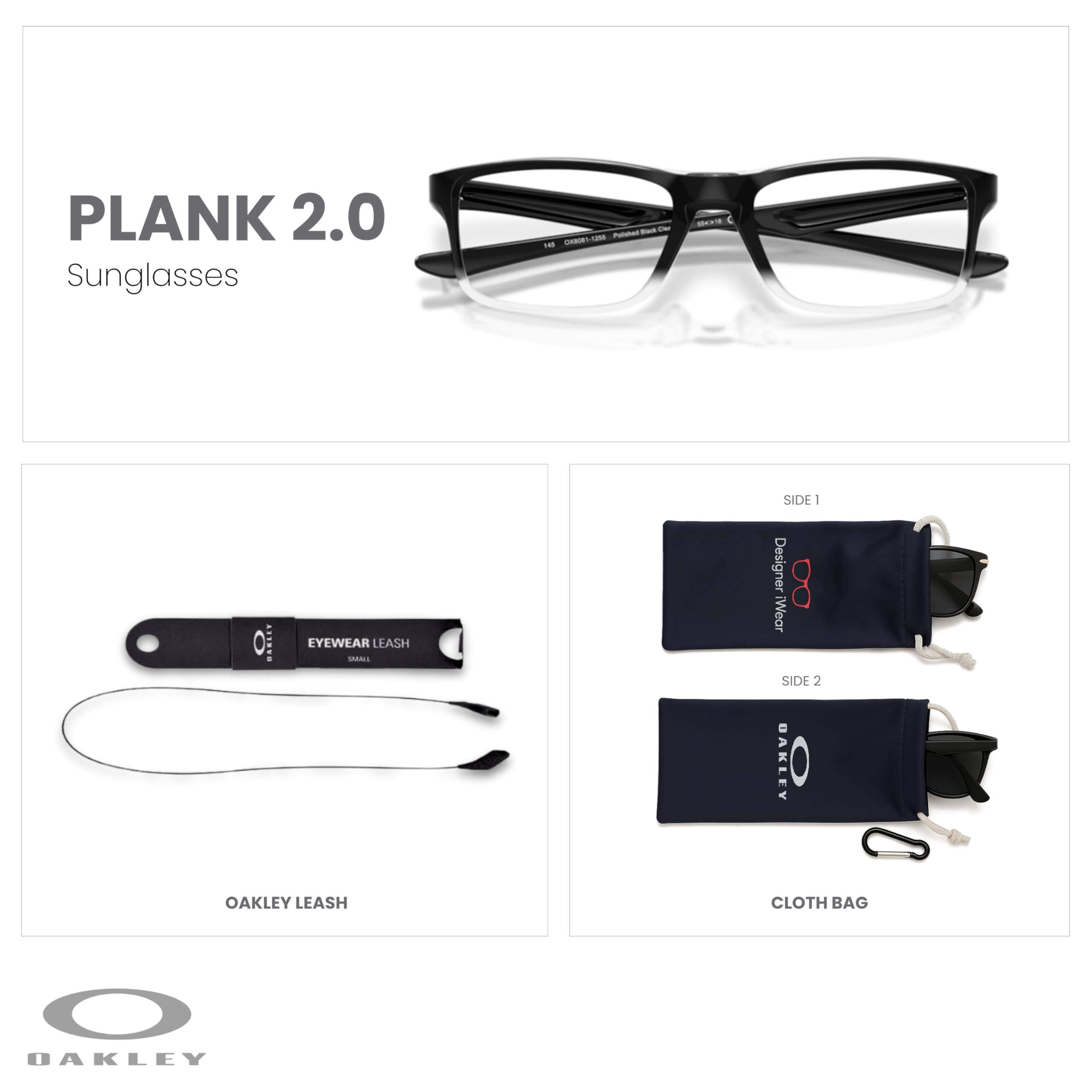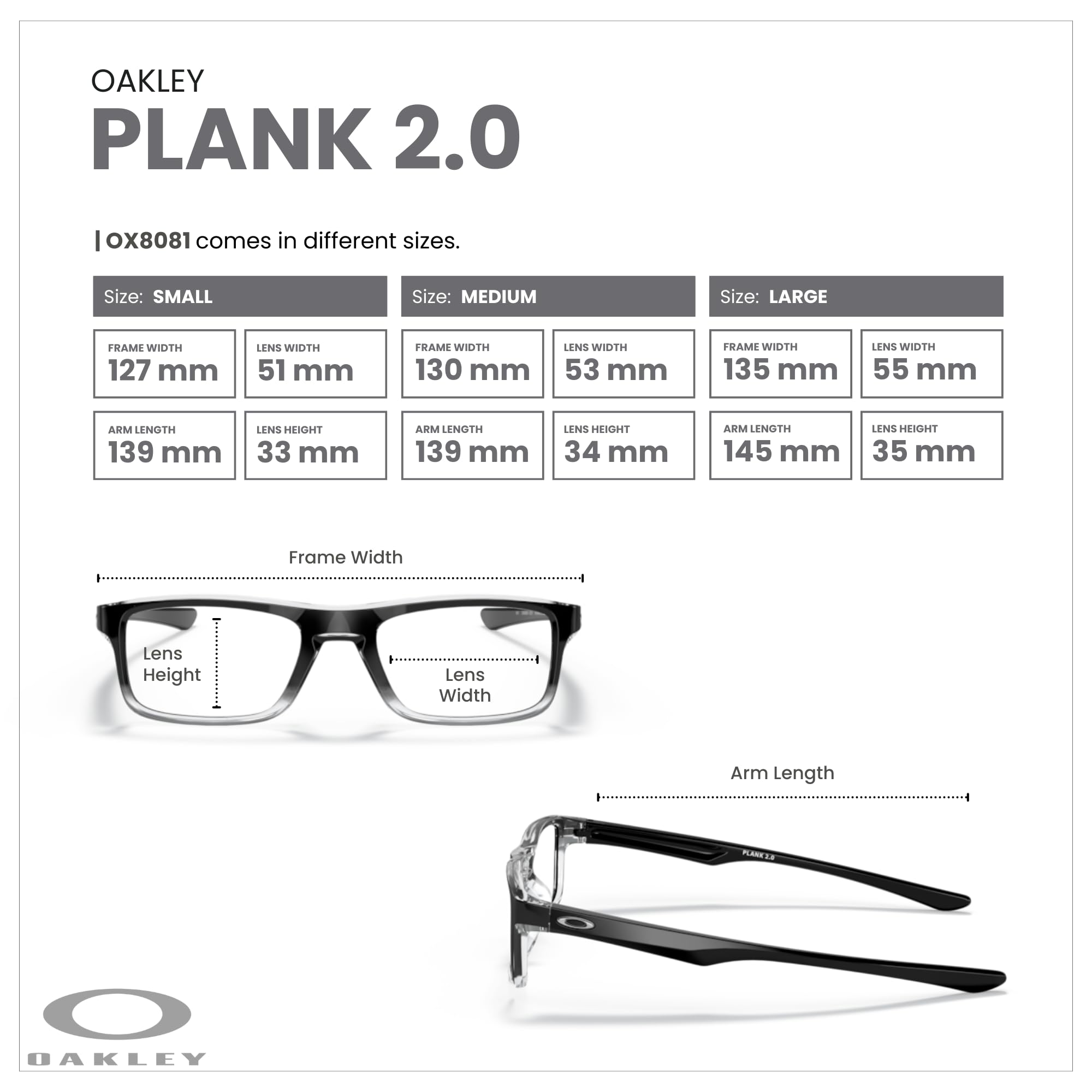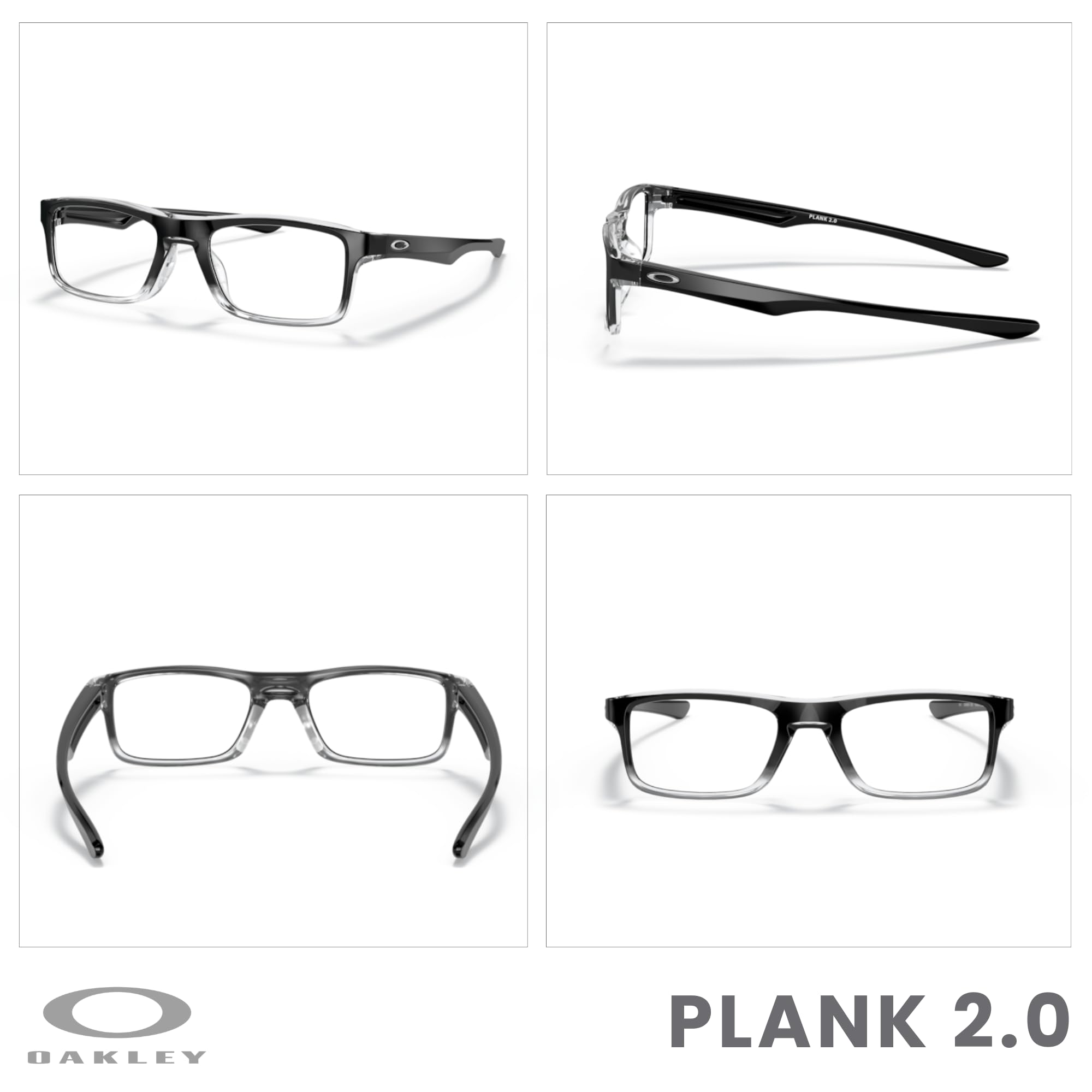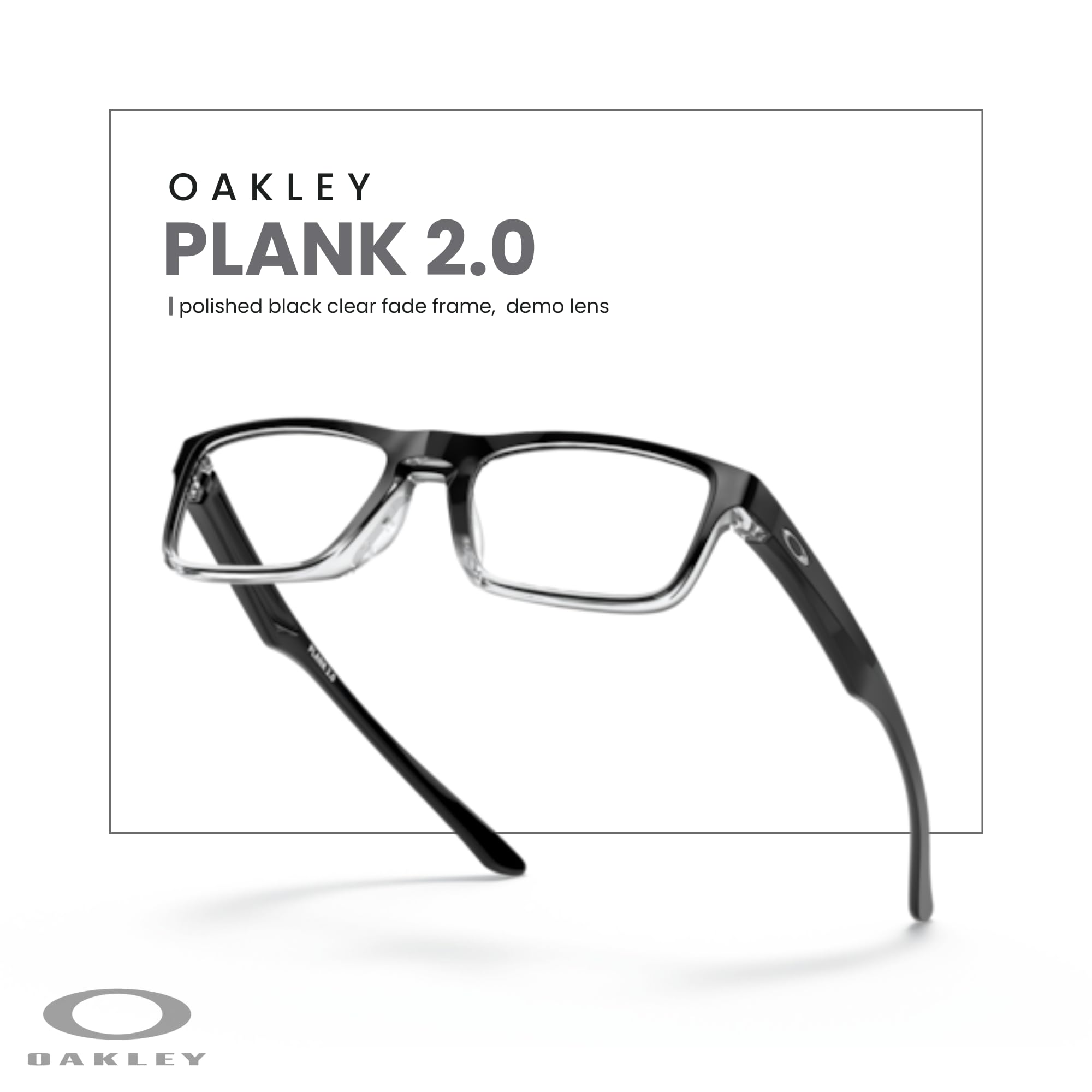 About the frame: The Oakley Plank 2.0 OX8081 in Polished Black Clear Fade offers a sleek rectangular frame with a lightweight and durable O Matter construction for long-lasting comfort. Designed for men and women, this Medium (53mm lens width) frame features wire-core temples, allowing for adjustability and a secure, personalized fit.