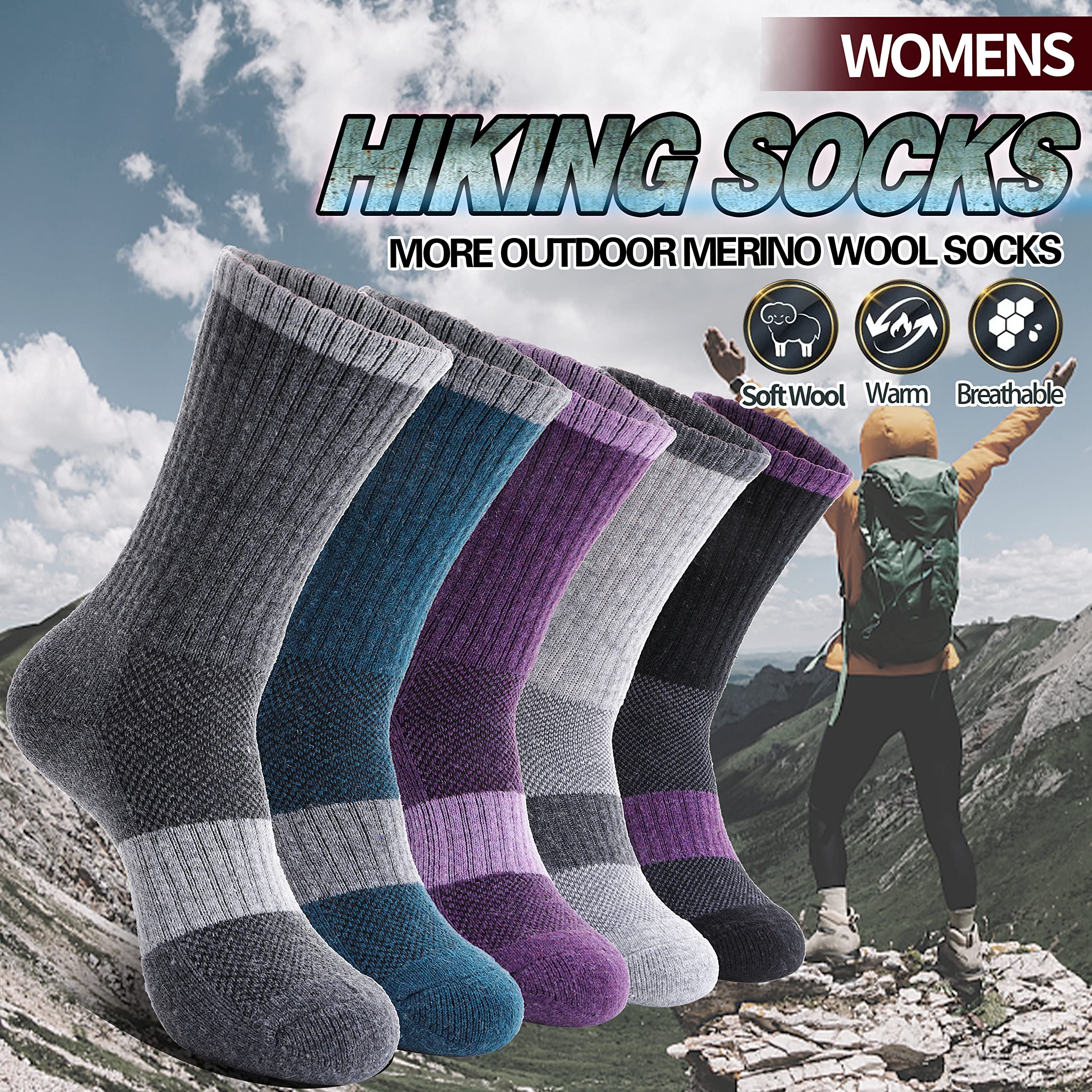 Package and Size:Here are 5 pairs merino wool hiking socks for women. And here are 2 sizes as options, M (suitable for US women's shoe size 5.5-10) & L (suitable for US women's shoe size 10-13).The value package with fashion colors are most women’s favorite.