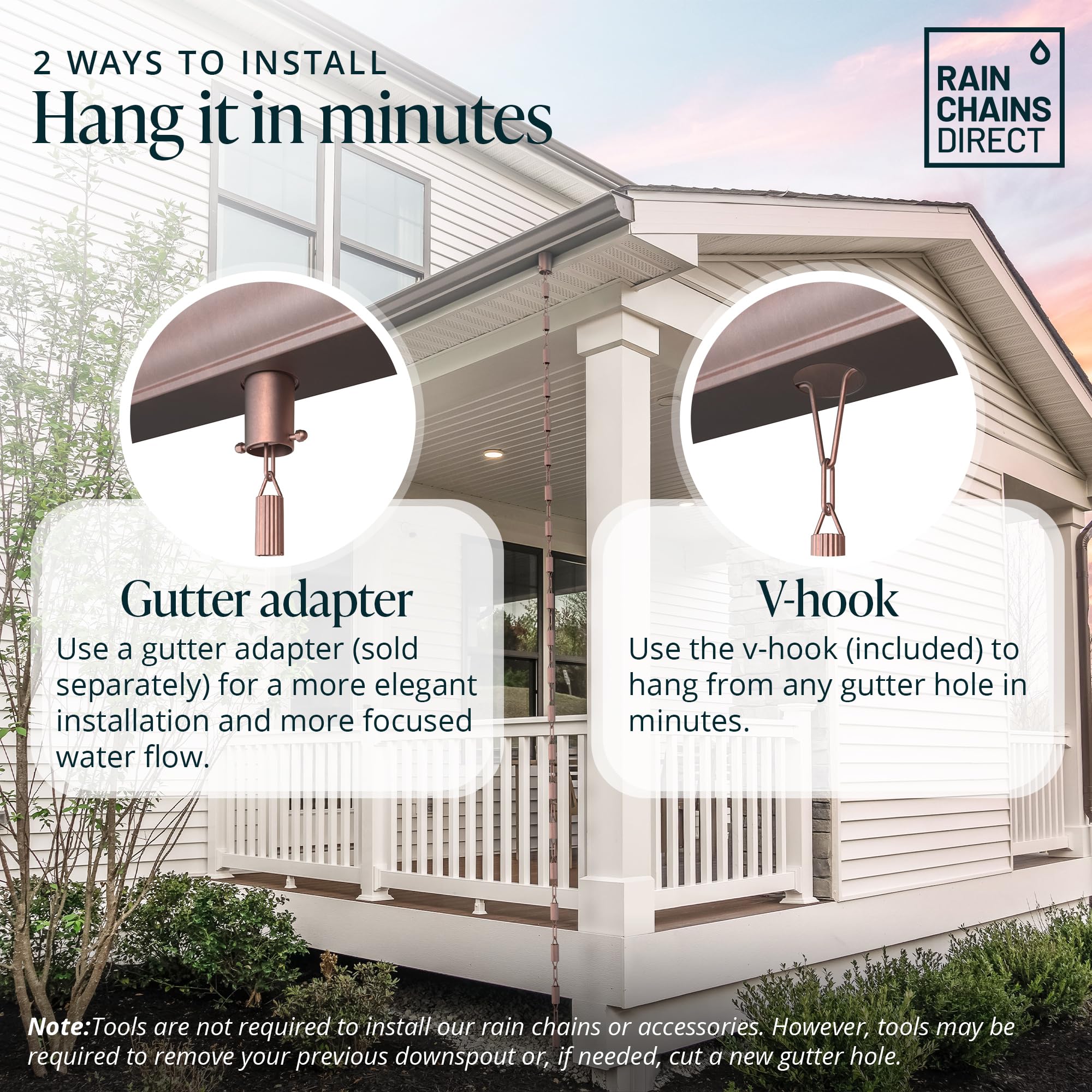 Install in a Snap - No need to be an expert. Easily swap your rain chains for downspouts using the supplied hanging hook. Our rain chains for outside are compatible with any standard gutter hole. Optional gutter installer sold separately.