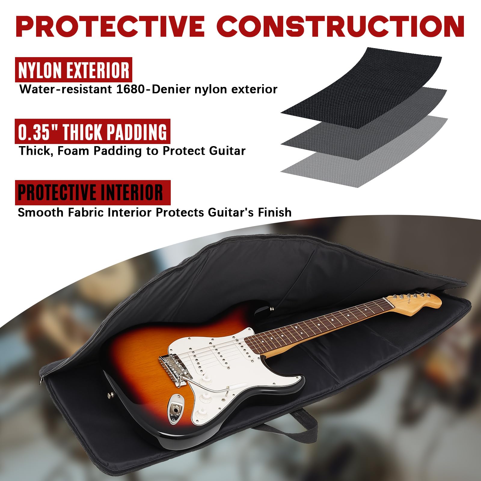 Durable Material: the guitar storage bag is made of 1680 D Oxford cloth, which is sturdy and wear resistant, and lined with 10 mm thick pearl cotton; This type of material can provide effective protection for your guitar, with shock resistance and pressure resistance; It can handle scenarios such as flight transport and stage handling, protect the neck and body of the guitar, and avoid scratches and bumps