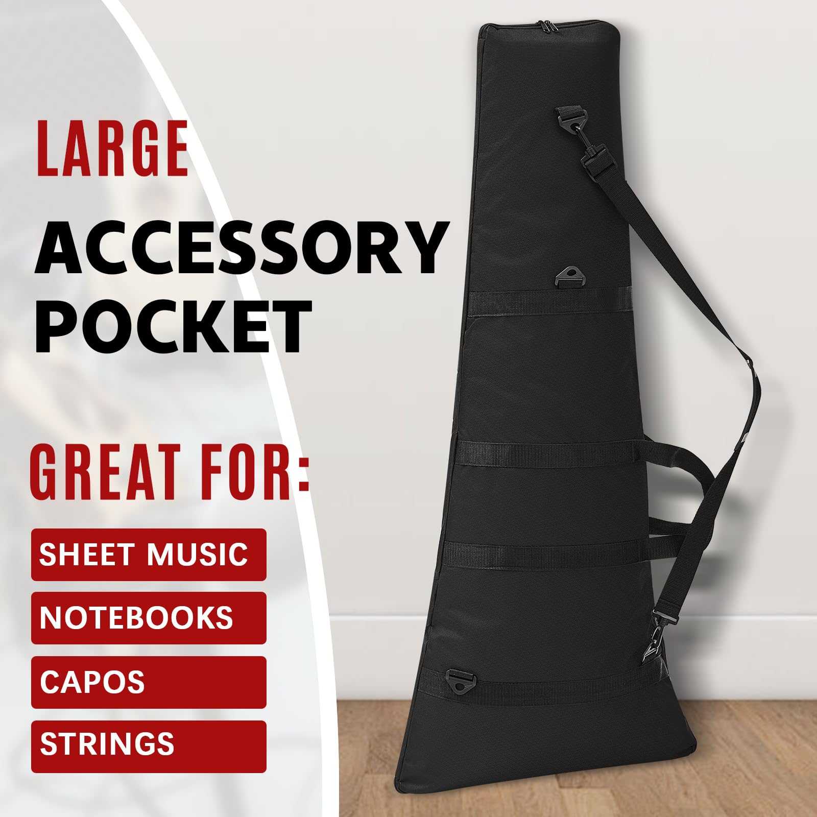 Pocket Design: the carrying bag for guitar features an external pocket design that can be applied to store small accessories such as paddles, straps, and a tuner, allowing you to quickly find what you need