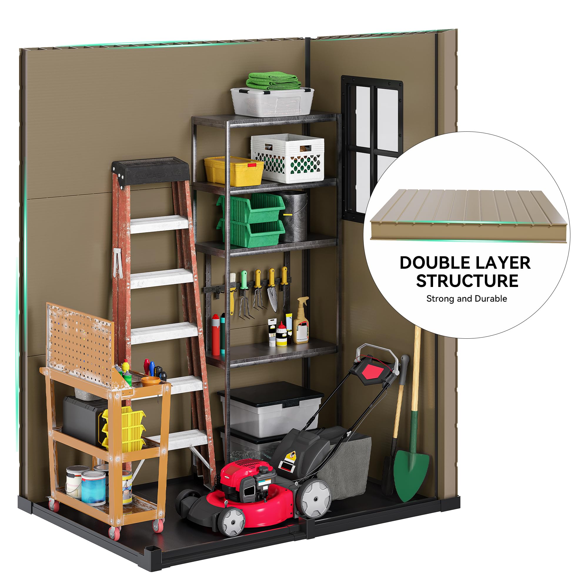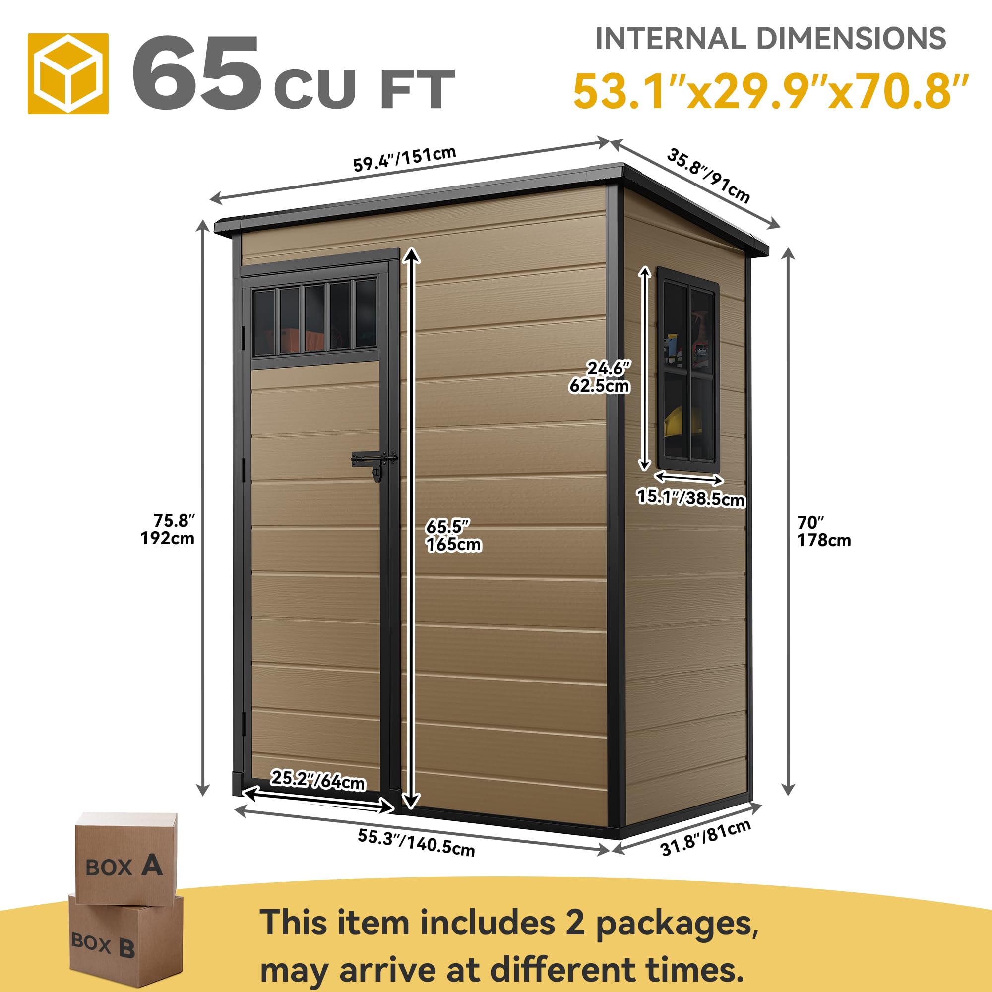 Spacious & Versatile: With internal dimensions of 53.1" x 29.9" x 70.8" and external dimensions of 55.3" x 31.8" x 75.8", this 5x3 plastic shed offers 65 cu.ft of room for tools, gardening gear, and outdoor essentials