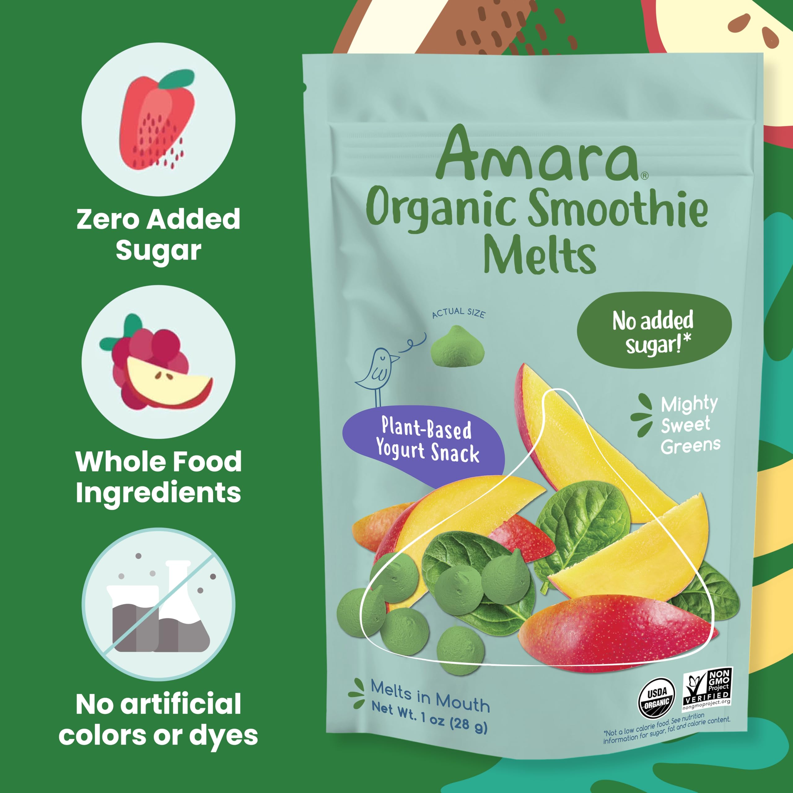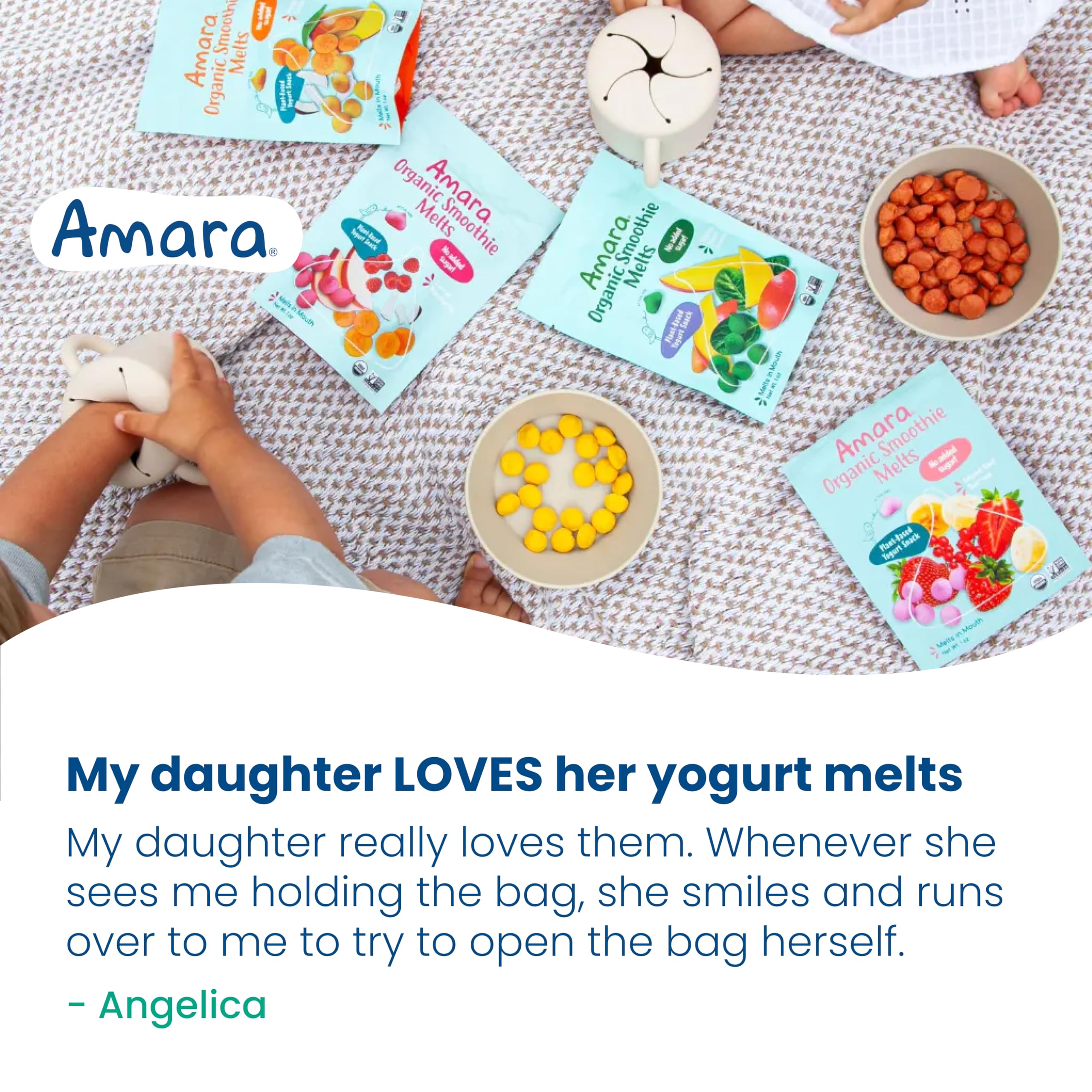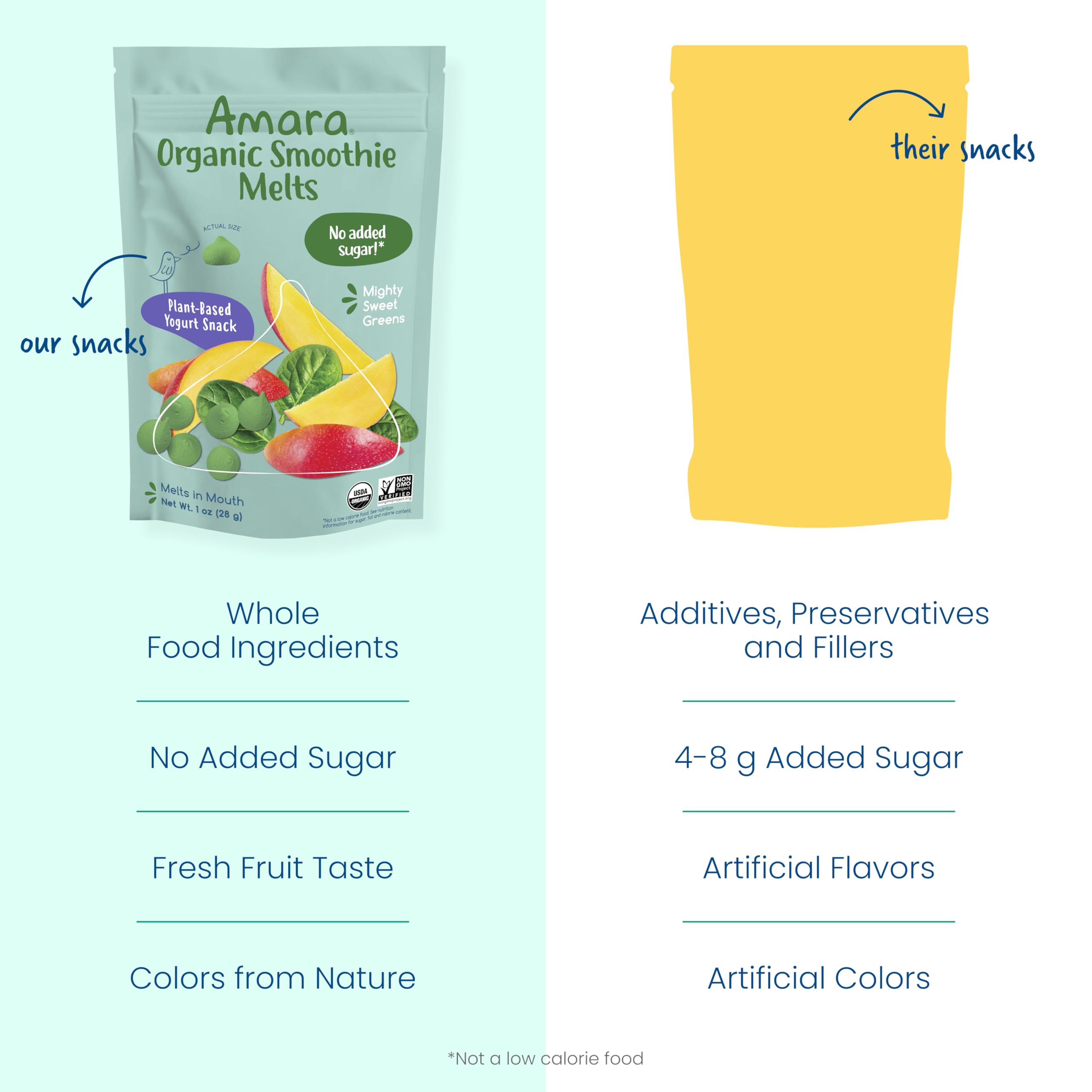 NO ADDED SUGAR: Amara delivers nutritious baby food and snacks that are 100% organic and non-GMO. The first melt-in-mouth snack without any added sugar or fillers, these melts keep little hands busy and tiny tummies full without the sugar crash.