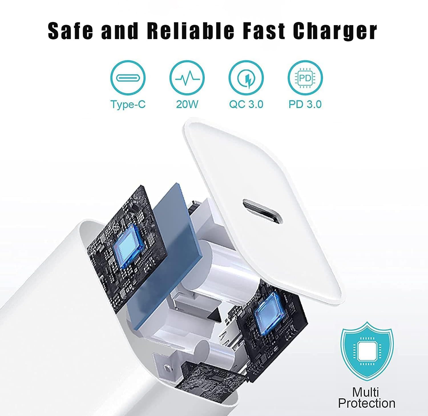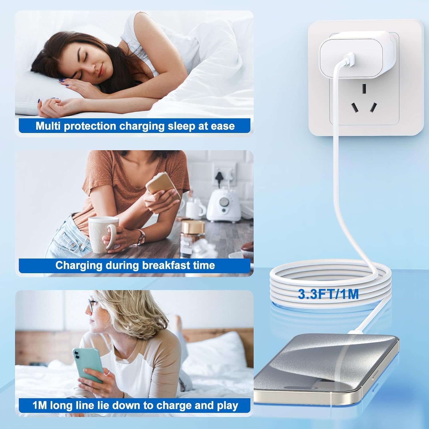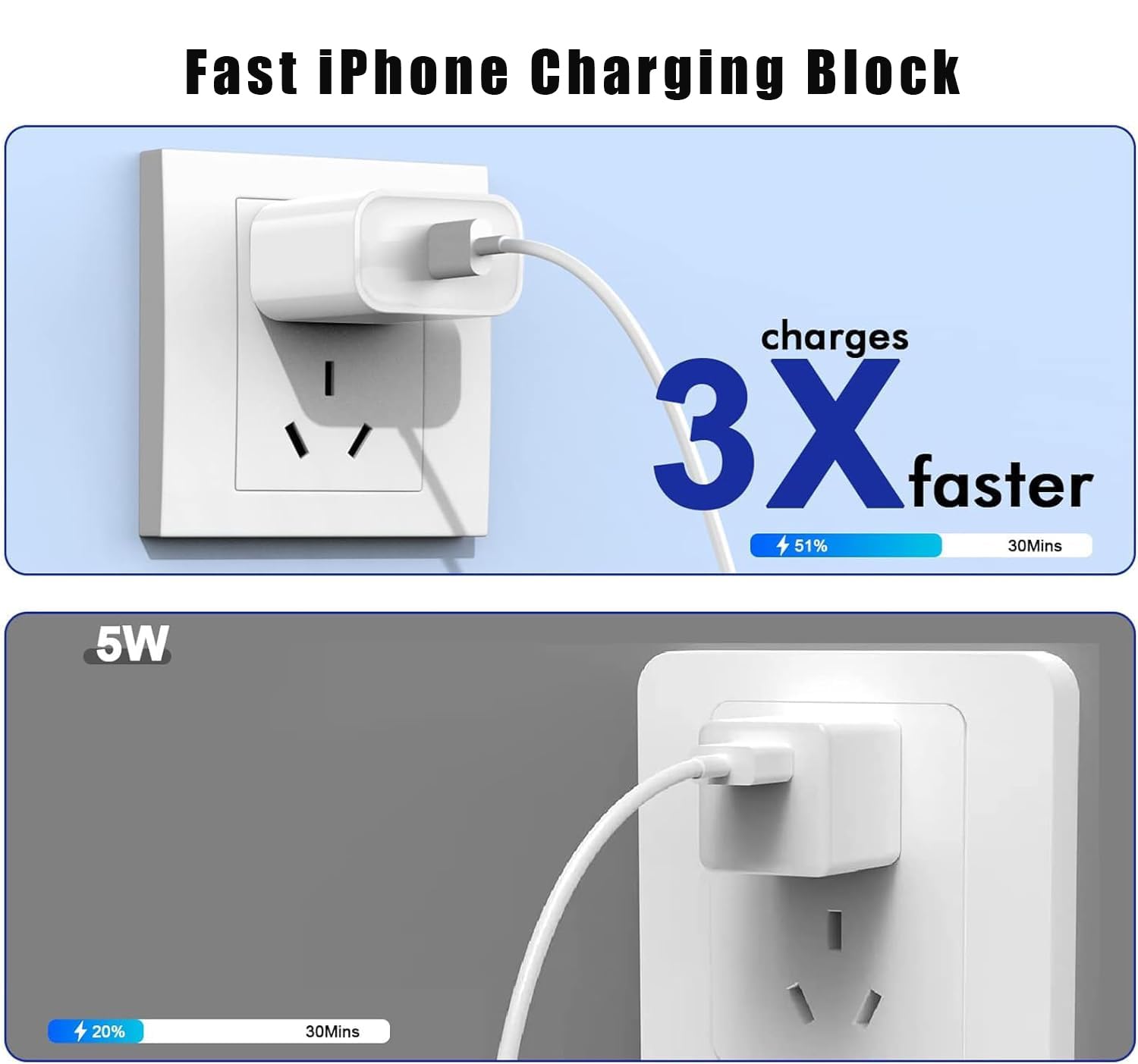 USB C Charger for iPhone 16/15 Charger Fast Charging Fast 20W iPhone 16 15 Charger -20W PD 3.0 fast charger and USB-C to C cable, charge iPhone 16 15 pro max to 55% in half an hour, which is 3× faster than with an original 5W usb charger -Provide you with a fast and convenient charging experience iPhone charger USB C Cable -With two moderate USB C data cable,iPad charger uses iPhone 16 15 copper core charging cable, charging and data synchronization speed is faster -Quick Speeds of up to 480mbps/s ensure efficient charging and data transmission Safe and Efficient Fast Charge -Be safe from over-current over-voltage over-heating , short-circuiting, exhaustive protection while charging Widely Compatible: -For iPhone: -iPhone 16/ 16 Plus/ 16 Pro/ 16 Pro Max/16e -iPhone 15/ 15 Plus/ 15 Pro/ 15 Pro Max -For iPad: -iPad Pro 13 in(M4),iPad Pro 11 in(M4),iPad Air 13 in(M3) -iPad Air 11 in(M3),iPad (A16),iPad mini (A17 Pro) -iPad Pro 12.9 6th/ 5th/ 4th/ 3rd -iPad Pro 11 inch 4th/ 3rd/ 2nd/ 1st -iPad 10th Generation -iPad Air 6/5/4 -iPad Mini 6 -Other USB-C electronic devices What Your Get -2-Pack 20W USB C Wall Charger Block Power Adapter -2-Pack 3FT USB C Charger Cable