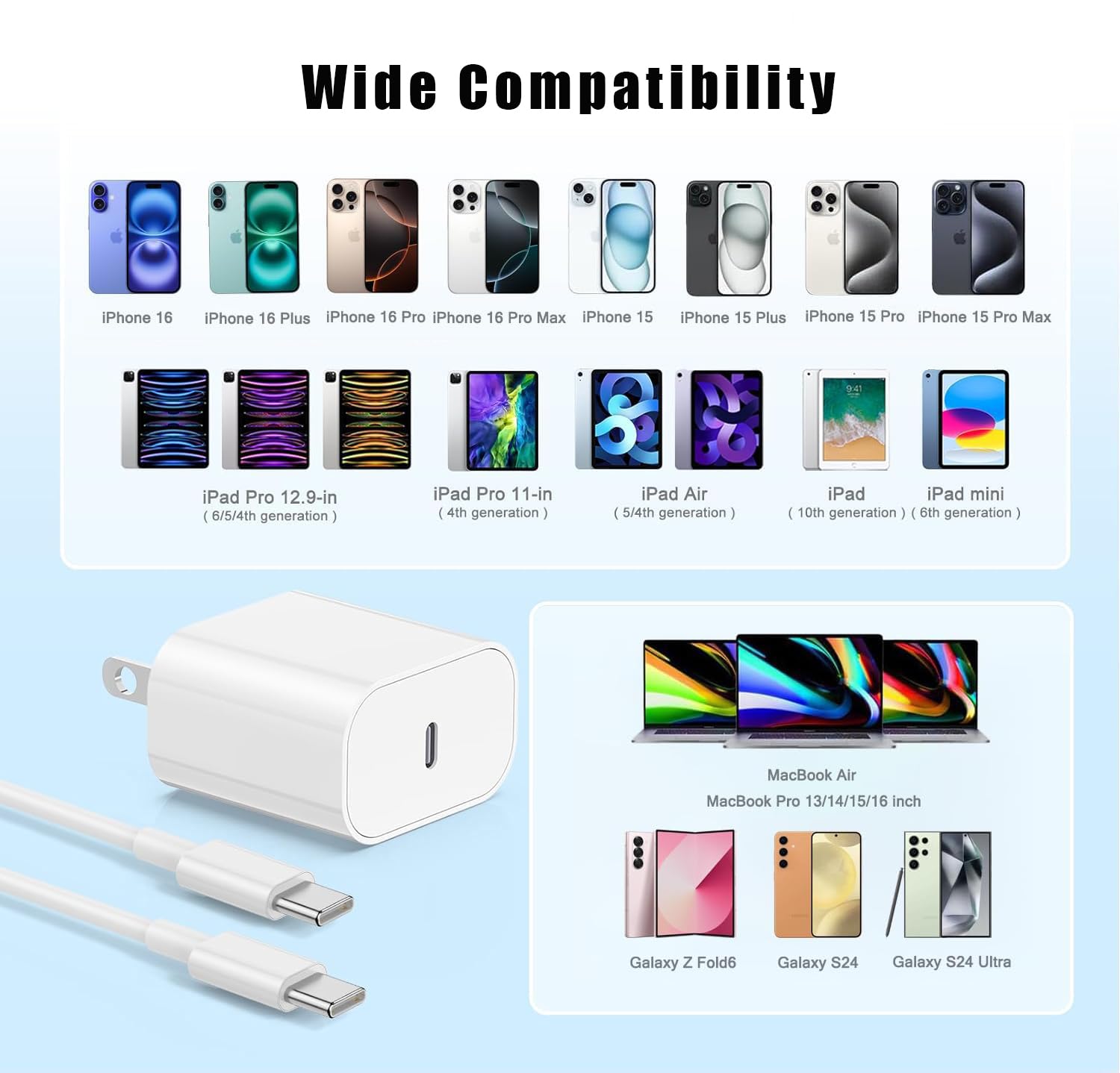 Widely Compatible:Fast charger for iPhone 16/ 16 Pro/16 Pro Max/16 Plus/16e,iPhone 15/ 15 Pro/15 Pro Max/15 Plus,iPad Pro 13 in(M4),iPad Pro 11 in(M4),iPad Air 13 in(M3),iPad Air 11 in(M3),iPad (A16),iPad mini (A17 Pro),iPad Pro 12.9 6th/ 5th/ 4th/ 3rd,iPad Pro 11 inch 4th/ 3rd/ 2nd/ 1st,iPad 10th Generation,iPad Air 6/5/4,iPad Mini 6 and more USB-C devices