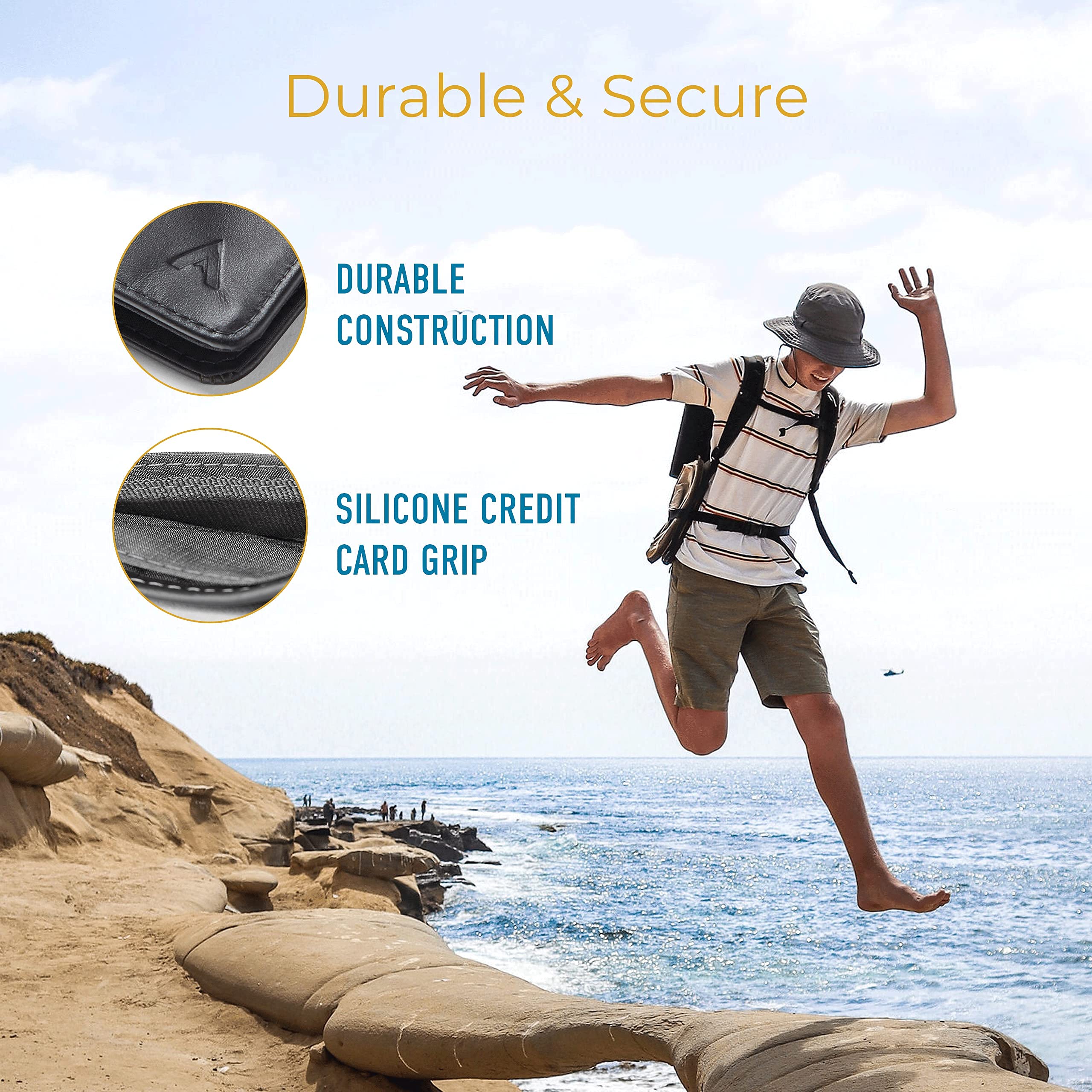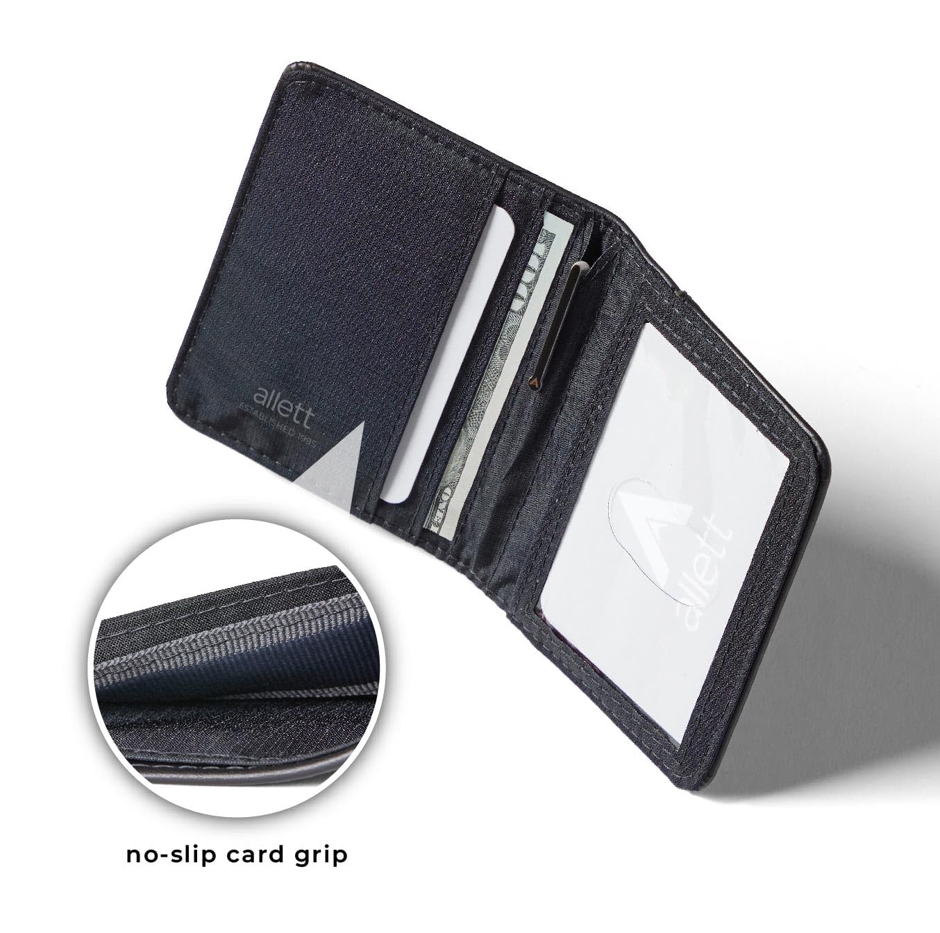 FEATURES & CAPACITY: Holds 3-10+ cards and folded bills. This incredibly skinny card wallet is an excellent front pocket wallet. Each card pocket is lined with a slim silicone grip to securely hold your cards in place. A hybrid between a wallet and a card holder, the vertical design is complete with a clear ID pocket and a tiny pocket to hold the Allett Micro Pen (sold seperately).