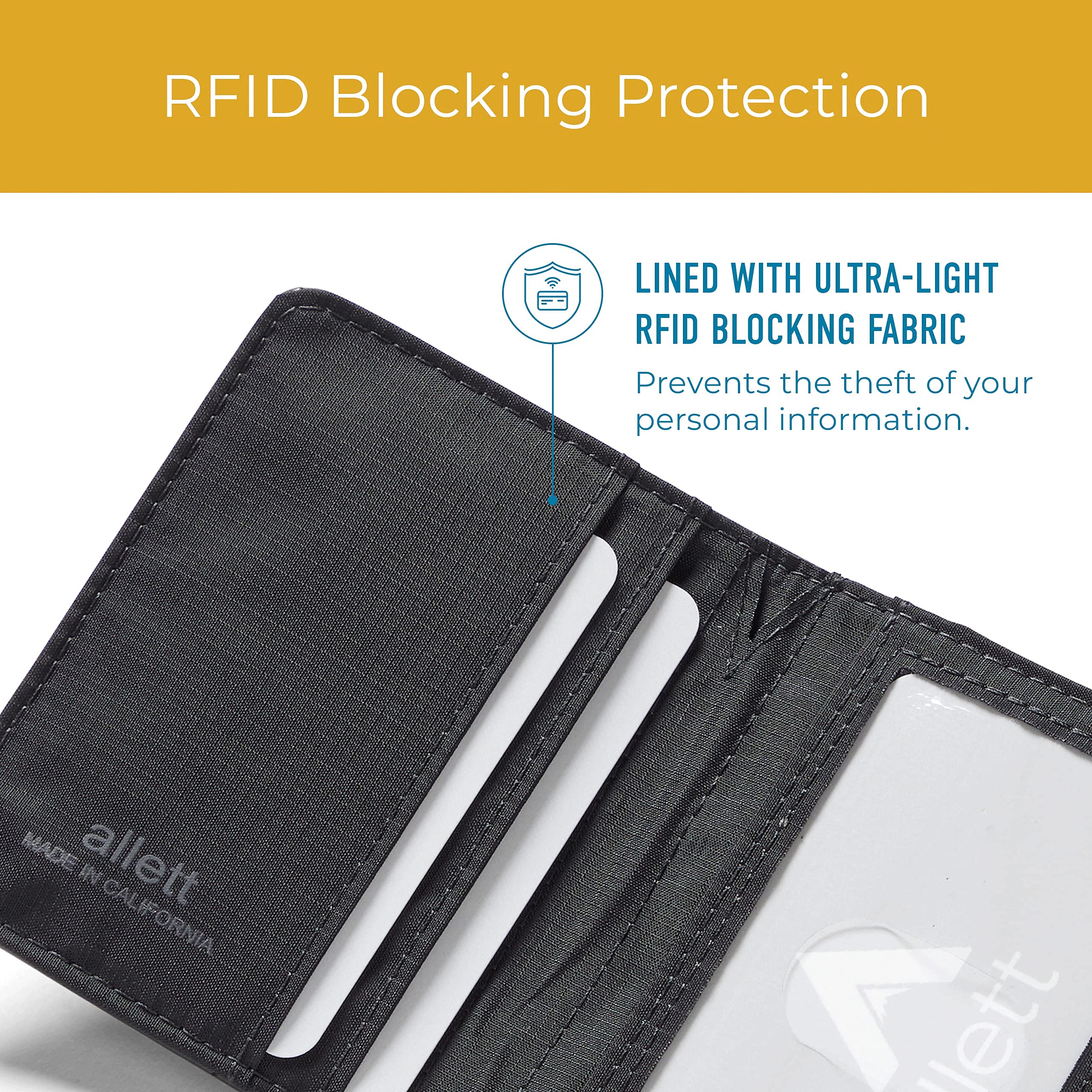 RFID THEFT PROTECTION: Being a victim of RFID skimming is a big pain. This form of theft uses high-frequency scanners to capture credit card & passport information from a distance. Allett RFID blocking wallets contain an ultra-thin layer of military-grade RFID blocking material to prevent information theft and give you peace of mind.
