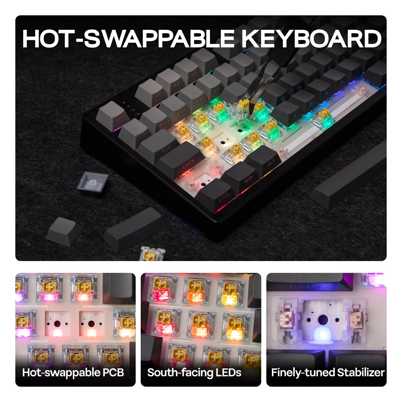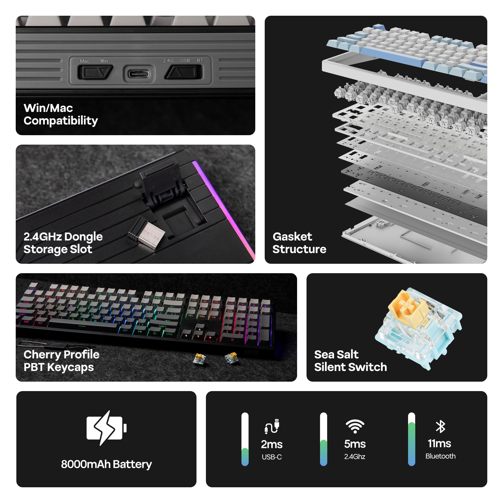 Long-Lasting Wireless Keyboard: Liberate your setup with the ultimate freedom of a stable wireless keyboard boasting the outstanding 8000mAh battery. Unlocking a realm of unrestricted movement and sustained performance with this tri-mode wireless keyboard, without frustrating cable drag hindering swift mouse movements, for seamless transition between up to 5 paired devices under cable, 2.4Ghz and Bluetooth modes. PC, Mac laptop, Android tablet or gaming console, whichever devices you game on, the 160-hour wire-free battery life make inconvenient mid-game recharge a worry in the past.