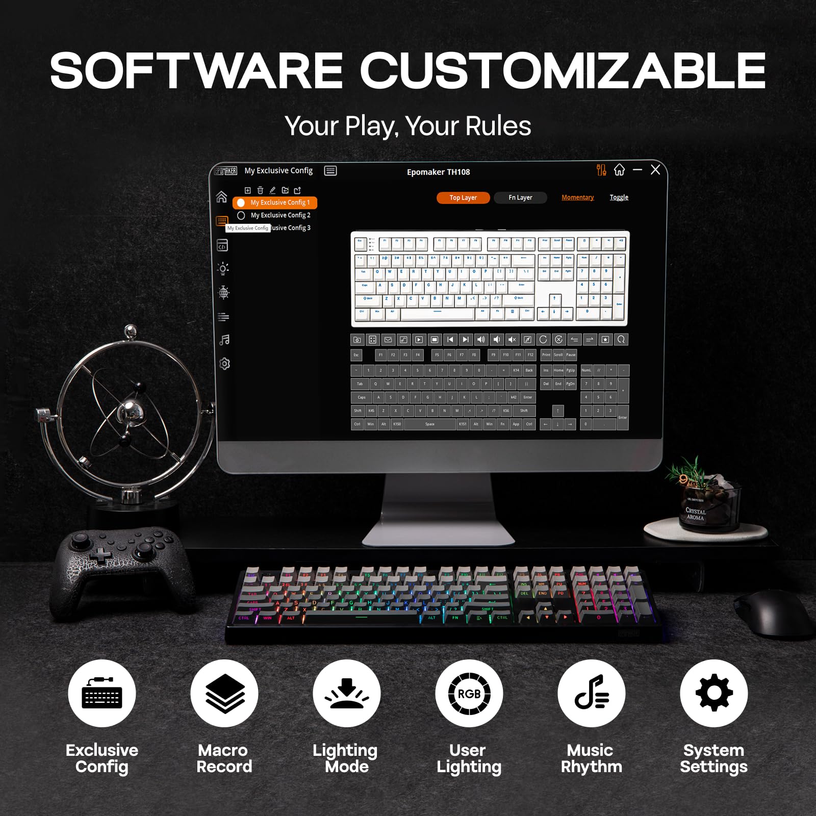 Hot-Swappable Custom Keyboard: Personalize functions, sounds and feel of each keystroke as you please, with the TH108 custom keyboard and its powerful setup. Try out the various typing style and acoustic feedback of mainstream 5-pin mechanical switches with the hot-swappable PCBA of TH108; and bask in the thocky melody of Creamy Jade or the tranquil silence of Sea Salt Silent switches of us, both of which factory-lubed, for out-of-box perfection. Experimenting the intuitive driver to configure layout, macros, backlight and sensitivity of keyboard, for the ultimate PC peripheral that matches your gaming style and workflow.