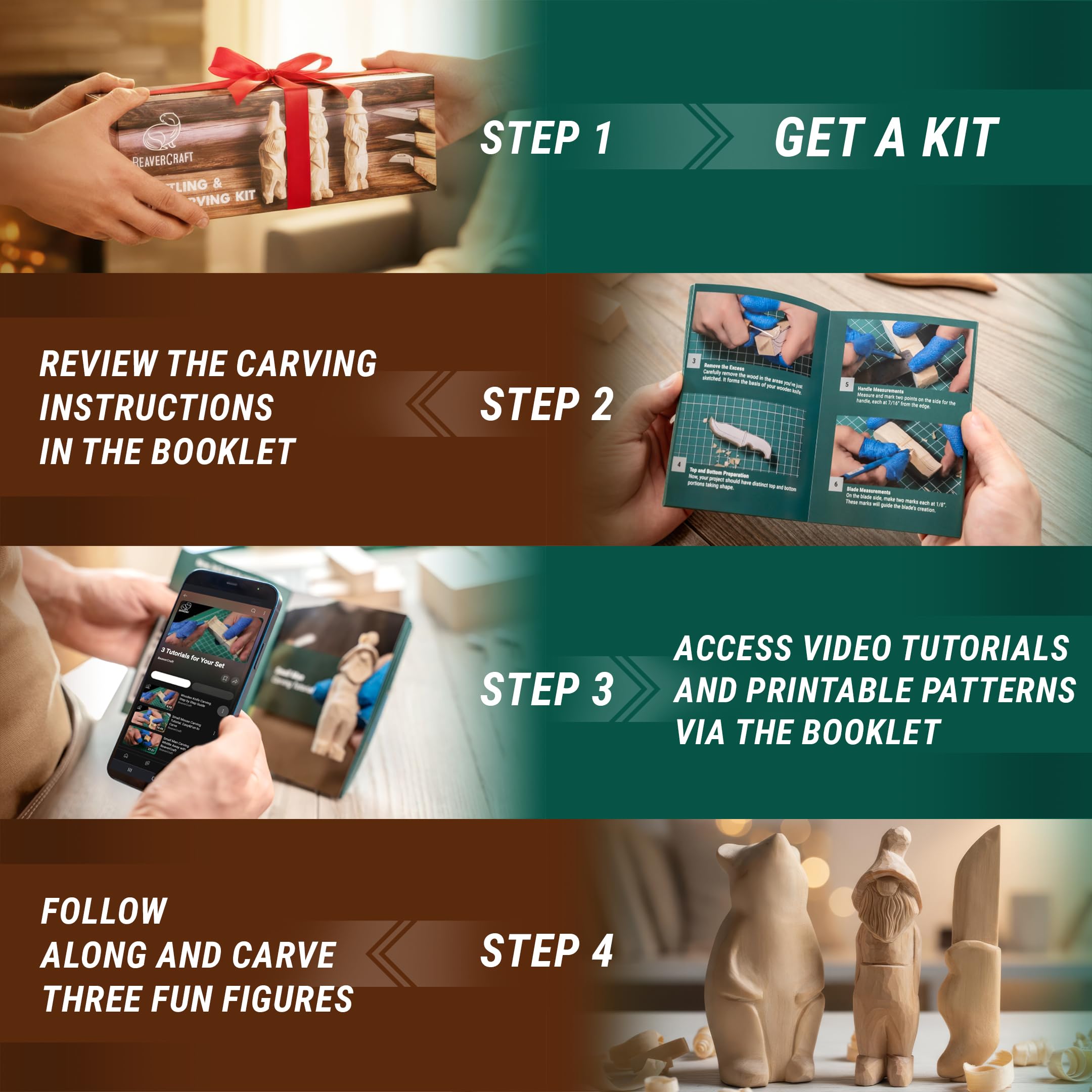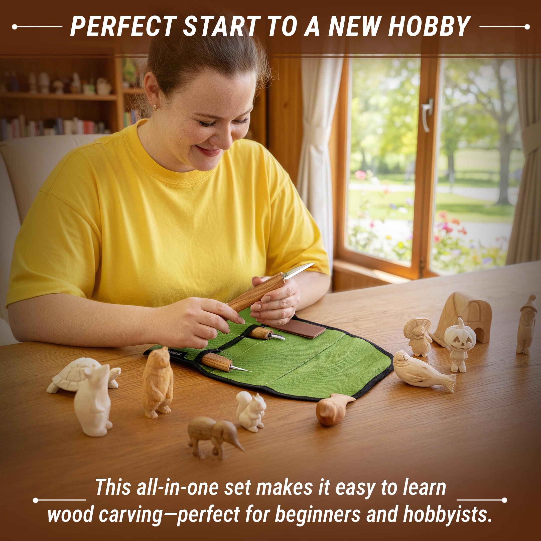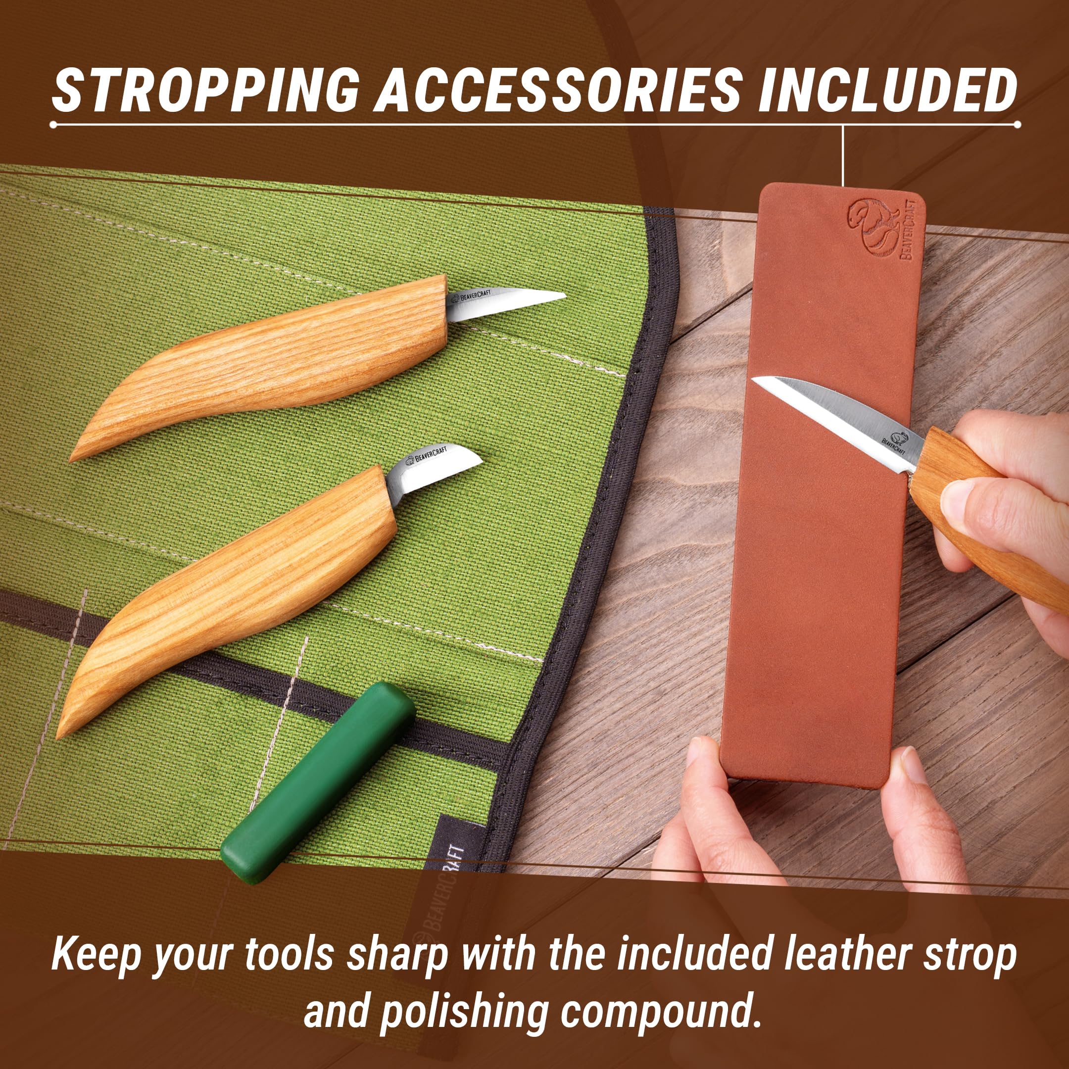 Wood Carving Kit Essentials: This carving set includes everything you need–a detail knife, chip carving knife, roughing knife, leather strop, polishing compound, canvas tool roll, and a step-by-step guide.