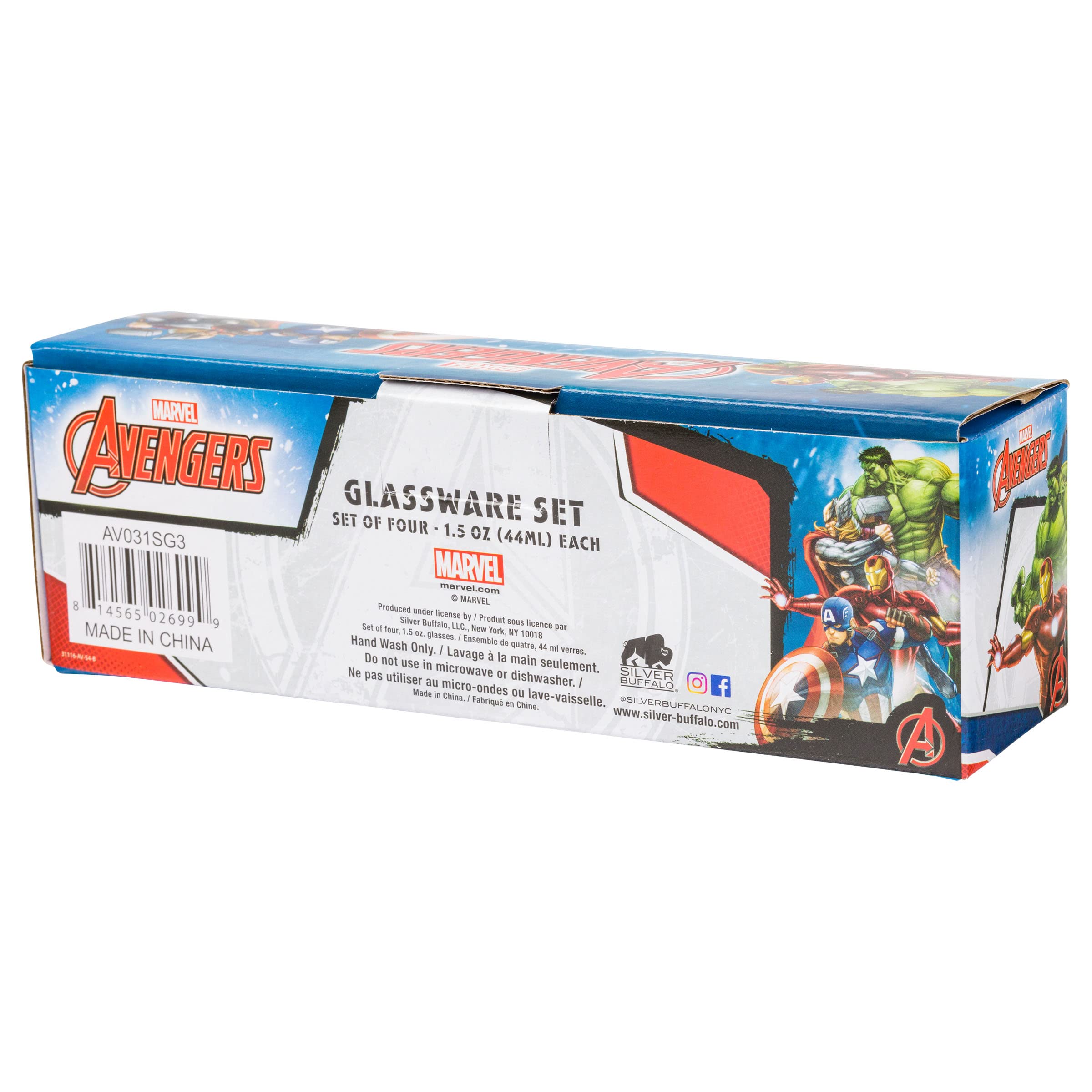 Have fun with your friends and loved ones with this classic Marvel 4-Pack 1.5 oz Mini Glass Set thanks to the Silver Buffalo Marvel Team Avengers 4pc Clear Mini Glass Set. This 4-pack of mini-glasses holds 1.5 oz of each of your favorite drinks. Make your party awesome with this cool Avengers 4pc. Mini Glass set of your favorite iconic Avenger characters. Mini-glasses are top-rack dishwasher-safe but are not microwave-safe; avoid using cleaners with bleach or chlorine within them. Have confidence knowing you are purchasing an officially licensed Marvel product from Silver Buffalo. This mini-glass set makes a great gift for all the Marvel fans in your life; whether it’s for girls, boys, kids, or adults. Great for any occasion whether it is Christmas, Birthday, or Housewarming gift. Working in collaboration with licensors and brands, Silver Buffalo develops unique, creative, and ground-breaking products with a devotion to detail and innovation, while staying true to current trends. Silver Buffalo prides themselves on manufacturing and distributing exciting products that connect with the child or fan(atic) in all of us. We focus on the design, manufacture, and distribution of items featuring popular cultural icons. Silver Buffalo features all of your favorite comic heroes, cartoon characters, board games, movies, and more. #TAG: Housewarming, Gifting, Party decorations, Collectable, Party decor, Celebration, Espresso, Drink-ware, 4-Pack, Glass set, Single Sip, Christmas, Glass, Glass cups, Mini Glass Set, Mini Glasses, 4 pc. glass set, 1.5oz glass set, Marvel, Avengers, DC Comics, Iron Man, Captain America, Hulk, Thor, Super Hero
