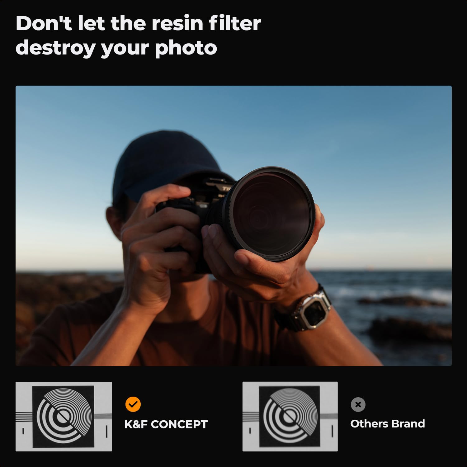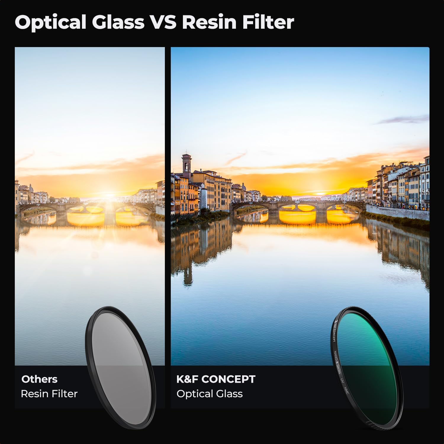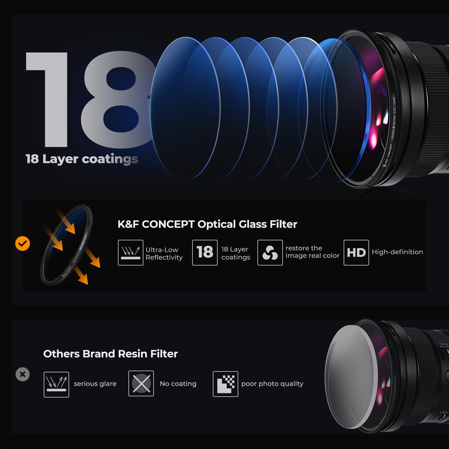 Exceptional Optical Glass: The K&F CONCEPT lens filters are meticulously crafted from top-tier optical glass, featuring 18 layers of nanometer coatings. These coatings excel at reducing reflections, preserving the genuine colors and remarkable quality of your images. With a CNC frame design that enhances friction, installing and removing filters is swift and hassle-free.