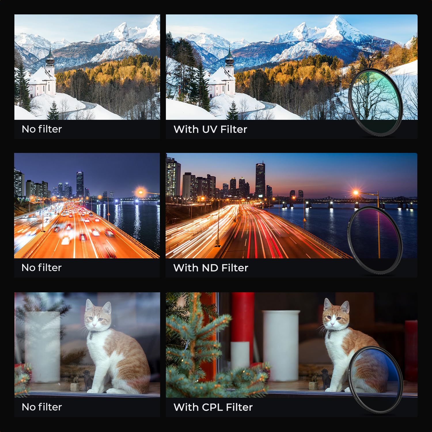 Complete Kit for Pro-Grade Photography: The K&F CONCEPT comprehensive lens filters kit boasts a UV filter, a CPL polarizer filter, and a neutral density filter (ND4). Additionally, it includes a dedicated filter pouch and a microfiber cleaning cloth, ensuring you have the tools needed for flawless photography.
