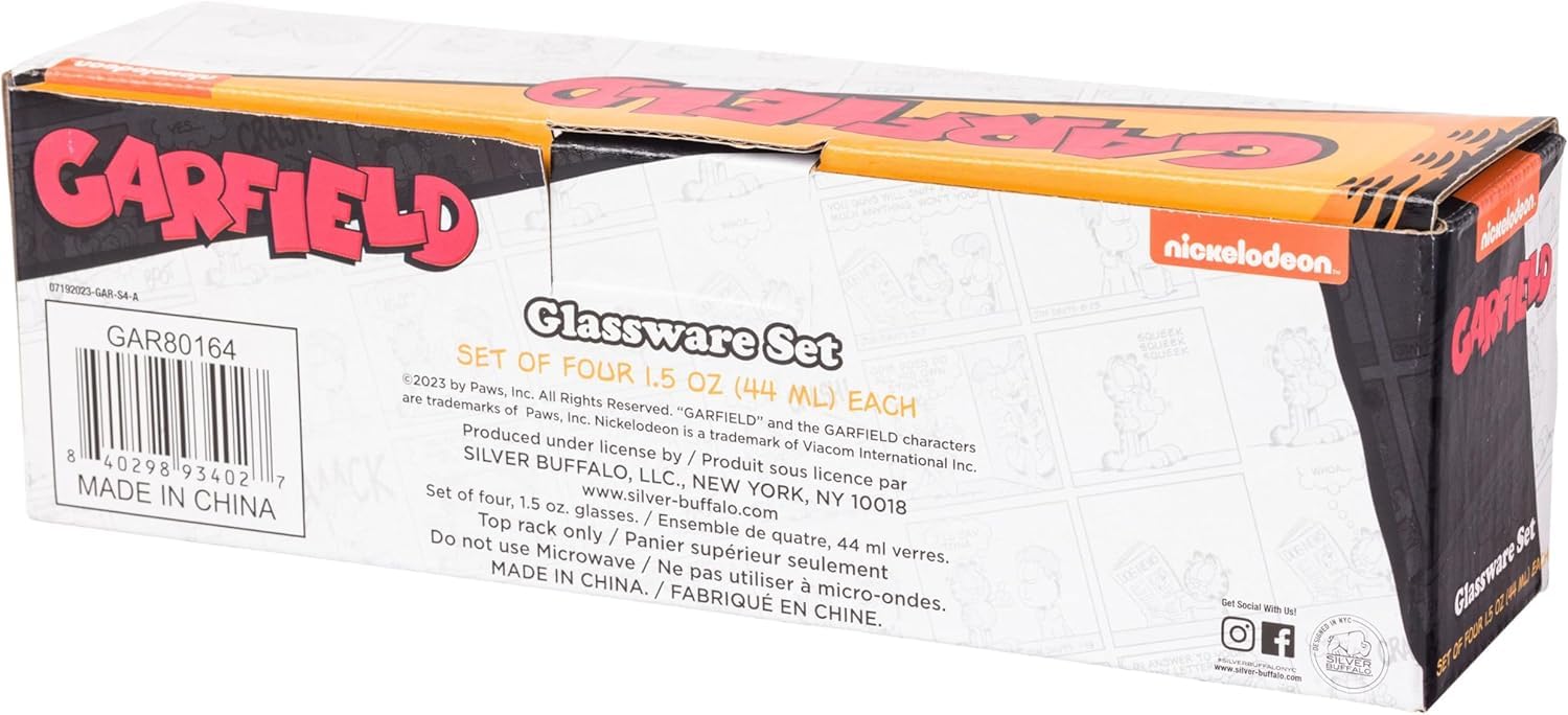 Take a trip to your childhood with this Garfield mini glass set! These mini glasses feature Garfield in a variety of poses. Garfield is shown posing with Odie and next to phrases such as “This is my happy face” and “100% that cat.” Mini glass set comes with 4 glasses, 1.5 ounces each. Great to enjoy drinks with friends, or as a Garfield collectors item. These glasses are NOT microwave or dishwasher safe. HAND WASH ONLY. Looking for the perfect gift? Novelty mini glass set is unique, colorful, and features Odie and Garfield. Great for birthdays and other holidays. This mini glass set also makes a wonderful housewarming gift for Garfield fans. Take a dive into the fictional world with Silver Buffalo! Silver Buffalo provides fans with official merchandise from their favorite characters. Working alongside licensors and brands, we create unique and imaginative products which are designed with great care and detail. Silver Buffalo aims to connect fans to their favorite cartoon characters, superheroes, movies, tv-series, and more. Celebrate your fandom!