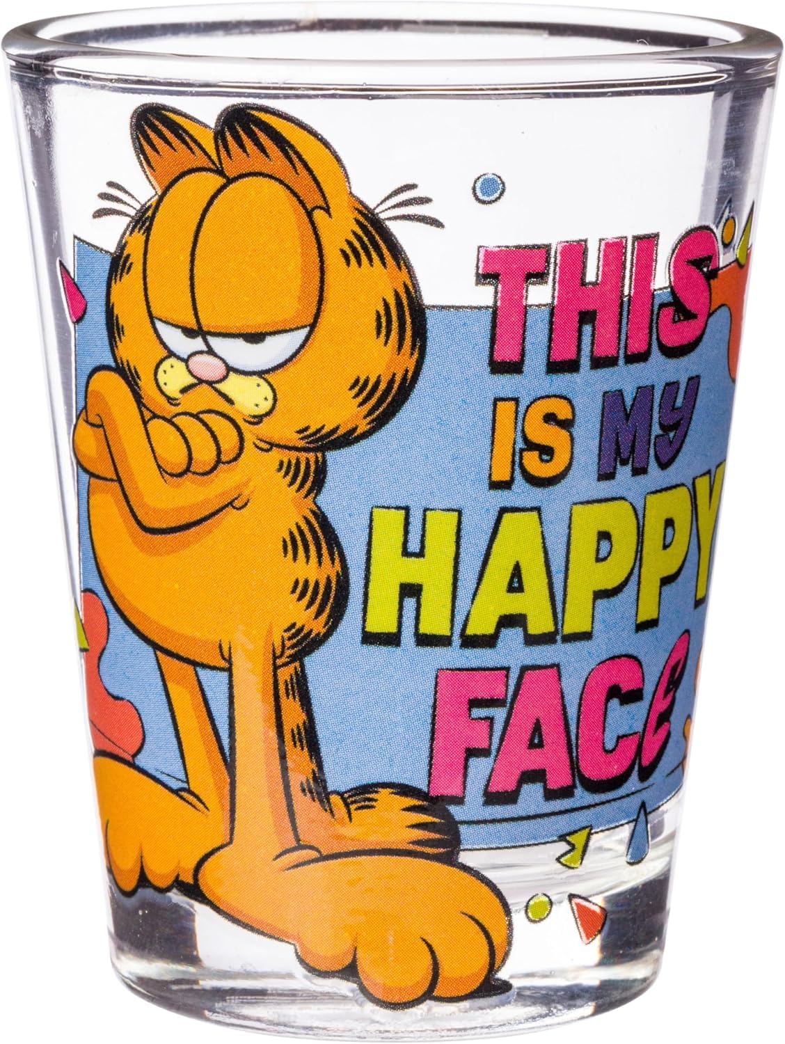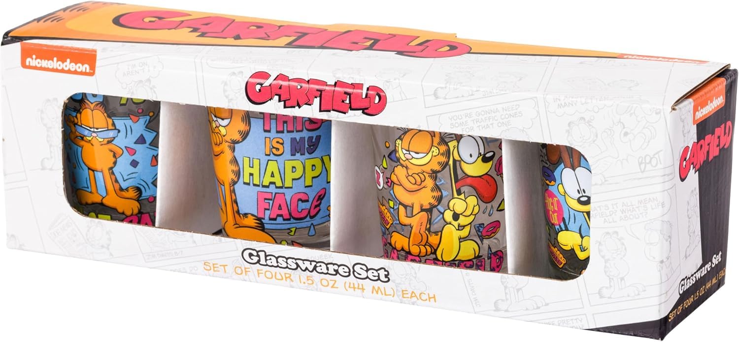 GARFIELD MINI GLASS SET: These mini glasses feature Garfield in a variety of poses. Garfield is shown posing with Odie and next to phrases such as “This is my happy face” and “100% that cat.”