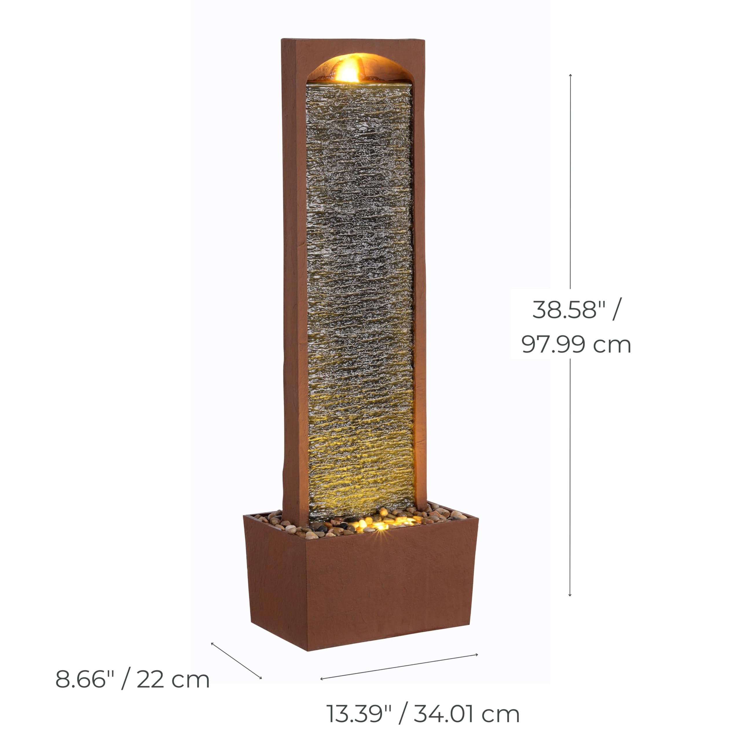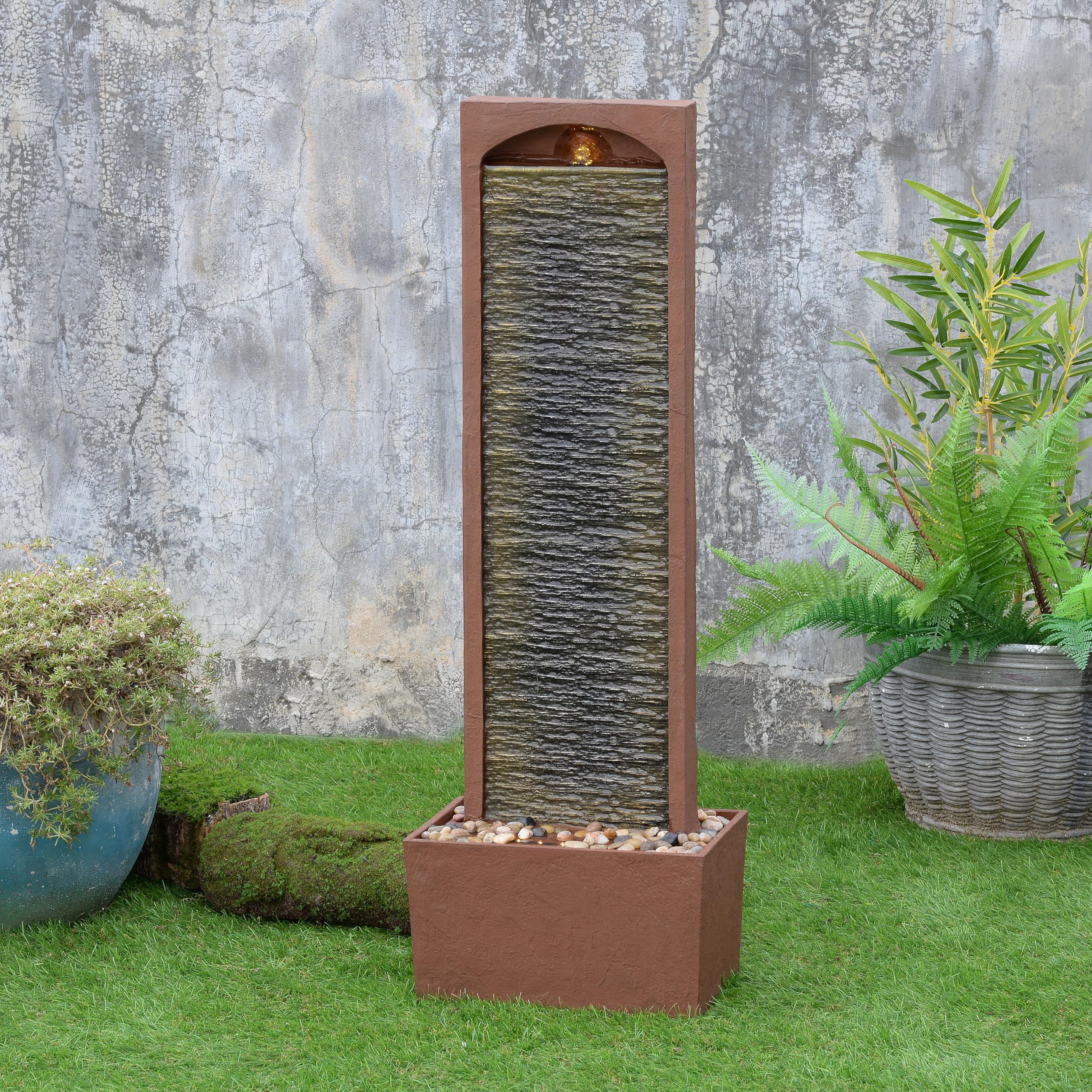This modern red rock frame with a textured facade waterfall fountain features an LED light element at the top, drawing attention to where the water begins its descent. Water trickles down the wall into the pebbled base for a soothing sound that creates a tranquil atmosphere on decks, patios, and other outdoor living spaces. Enjoy more time outdoors benefitting from your Zen-like environment, this contemporary decor elevates your spaces.
