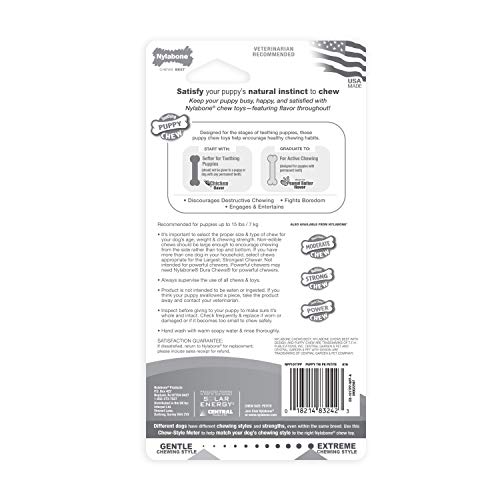Encourage positive chewing habits from the start with our Peanut Butter and Chicken Chew Toy Twin Pack! Easy for the tiniest dogs to hold and carry, each long lasting chew toy is packed with flavor: one in yummy peanut butter and the other in irresistible chicken. Your puppy will love this sweet-and-savory combo. These dog chew toys are made of softer, flexible material just for puppies! Plus, the bristles raised during chewing promote clean teeth and help control plaque and tartar buildup. Start your teething puppy off right with our sturdy chew toys! What your dog chews matters! With destructive behavior among the leading reasons dogs are returned to shelters, we know healthy habits can make a life-changing difference. For 70 years, our family-founded brand continues to safely satisfy dogs’ chewing instincts and help them stay in loving forever homes!