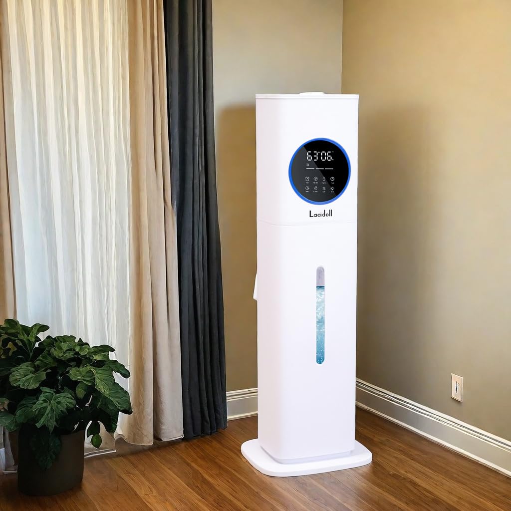 [Sleep Mode & Night Light & Diffuser Function] This floor humidifier features a Sleep Mode for undisturbed dreams, with the the panel completely dark. It operates quietly at 30 dB and will automatically shut off once the water runs out, making it safe to use in baby rooms and bedrooms. The 360° rotating nozzle allows for customized mist flow direction without having to pick up the humidifier, while the aroma box can support the use of essential oils for a delightful fragrance.