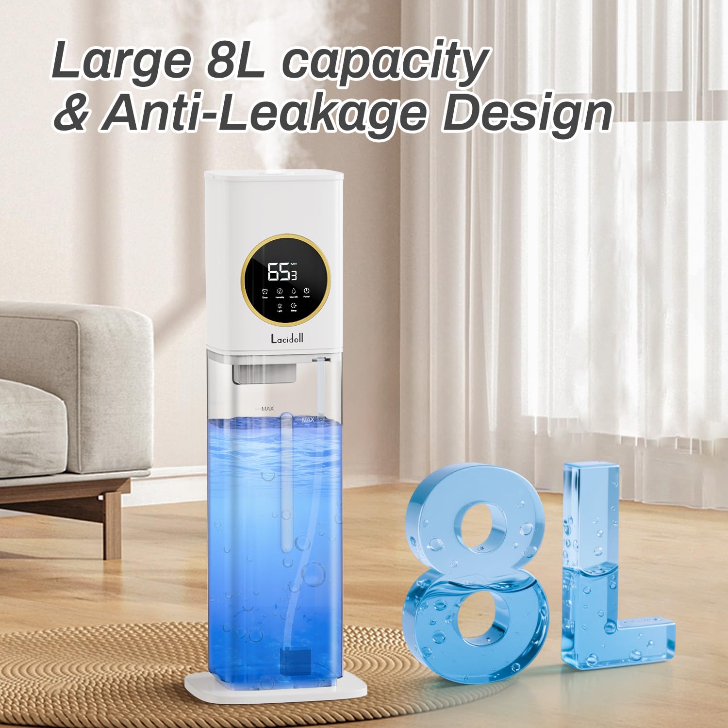 [Large Capacity & No Leakage & Top Filling Design] The humidifier features a 2.1-gallon removable large capacity tank and a top-filling anti-leakage design, effectively solving the leakage problem and making it easy to refill. 300mL/h high moisture output is designed to humidify the air for cover up to 800 sq.ft ,better relieve air and skin dryness.Additionally, its long, slim body allows for use in any room without taking up too much space.