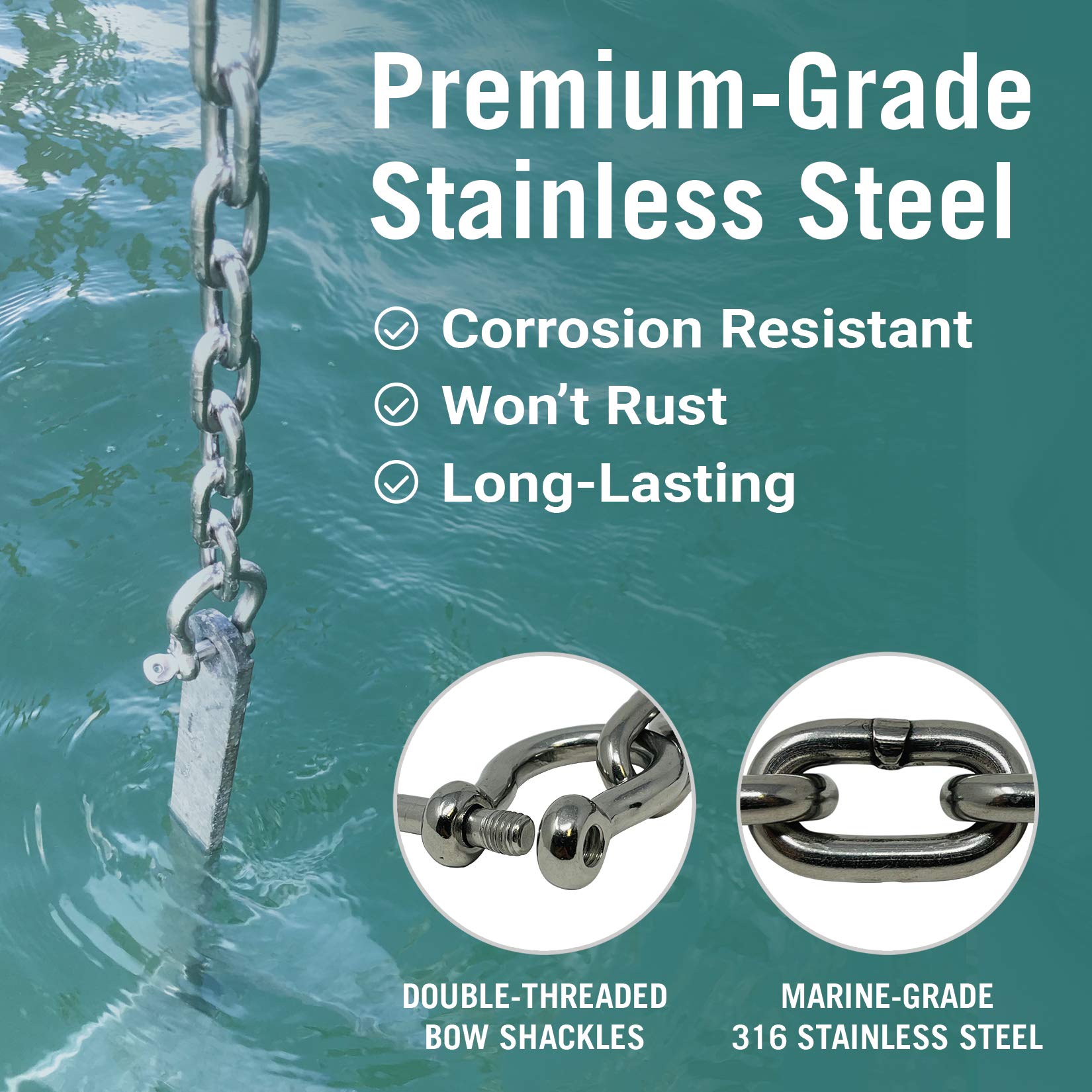 HEAVY DUTY MATERIAL: Our 5/16" by 5 foot stainless steel anchor chain is highly durable and resistant to corrosion, making it perfect for marine environments. 316 Stainless Steel which outlast PVC coated anchor chain options.
