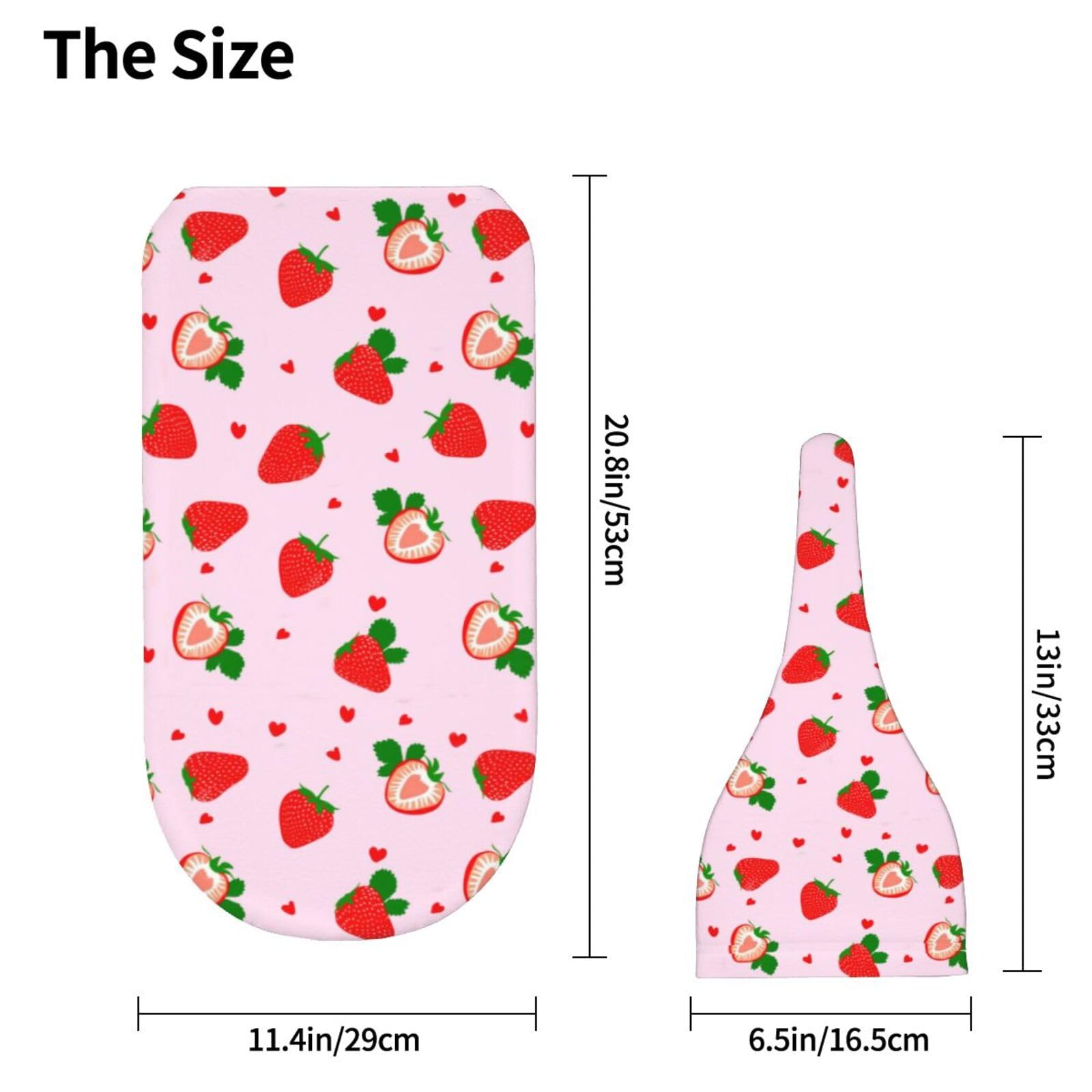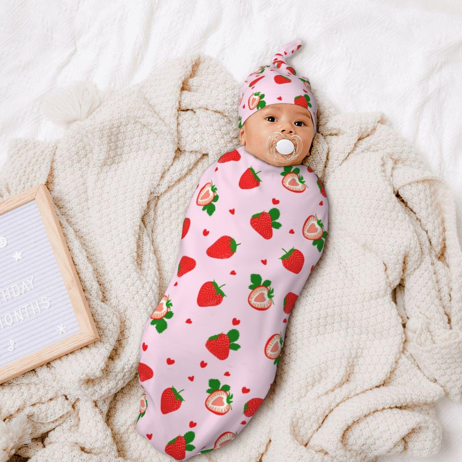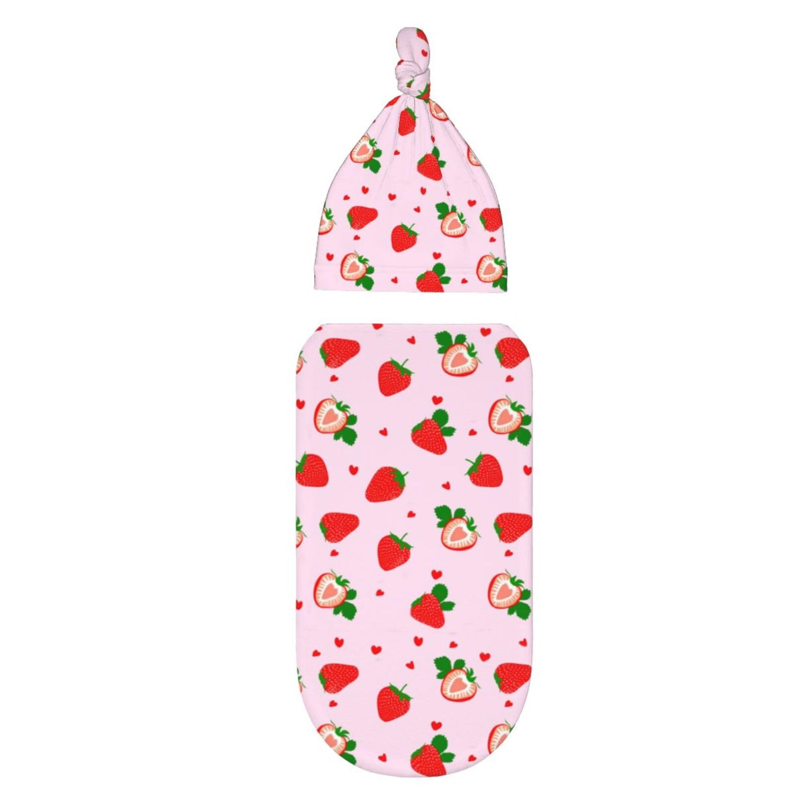 strawberry Swaddle blanket is 20.8"x11.4"inch, hat is 13"x6.5"inch. is made of polyester, The Fabric Is Soft And Elastic, Comfortable.The hat is an adjustable knot on the top, which can be tightened or loosened as needed to ensure comfortable wear for newborns.
