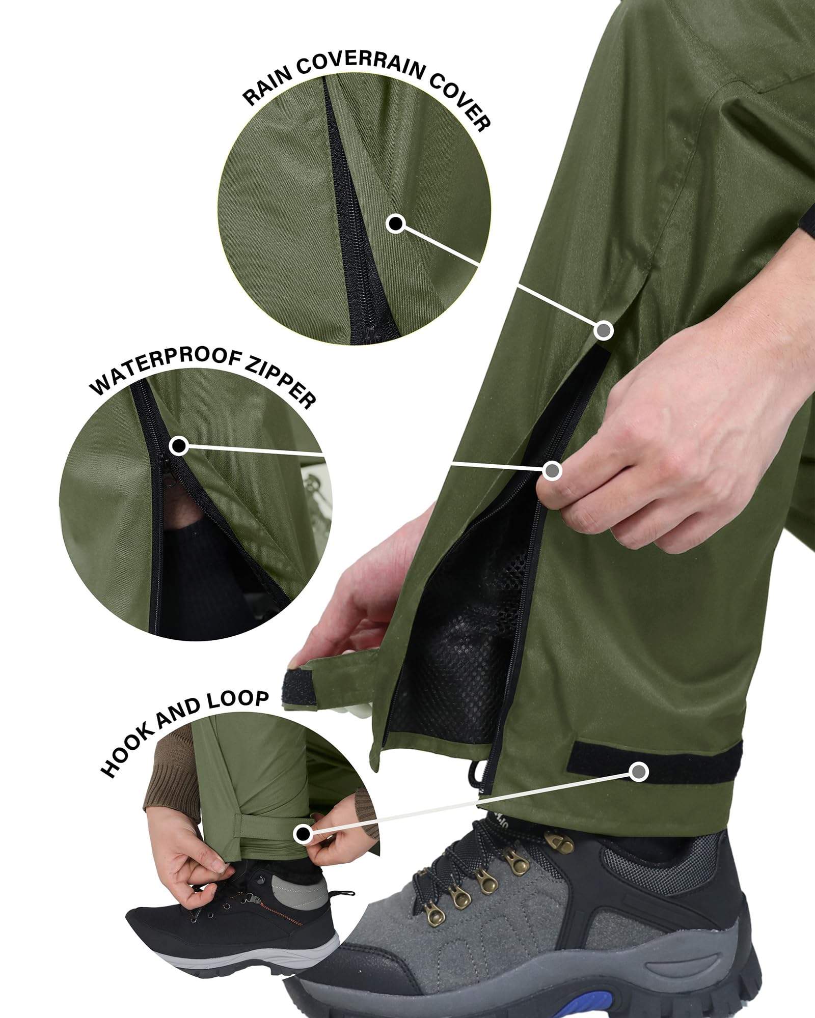 Comfortable Fit: The rain pants are designed with zipper openings on the legs to easily put on and take off boots and shoes. The hook and loop on the legs is adjustable. There's a soft mesh layer in the lining, comfortable and breathable