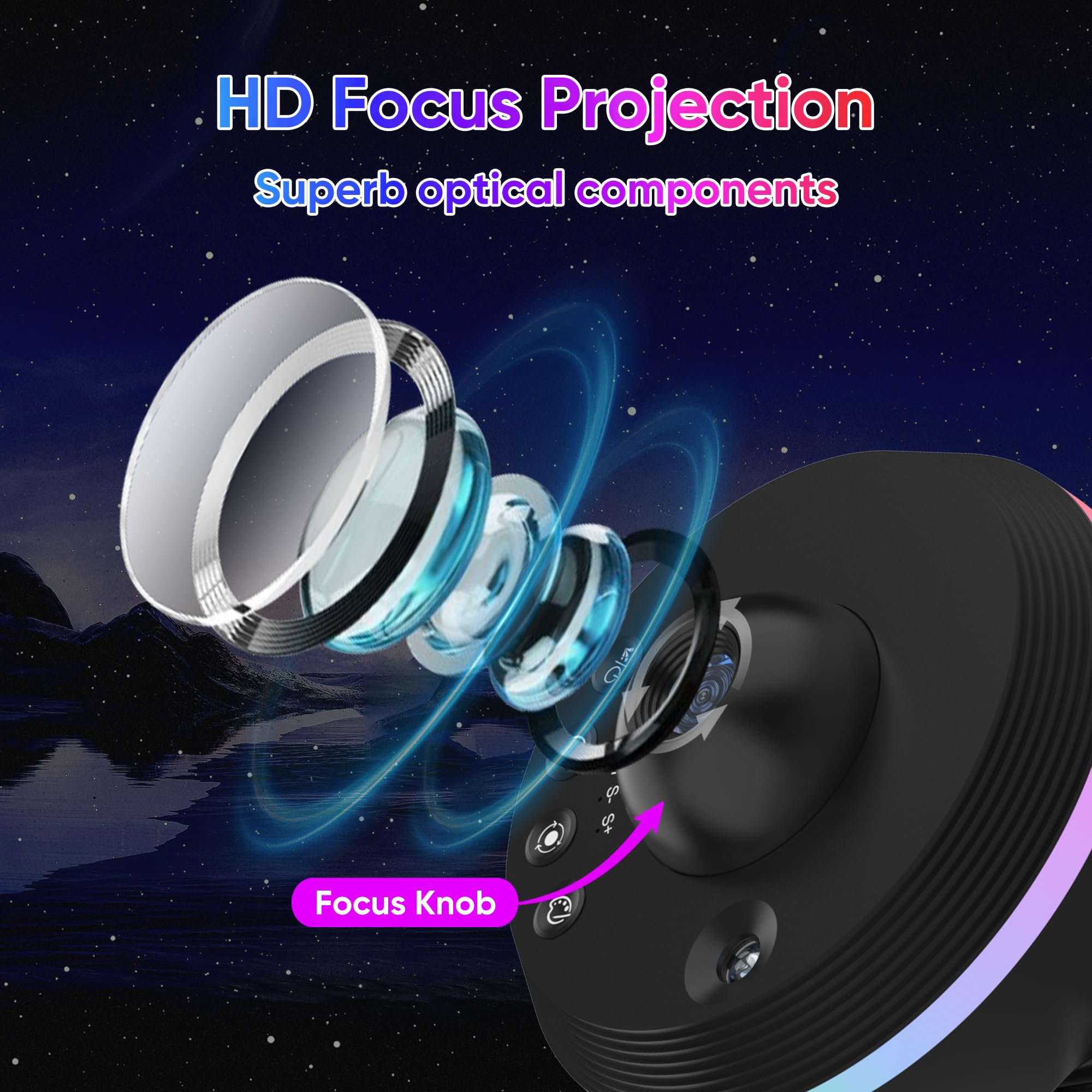 4K HD Projection & Adjustable Focus : Adopting advanced multilevel wide-angle glass lenses for 4K ultra-clear projection to bring you a realistic starry sky. Rotating the top focusing head to adjust image clarity regardless of the projection distance. Support a projection distance from 6.56ft to 9.84ft and an area from 135.19sq.ft to 255.64sq.ft. The solar system projector can be projected onto the ceiling, walls, and floors.