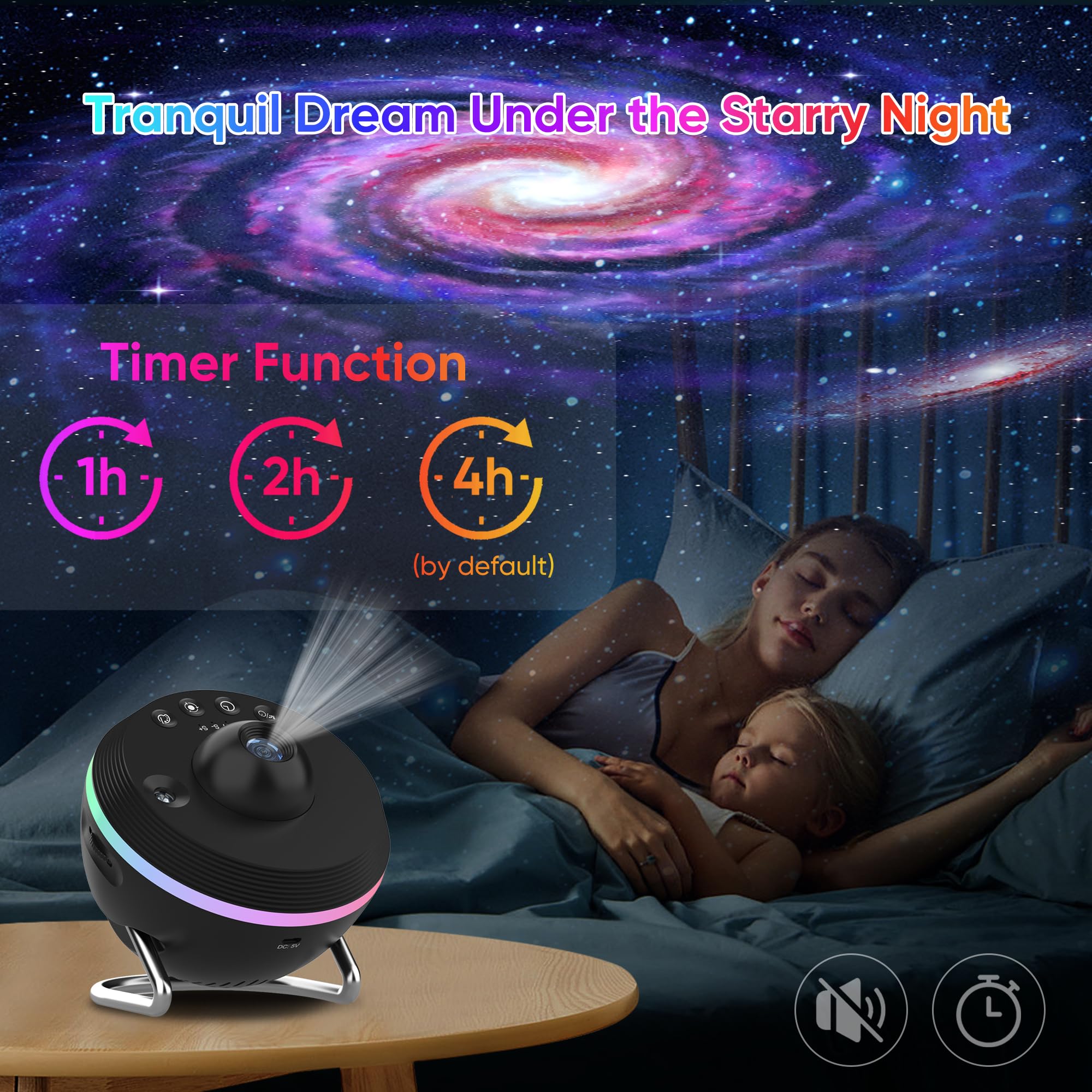Super Quiet & Auto-Off Timer Design: The timer allows you to set the ceiling projector to turn off automatically after 1 or 2 hours, ensuring energy efficiency and peace of mind, especially if used as a sleep aid. If you forget to set the timer, it will automatically turn off after 4 hours.Its silent operation ensures that the mesmerizing starry projections and ambient lighting create a calming atmosphere without any distracting noise.