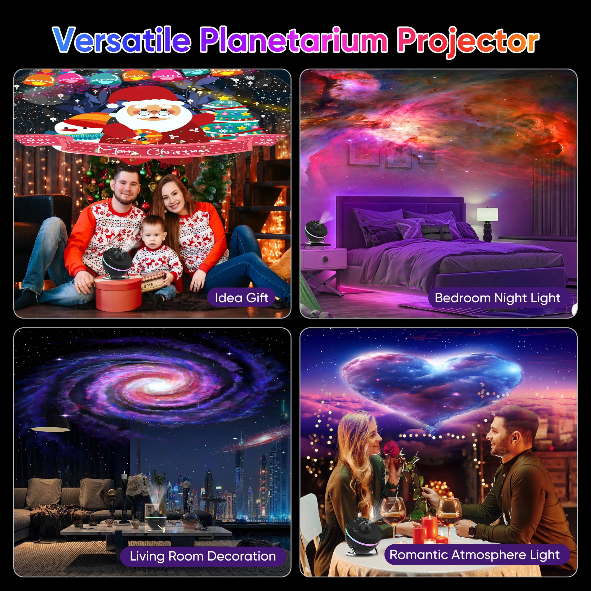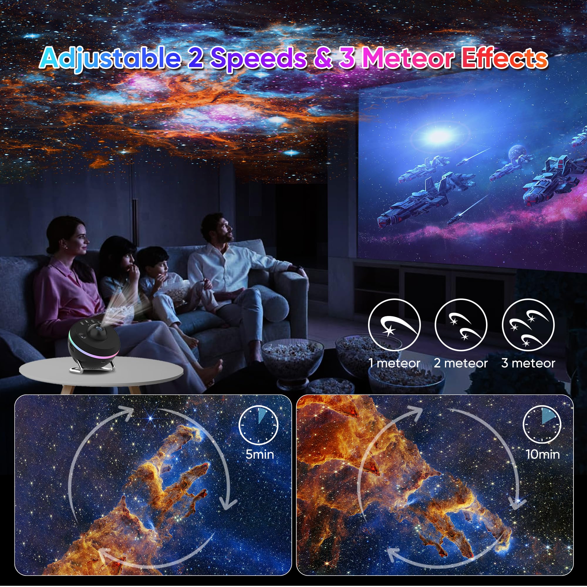Upgraded Planetarium Projector with Meteor Effect : Built-in meteor fall effect creating a romantic atmosphere. This galaxy projector for bedroom comes with 13 replaceable film discs: Earth, Solar System, The Milky Way, Pillars of Creation, Black Hole, 0bservable Universe, Cosmic 'Winter' Wonderland, The Orion Nebula, Dinosaur, Marine Organism, Valentine's Day, Christmas, Moon(In-built).