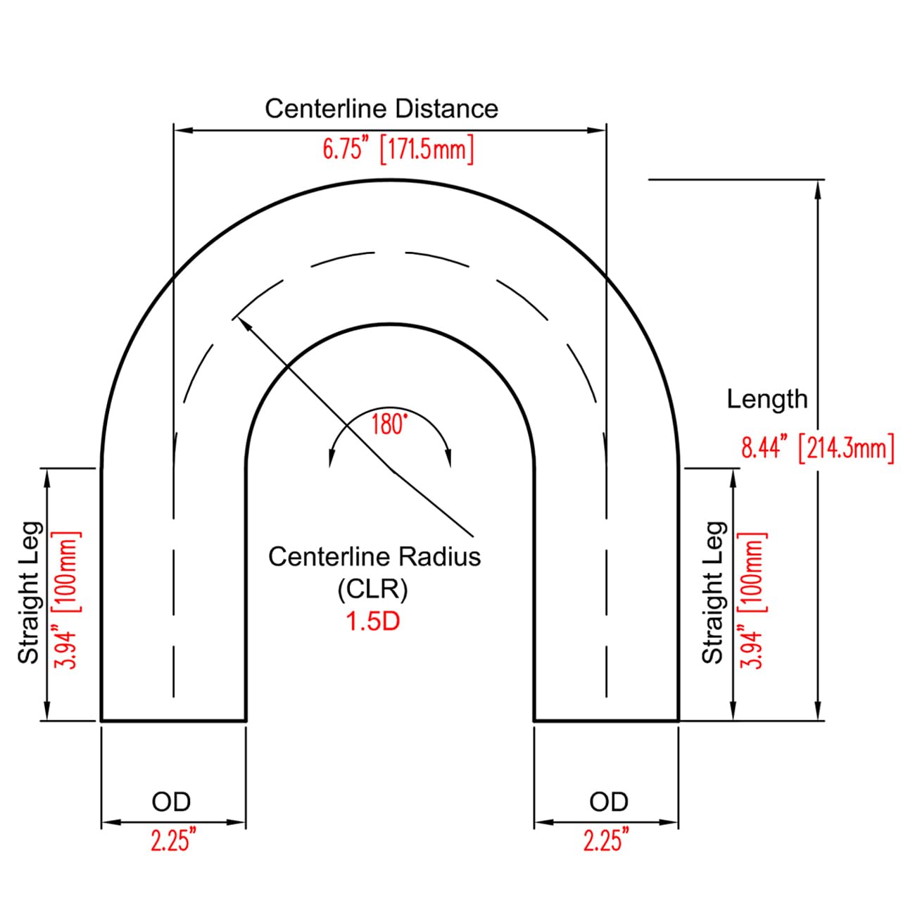 180 degree mandrel-bent aluminum intercooler piping. Outside diameter: 2.25" (57mm), straight leg length: 3.94" (100mm), wall thickness: 0.071" / 1.8mm