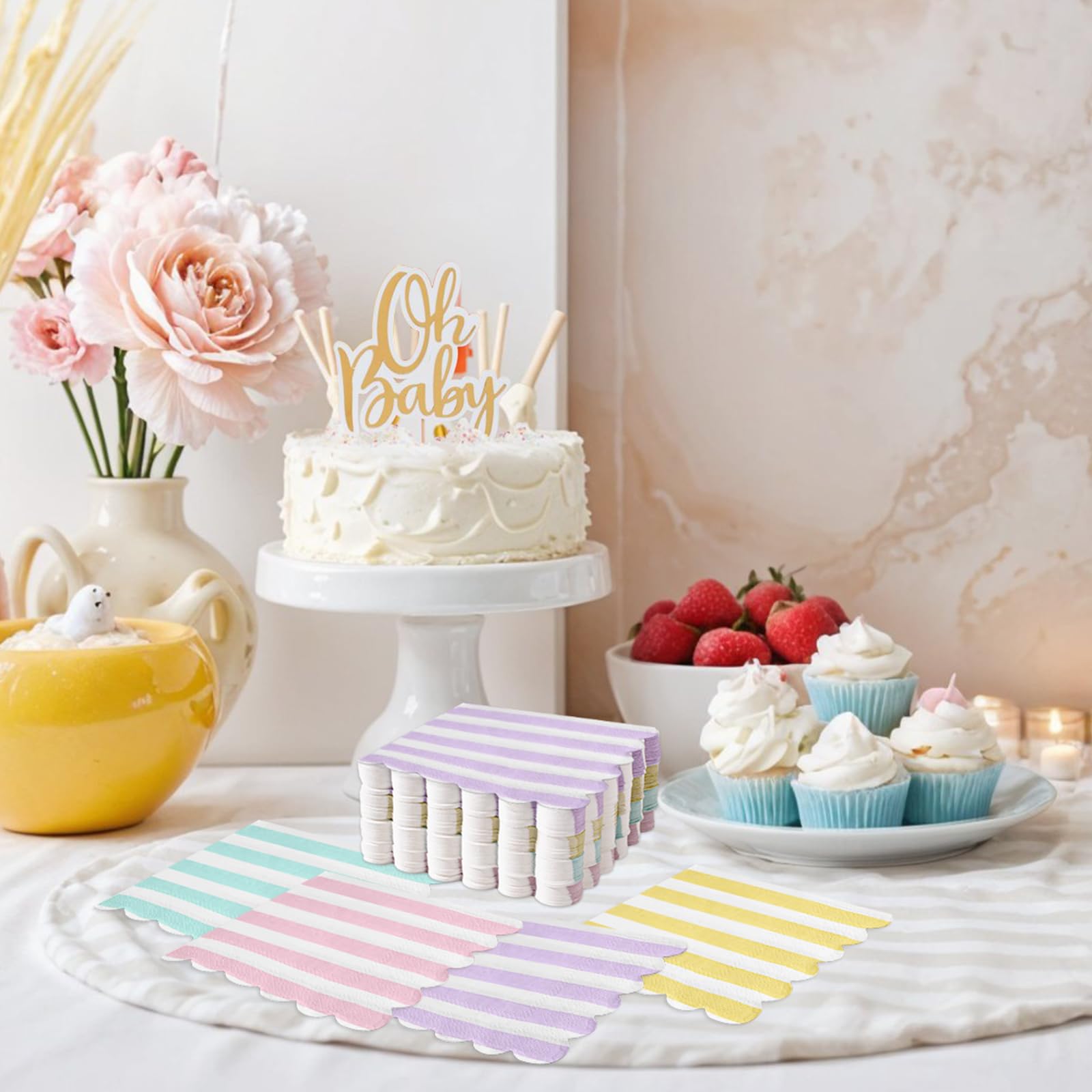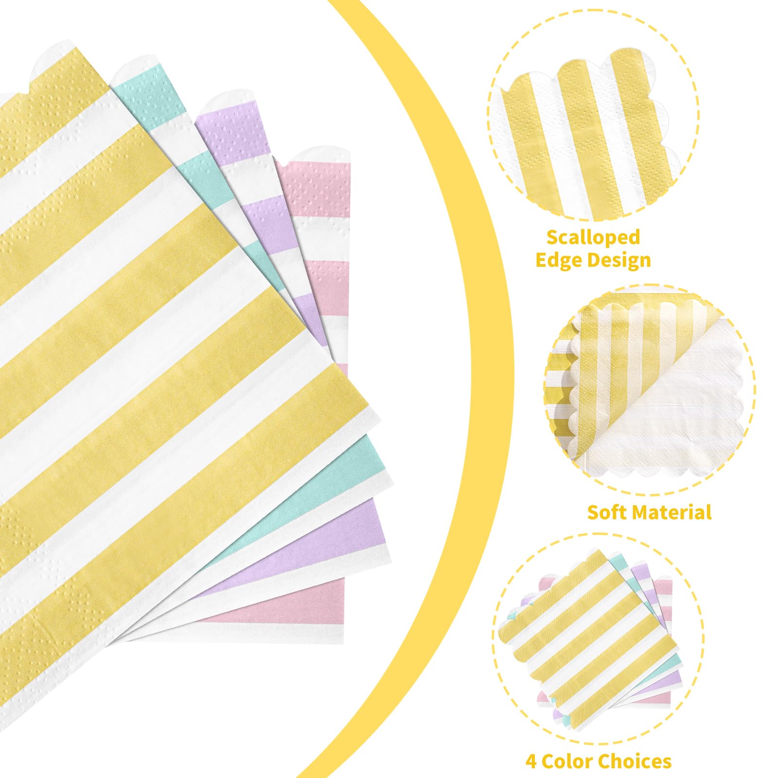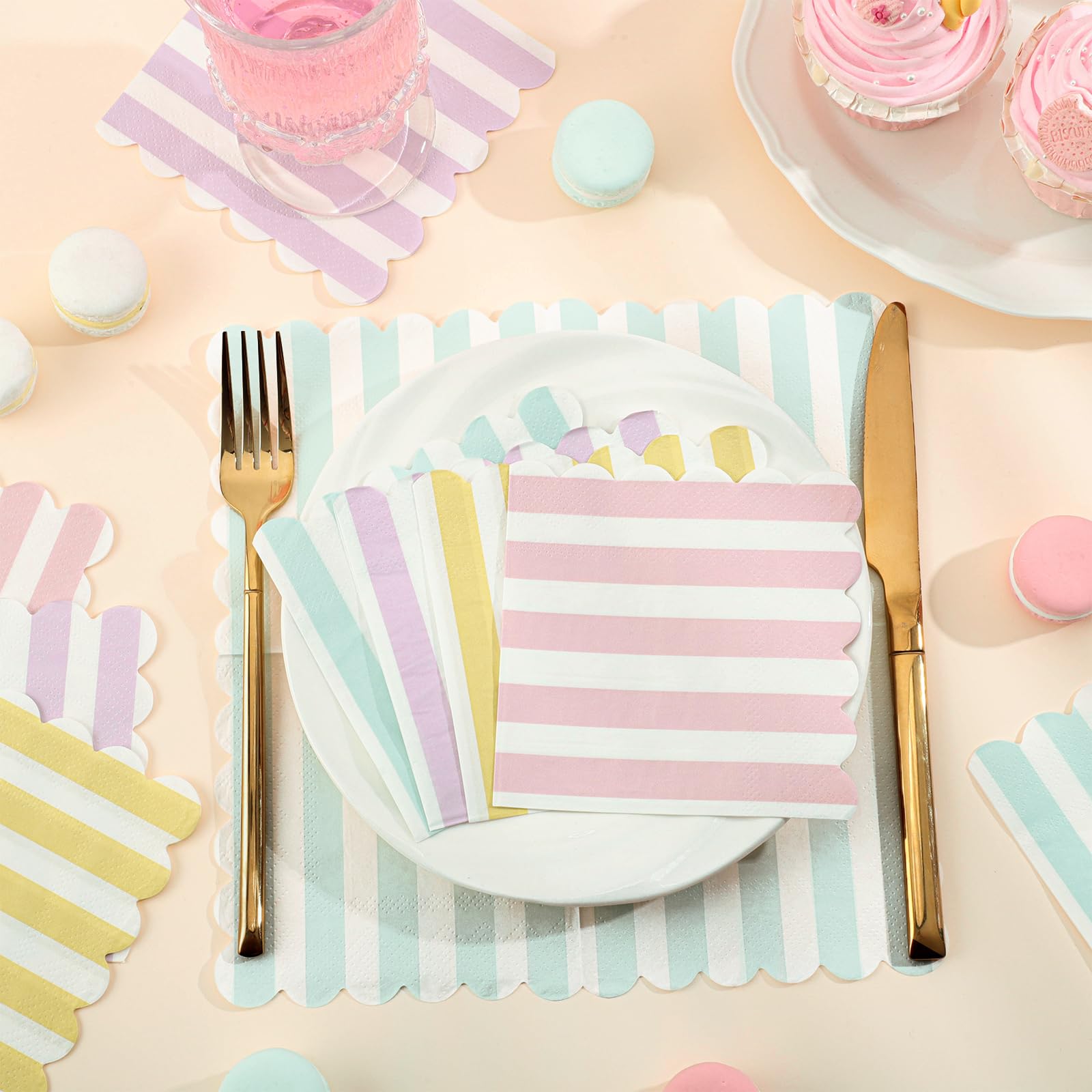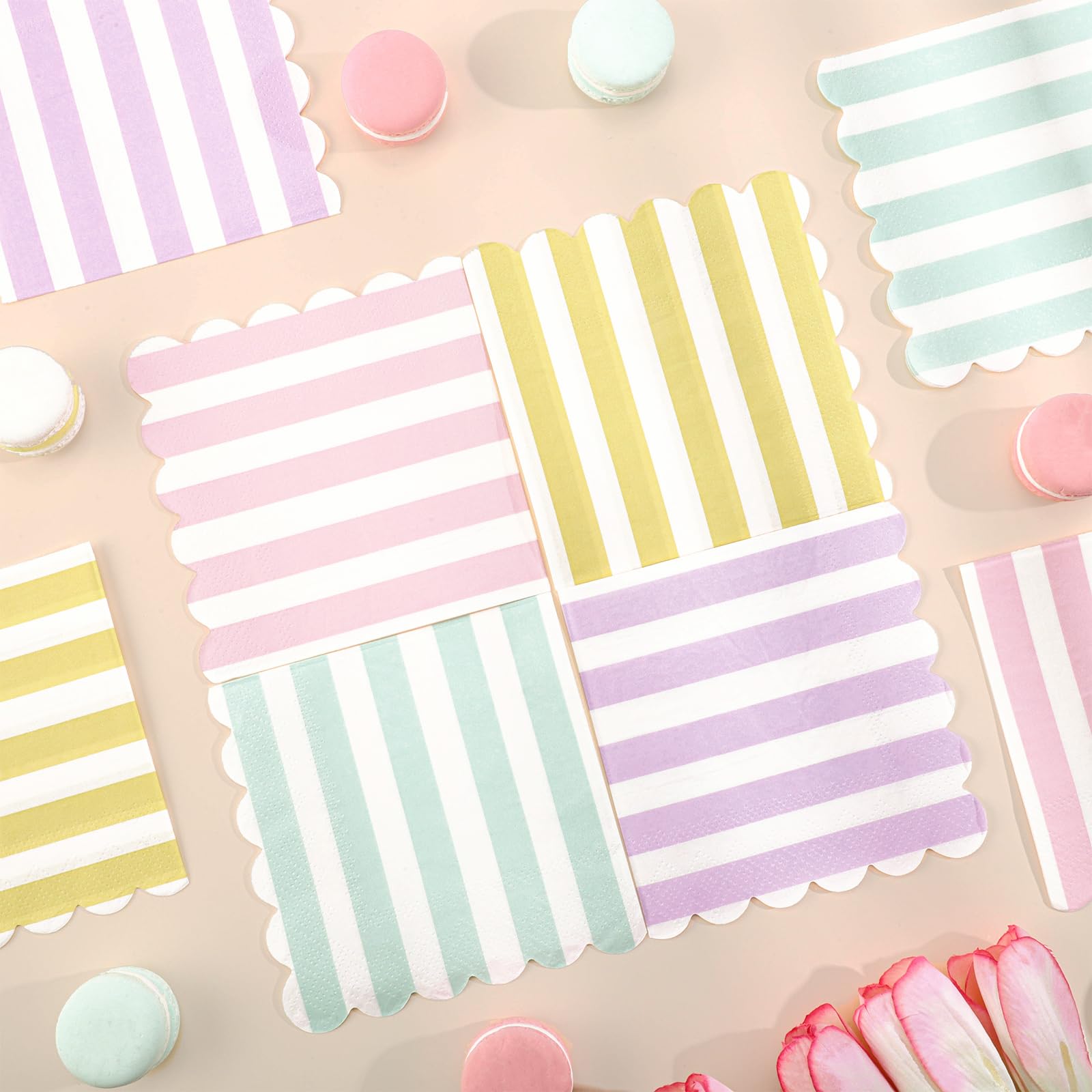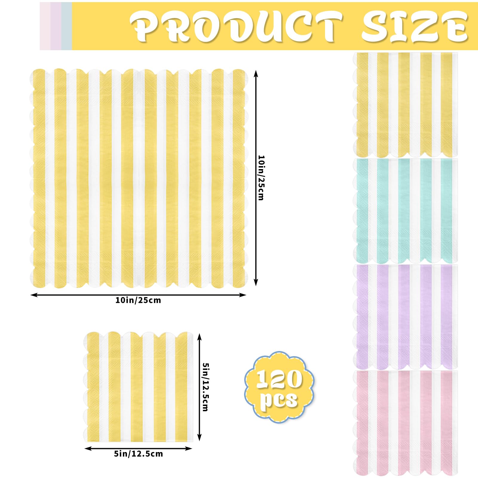 Scalloped Napkins Size:Striped paper napkins measure approximately 12.5 x 12.5 cm/ 5 x 5 inches folded and approximately 25 x 25 cm/10 x 10 inches unfolded. Pastel party napkins are great for table decoration and daily cleaning