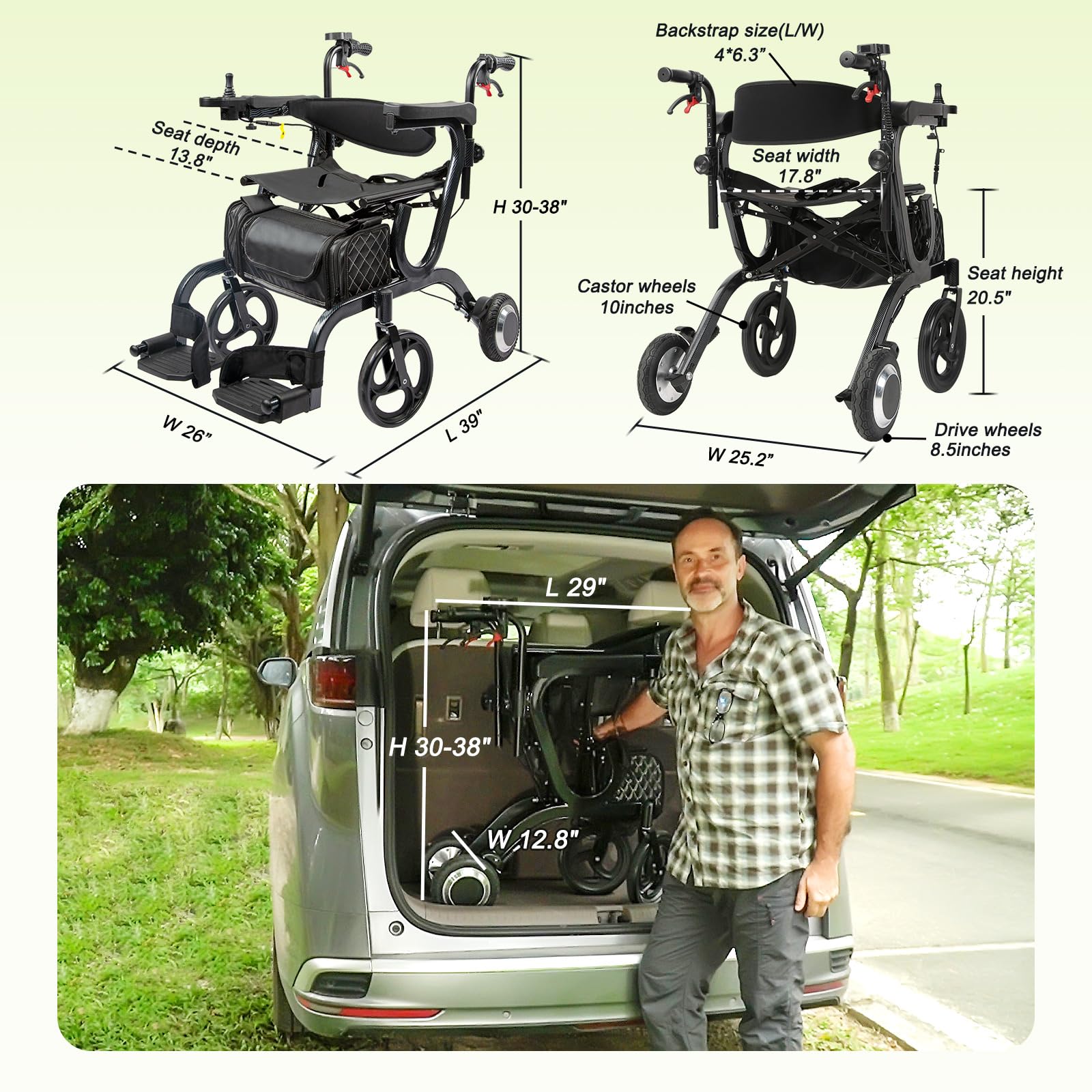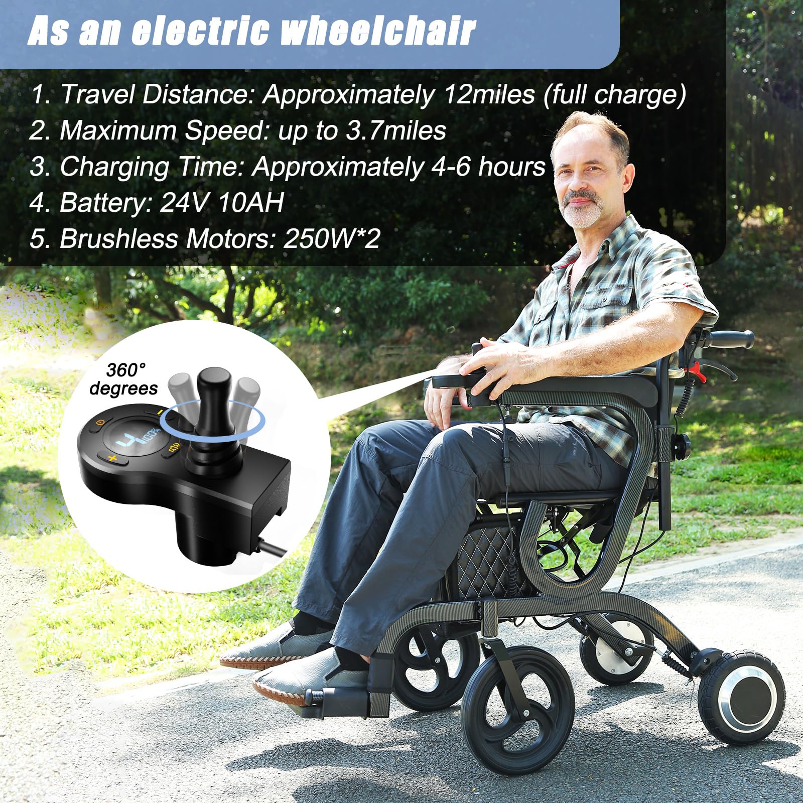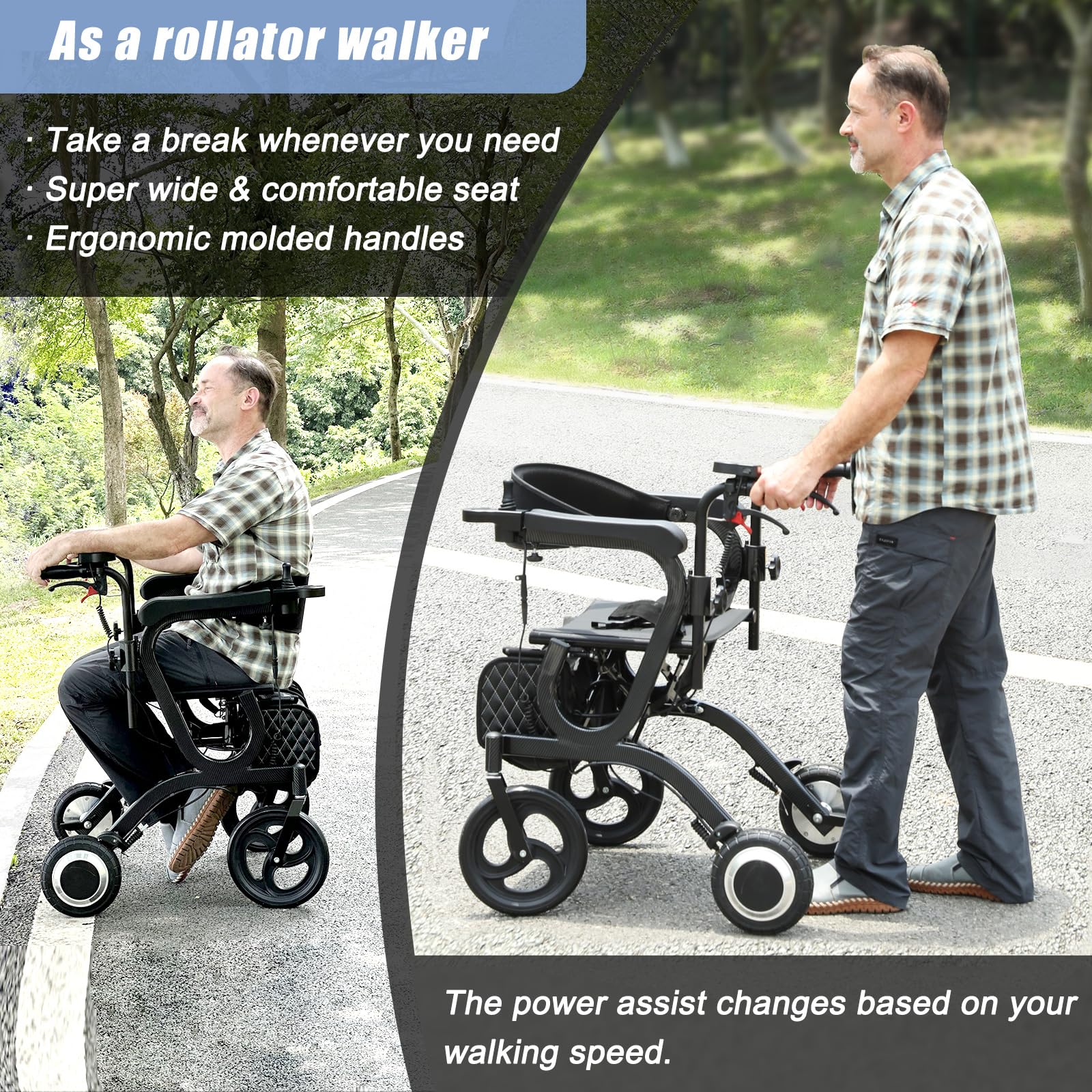 【Three-in-one rollator walker】 Carlike is a multifunctional wheelchair that can be used as an electric wheelchair, arollator walker with seat, and a transport wheelchair. It comes with two controllers for versatile use. It is equipped with two high-performance brushless motors (DC 250W × 2, totaling 500W) and a lithium-ion battery. The 10-inch large wheels provide excellent climbing ability and performance on various terrains. Made from aerospace-grade aluminum alloy, it has a sturdy structure and a maximum load capacity of 265 lbs.
