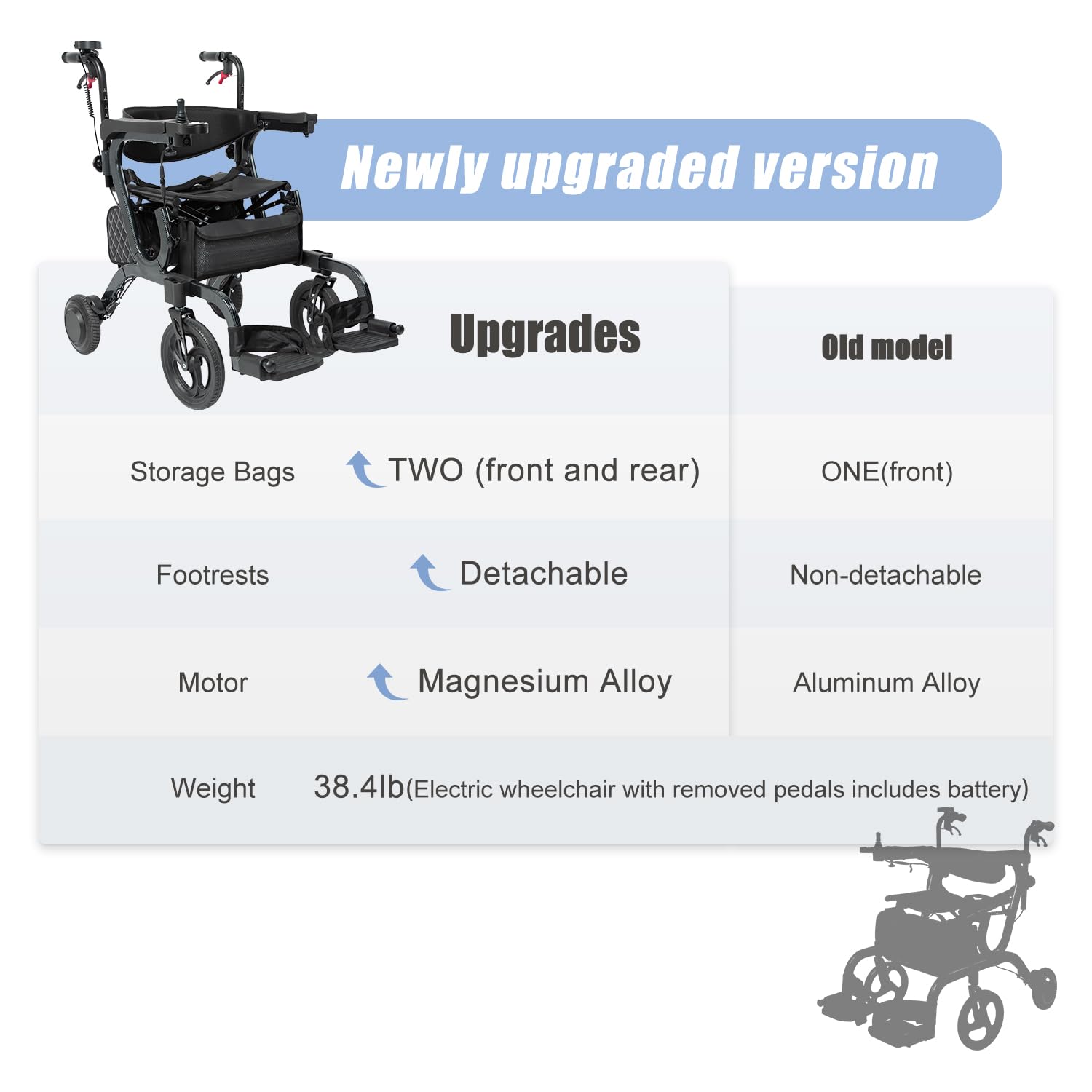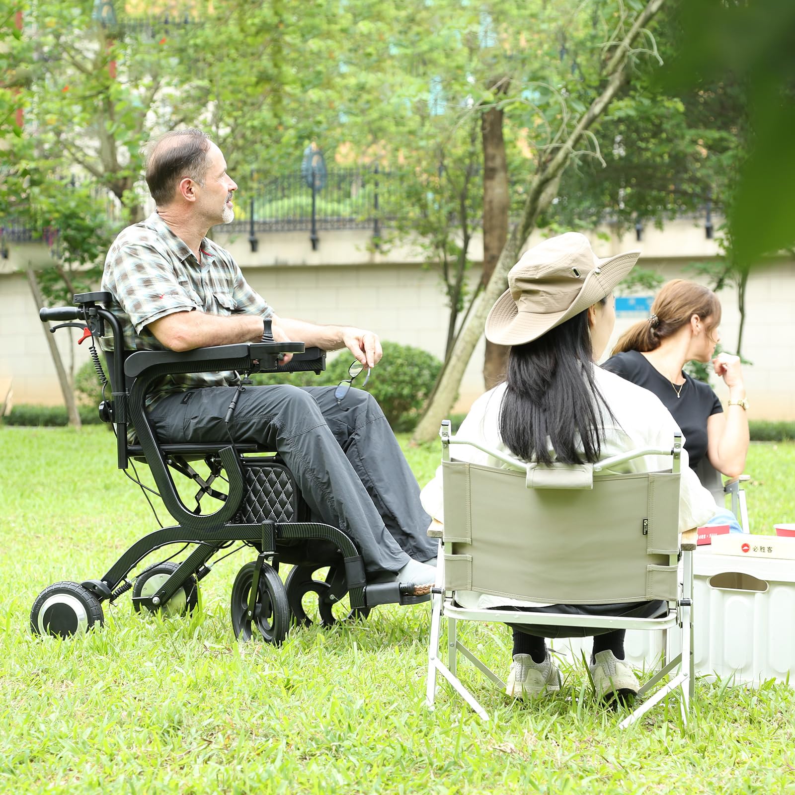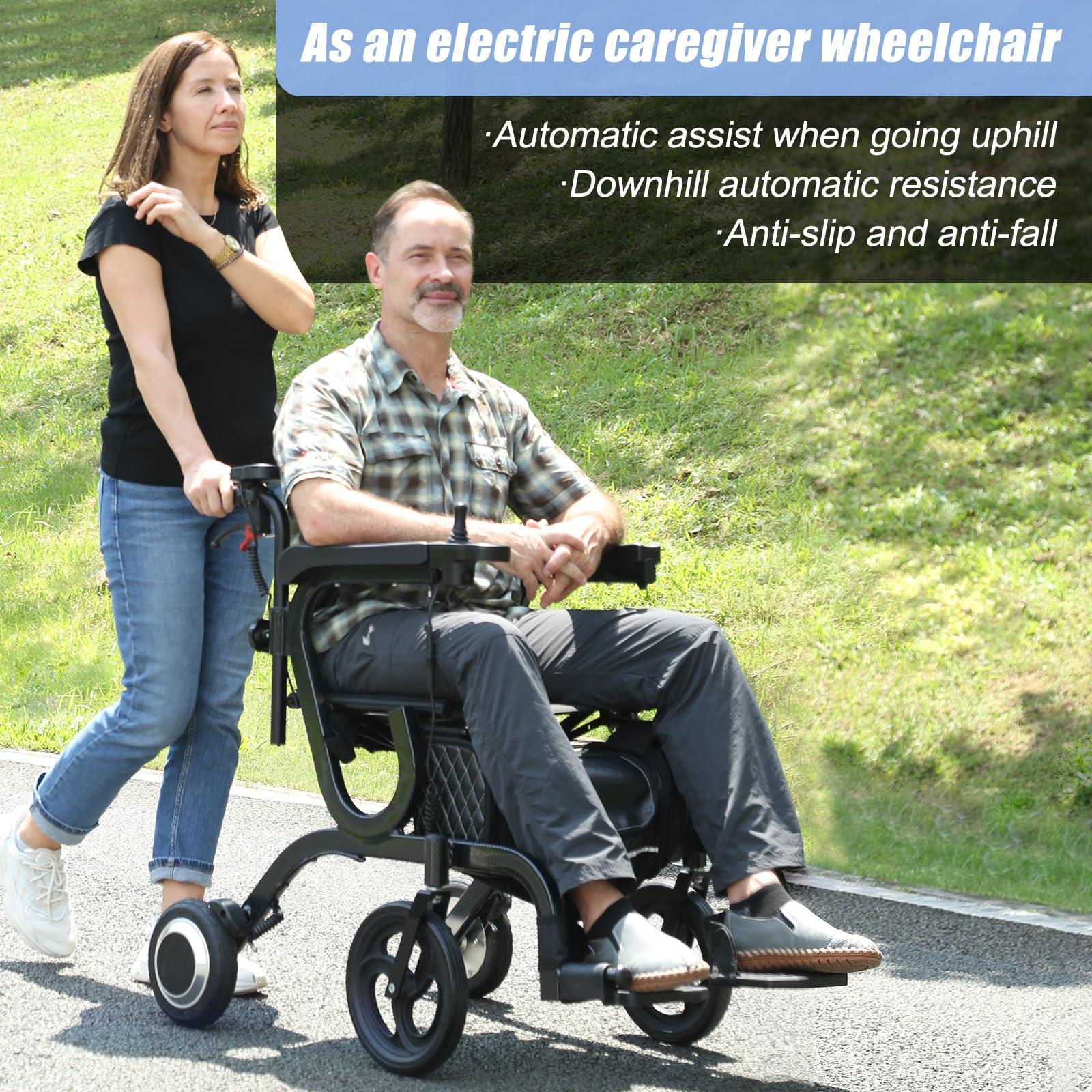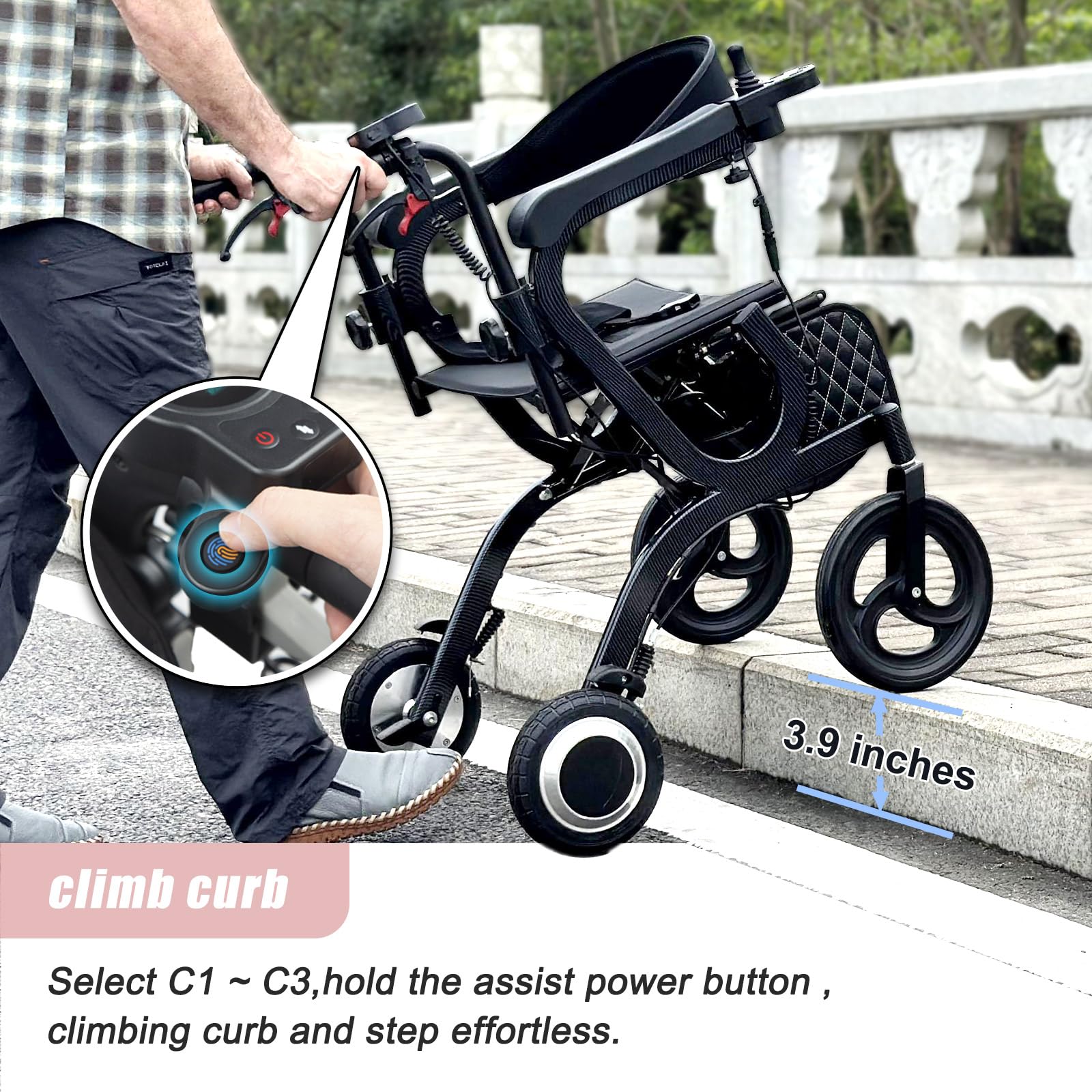 【Three-in-one rollator walker】 Carlike is a multifunctional wheelchair that can be used as an electric wheelchair, arollator walker with seat, and a transport wheelchair. It comes with two controllers for versatile use. It is equipped with two high-performance brushless motors (DC 250W × 2, totaling 500W) and a lithium-ion battery. The 10-inch large wheels provide excellent climbing ability and performance on various terrains. Made from aerospace-grade aluminum alloy, it has a sturdy structure and a maximum load capacity of 265 lbs.