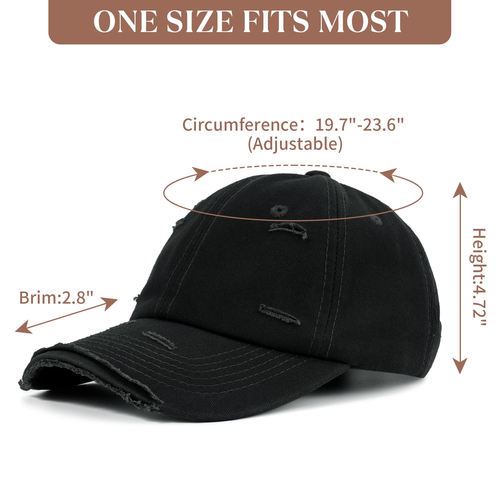 Sun Protection:Stop risking your health and safety by walking outdoors without adequate sun protection. Protect your skin from harmful UV rays and keep your hair out of your face and eyes by wearing this comfortable distressed baseball hat during all your outdoor activities.