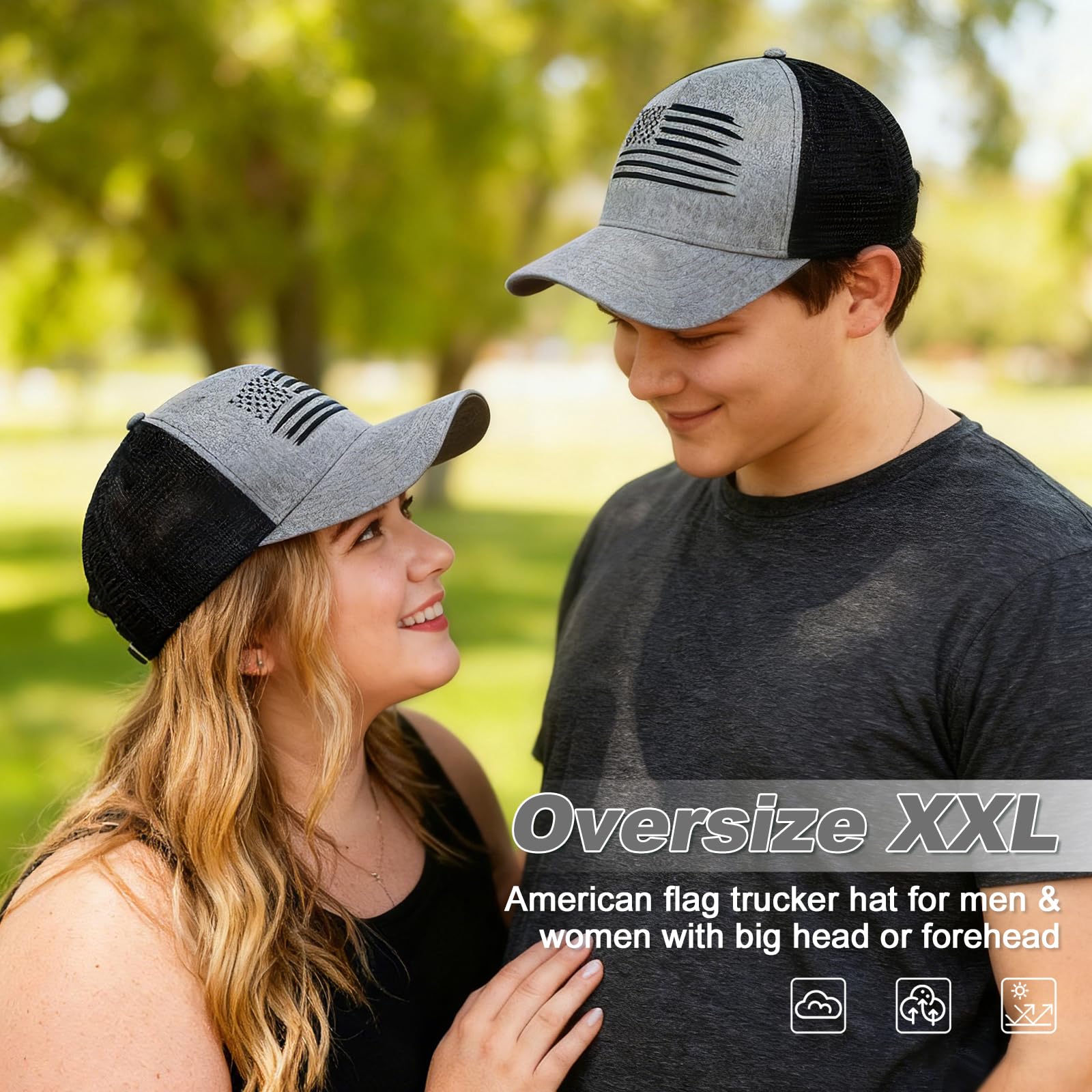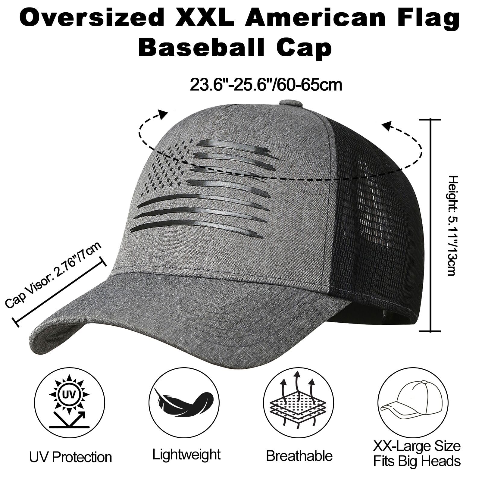 Description Oversized XXL American Flag Baseball Cap – Style, Comfort, and Patriotism Combined Show your American pride with this oversized XXL US flag baseball cap, designed for men and women with big heads or thick hair. Featuring a bold American flag print, this hat is perfect for outdoor enthusiasts, sports fans, or anyone looking to make a patriotic statement. Why Choose This Trucker Hat? Perfect Fit: Adjustable snapback closure ensures a comfortable fit for head sizes 23.6"-25.6". Breathable Design: Mesh back and side panels provide maximum airflow, keeping you cool and dry during outdoor activities like hiking, camping, or fishing. Durable & Fade-Resistant: Made with high-quality cotton twill front panels and rugged polyester mesh, this hat is built to last. UPF 50+ Sun Protection: Offers excellent UV protection, making it ideal for sunny days at the beach, park, or backyard BBQ. 8 Stylish Colors: Available in Black Gray, Light Gray, Green, Black, Blue, Camo, Wine red, and Dark Gray to match any outfit or occasion. Great for Gifting Looking for a unique gift? This American flag baseball cap is a thoughtful present for friends, family, or colleagues. Whether it’s for a birthday, Father’s Day, or a patriotic holiday, this hat is sure to impress. Package Includes:1 x Oversized XXL American Flag Trucker Hat Wear Your Pride, Stay Comfortable, and Stand Out with This Stylish and Functional Baseball Cap!